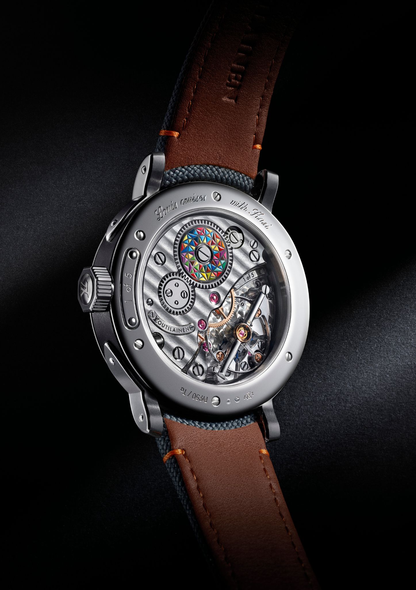 Cả Louis Vuitton và xưởng Voutilainen đều khởi đầu hành trình chinh phục thế giới chế tác đồng hồ vào năm 2002. Thành quả của sự hợp tác này, LVKV-02 GMR 6 là tinh hoa thủ công từ xưởng Voutilainen và kỹ nghệ chế tác xuất sắc Louis Vuitton hòa hợp.