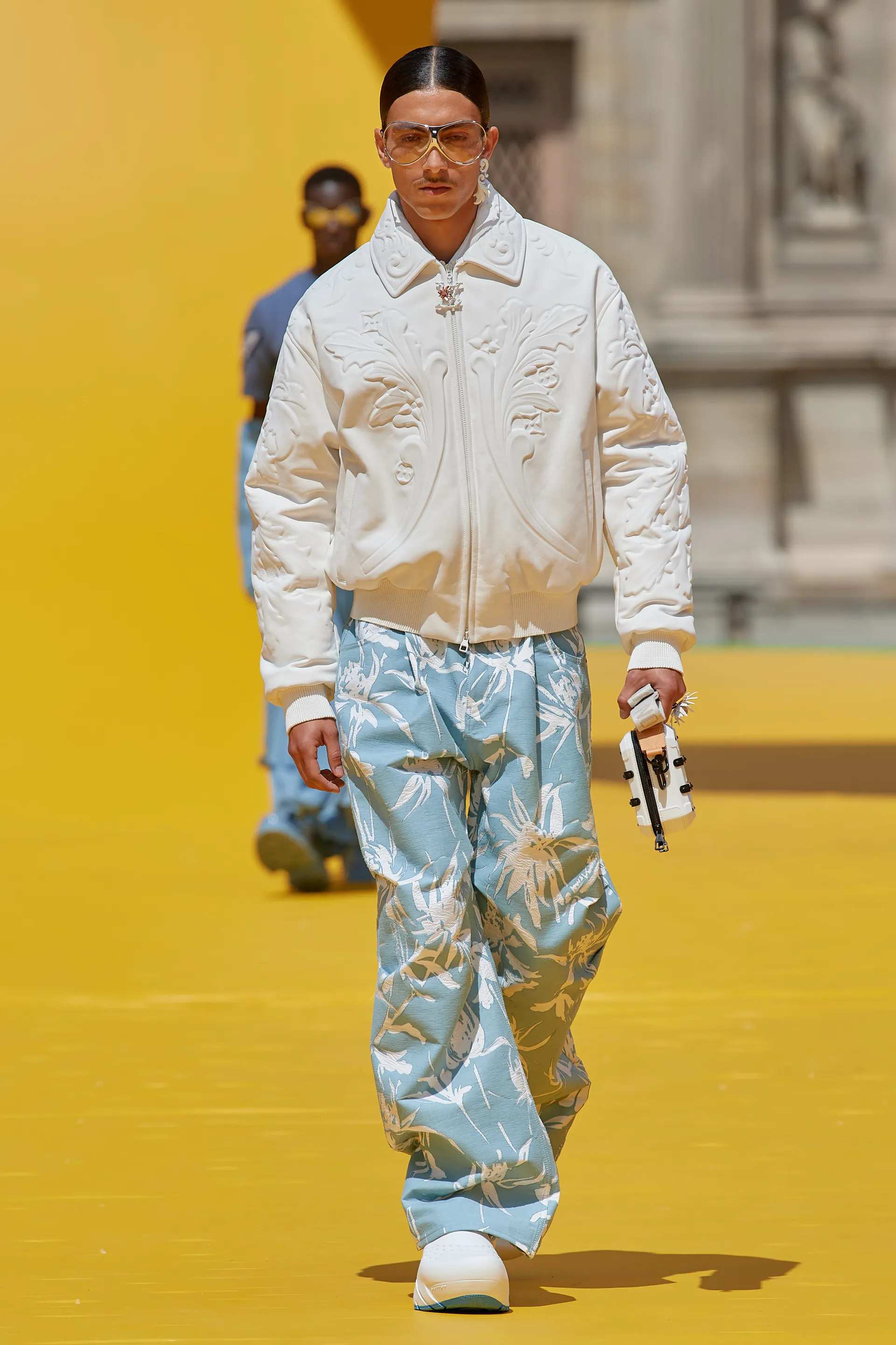 Tình yêu thiên nhiên, hoa cỏ của Virgil được phản ánh trực tiếp ở các họa tiết, nhất là cánh đồng hoa lung linh được thêu trên những bộ suit ở cuối show diễn ở phần cuối. Cuối show diễn, LV tôn vinh sự sáng tạo của nhà thiết kế quá cố bằng bộ suit xanh lá kết hợp cùng chiếc váy xẻ tà in hình cánh đồng anh túc trong bộ sưu tập đầu tay của anh ấy vào năm 2018, lấy cảm hứng từ "The Wizard of Oz." Show diễn còn chinh phục những cái gật gù của người xem với những dấu ấn gợi nhớ về những năm tháng mà Virgil từng là vận động viên trượt băng vào thập niên 90 như đôi giày đi tuyết LV trainer cũng như cách tiếp cận giới tính vô cùng hiện đại ở dòng thời trang nam với những tùng váy bồng bềnh. Bản phối hòa hợp giữa nét bụi bặm đường phố và sự sang trọng từ high fashion vẫn mang âm hưởng sâu sắc và thể hiện rõ trong các BST menswear của LV dù người dẫn dắt không còn nữa chẳng hạn như những chiếc quần denim ống rộng, đáy thụng, những đôi giày sneaker cá tính, những chiếc bomber jacket đậm tinh thần thể thao đường phố hay những miếng denim bụi bặm được in dãy monogram LV sang trọng.