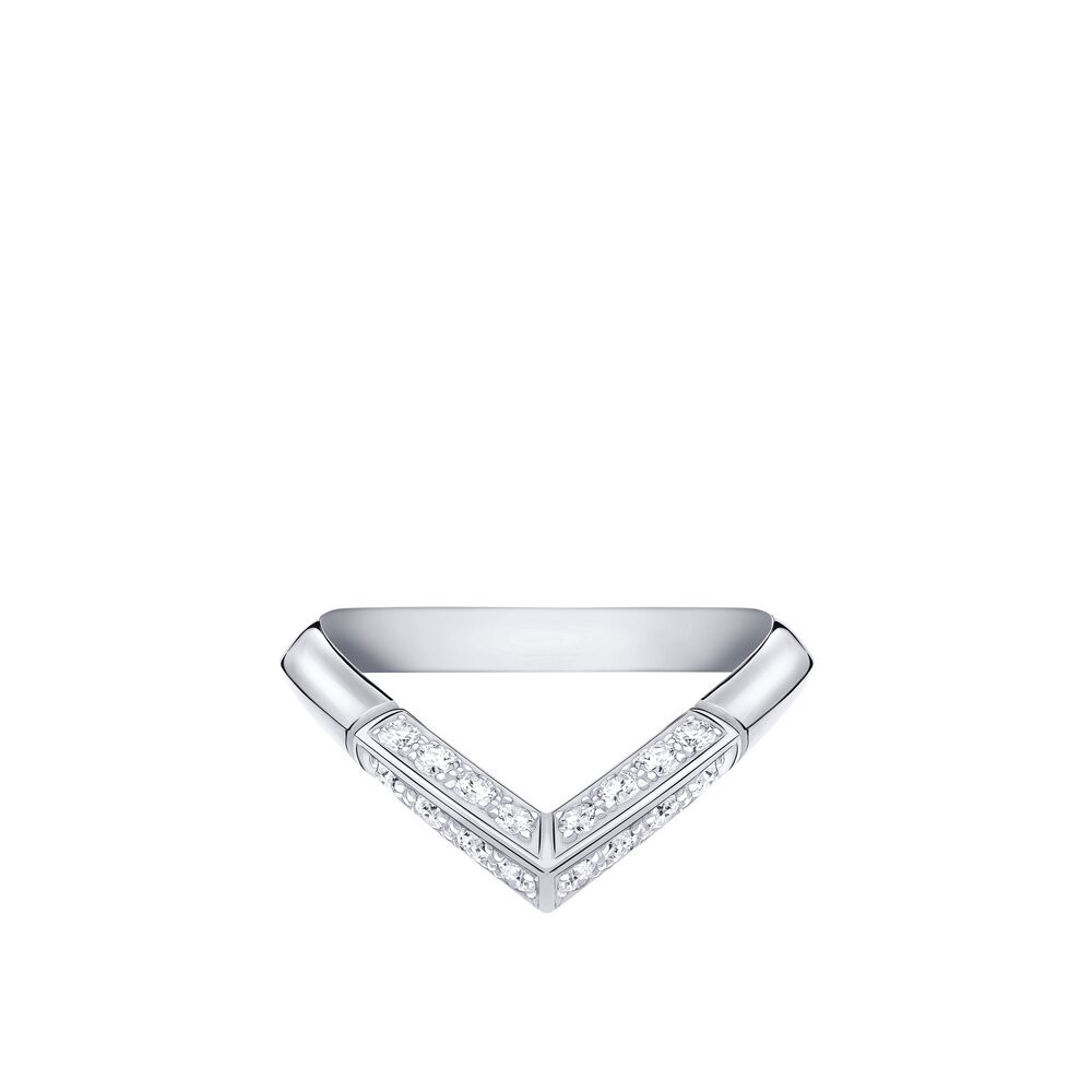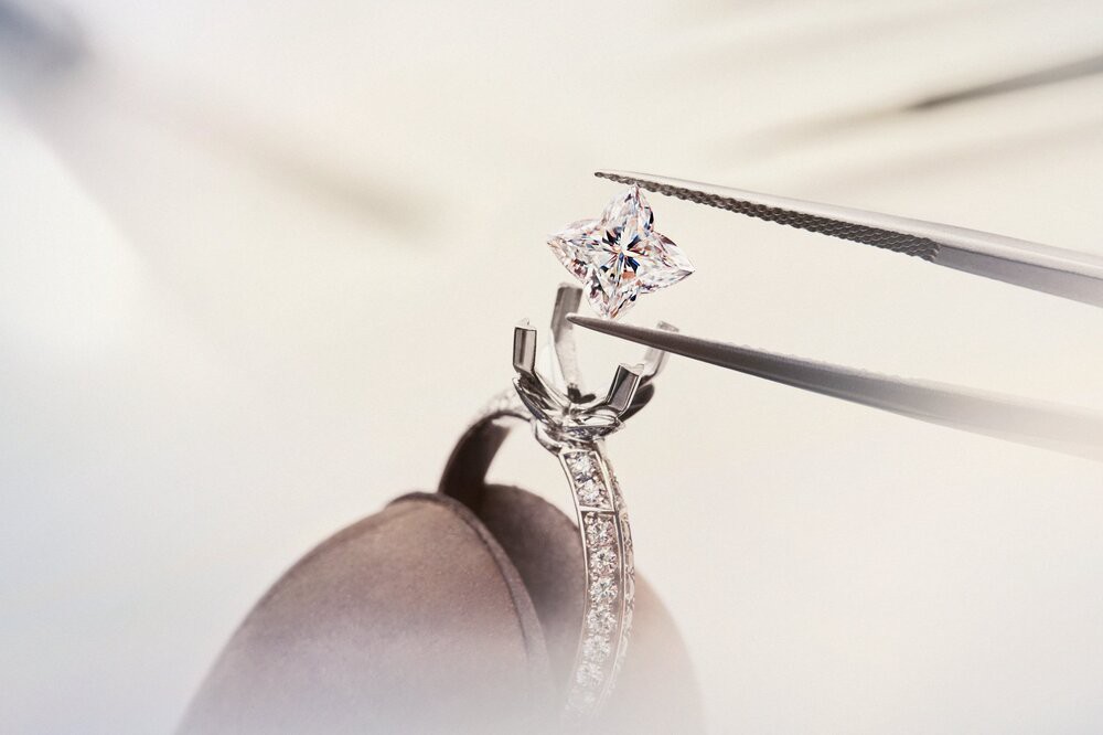 Đỉnh cao chế tác nằm ở chi tiết móng ngậm chữ V, ôm trọn từng đường cong và các cạnh sắc của viên kim cương, biến hoa văn Monogram thành biểu tượng sống động trên bề mặt.