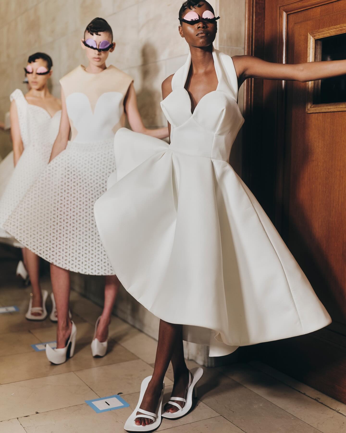 Ở bộ sưu tập trước, Marc Jacobs Spring 2024, nhà thiết kế mời chúng ta đến một ngôi nhà búp bê, khi trang trí sàn diễn bằng những bộ bàn ghế khổng lồ, khiến người mẫu lẫn khách mời trở nên nhỏ bé như người dân ở xứ sở tí hon. Nhưng ở phần hai của bộ sưu tập đó, Marc Jacobs Fall 2024 được đảo ngược tỉ lệ. Sải bước dọc hành lang dài và hẹp không tưởng của Thư viện Công cộng New York, dàn người mẫu của Marc Jacobs bỗng cao, to bất ngờ trở thành người khổng lồ nhờ vào các chiếc váy siêu ngắn; trong khi đó, những chiếc váy dài đến đầu gối bị lật ngược tà hoặc xiên vẹo bằng những đường viền hình vòng cung vui nhộn và cả những bộ trang phục có vẻ gần như quá rộng. Với hình dạng kỳ lạ, màu sắc rực rỡ và đôi giày điên rồ, bộ sưu tập lần này không chỉ có quần áo; mà còn tạo ra một thế giới nơi những điều phi thường trở thành chuẩn mực.