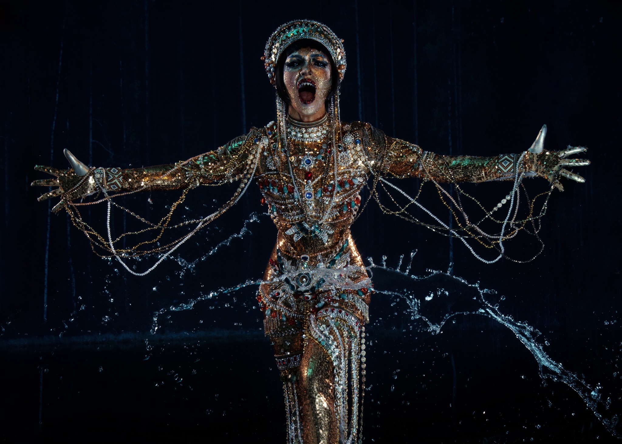 Tỏa sáng đêm Halloween với bộ trang phục ánh kim đầy mê hoặc từ phần cuối show diễn. Như một nữ thần biển cả từ vương quốc bóng tối, bộ trang phục này có thể không dễ tái hiện hoàn hảo, nhưng bạn có thể tạo hiệu ứng tương tự với chất liệu ánh bạc bắt mắt. Kết hợp cùng kiểu tóc ướt nàng tiên cá từng gây bão, diện mạo này chắc chắn sẽ giúp bạn nổi bật với vẻ đẹp kiêu sa, huyền bí.