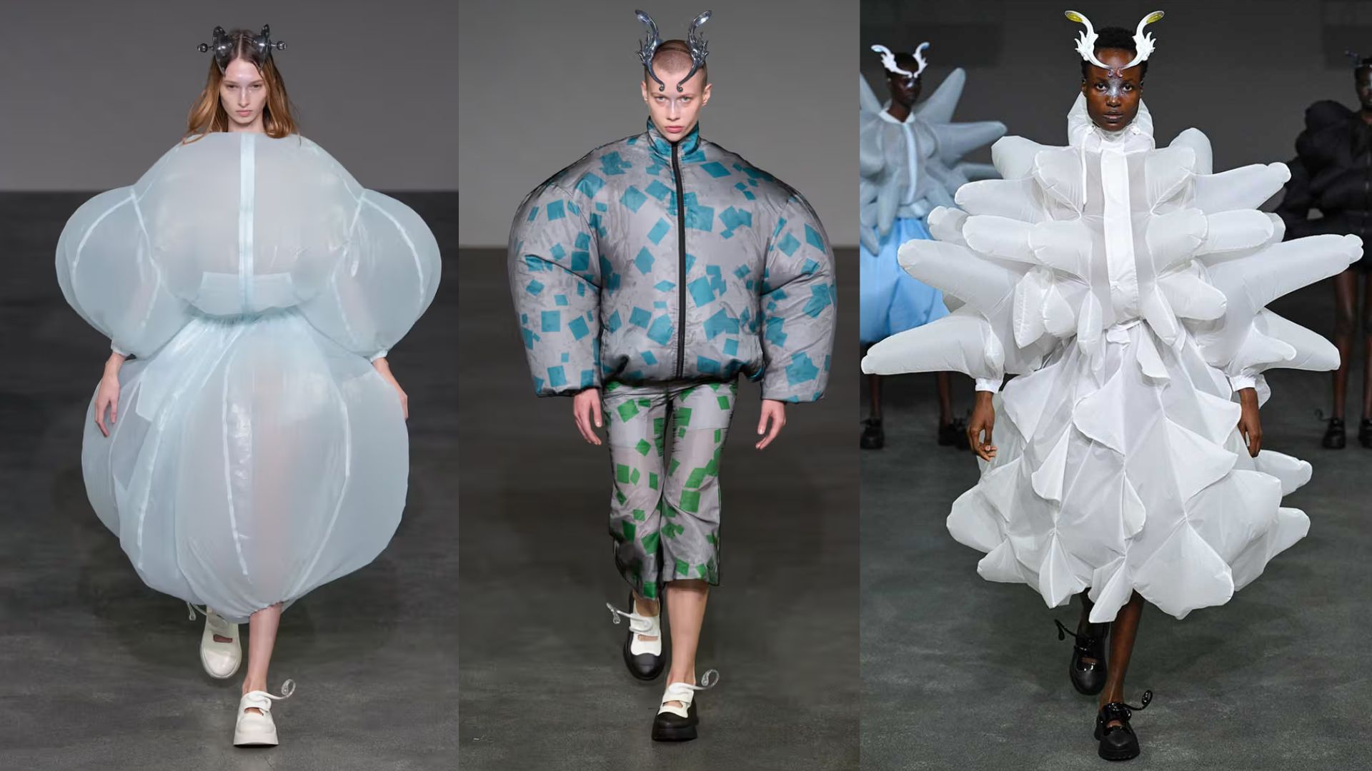 Hãy đưa trang phục hóa trang Halloween của bạn ra ngoài Trái Đất, lơ lửng trong không gian với phong cách đến từ Anrealage. Bắt đầu với chiếc áo phao quá khổ hoặc bất kỳ chiếc áo nào xốp và phồng, càng kỳ dị càng tốt, kết hợp cùng giày thể thao năng động và cài tóc siêu thực. Trang điểm tập trung vào đôi mắt với màu sắc nổi bật và nhũ lấp lánh theo phong cách Y2K để hoàn thiện vẻ ngoài “đại sứ không gian”.