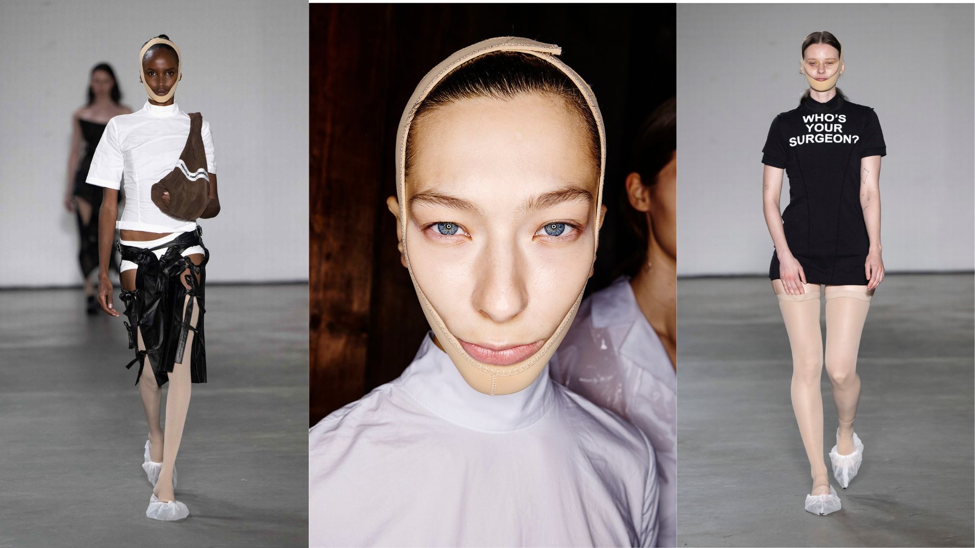 Show diễn Xuân Hè 2025 của Natasha Zinko khéo léo khai thác chủ đề phẫu thuật thẩm mỹ, làm nổi bật những hệ lụy của việc “làm đẹp” quá đà, tạo nên một góc nhìn châm biếm về vẻ đẹp hiện đại. Bộ sưu tập táo bạo này là nguồn cảm hứng tuyệt vời cho đêm Halloween. Điển hình là chiếc áo "Who’s your surgeon?" kết hợp cùng tất đùi màu nude và băng quấn mặt, mang đến một diện mạo vừa đáng nhớ vừa rùng rợn.