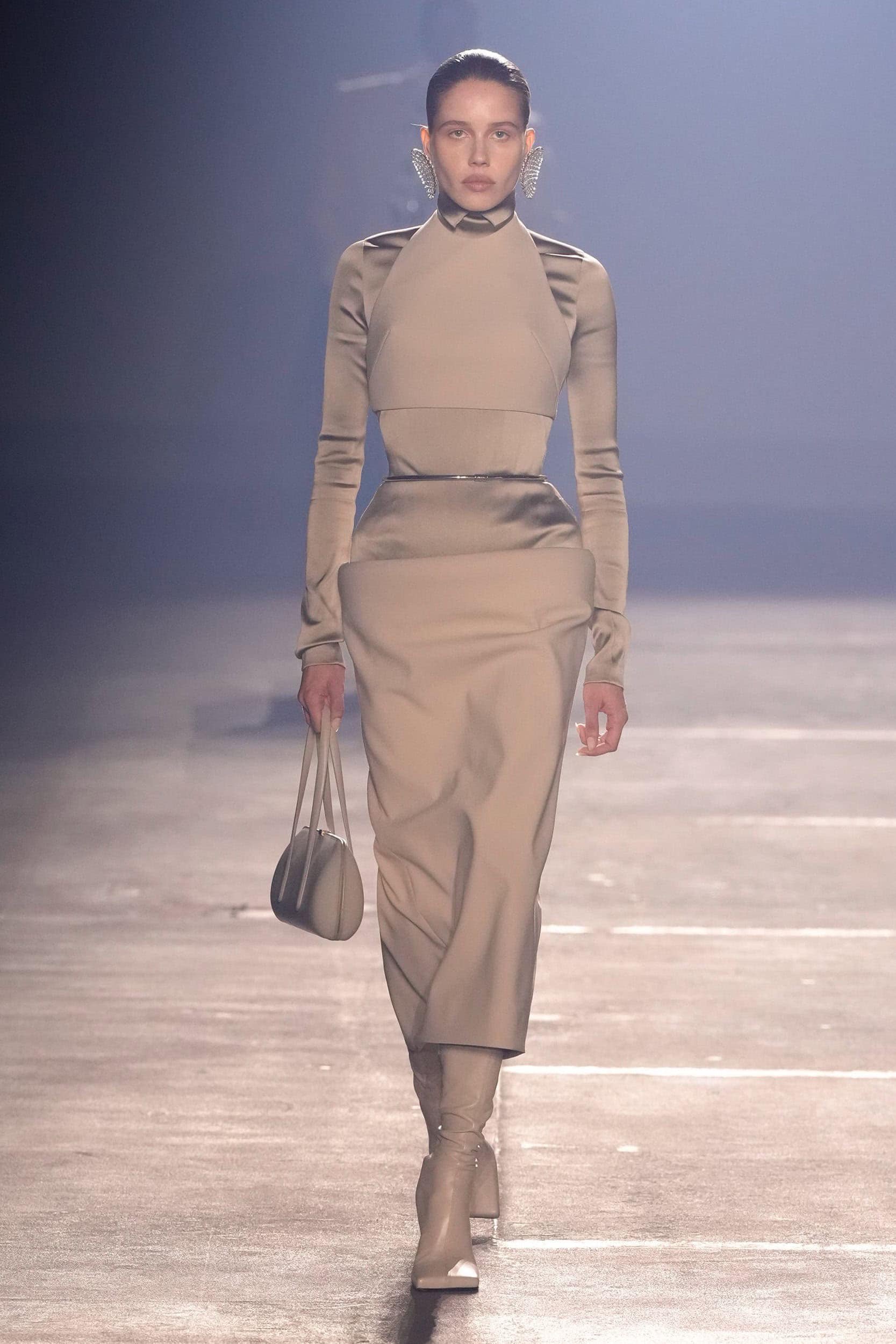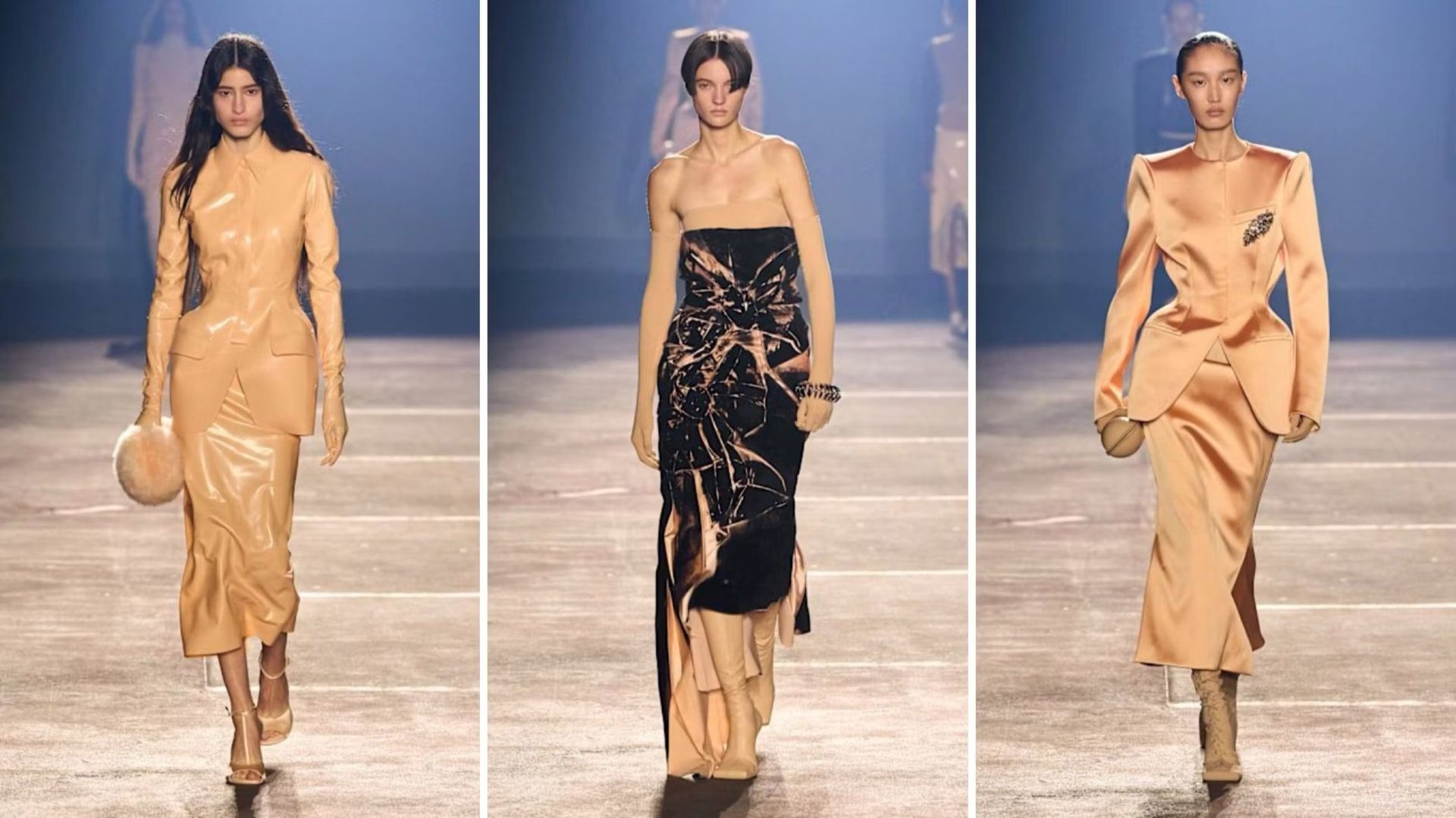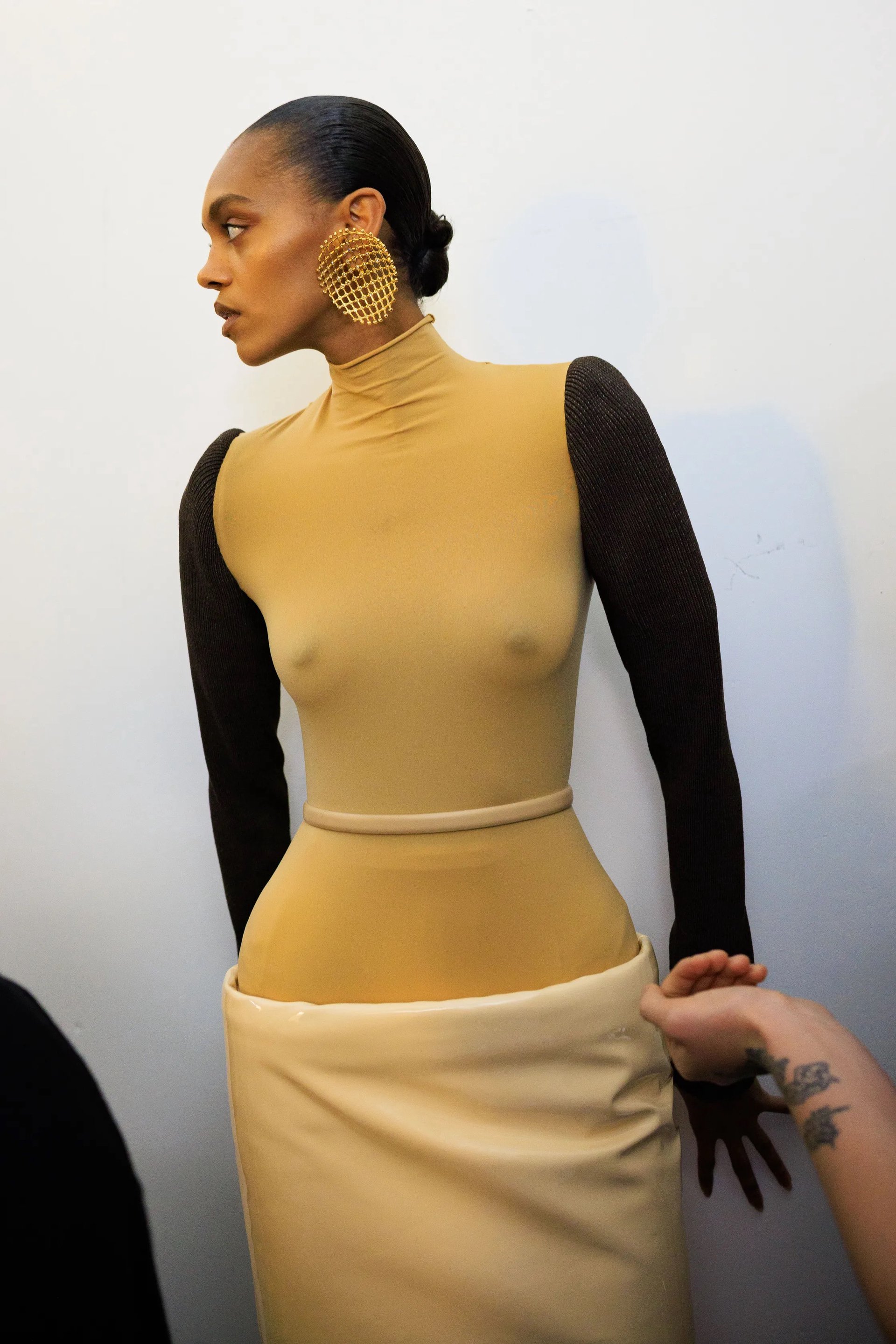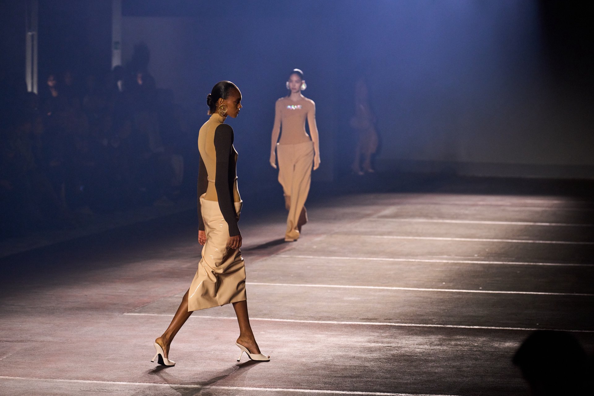 Di sản Mugler chính là điểm xuất phát. Thập niên 80–90, Thierry Mugler từng biến phom dáng đồng hồ cát thành biểu tượng, cùng ám ảnh với quyền lực nữ giới và vẻ đẹp kịch tính. Freitas giữ lại cấu trúc căn bản đó – vòng eo siết chặt, vai ngang gọn ghẽ, những đường cắt phơi bày cơ thể như khối điêu khắc. Thay vào đó, ông đưa sự tiết chế vào trong, để khán giả có thể nhìn rõ đường nét và logic thiết kế thay vì chỉ choáng ngợp bởi spectacle.