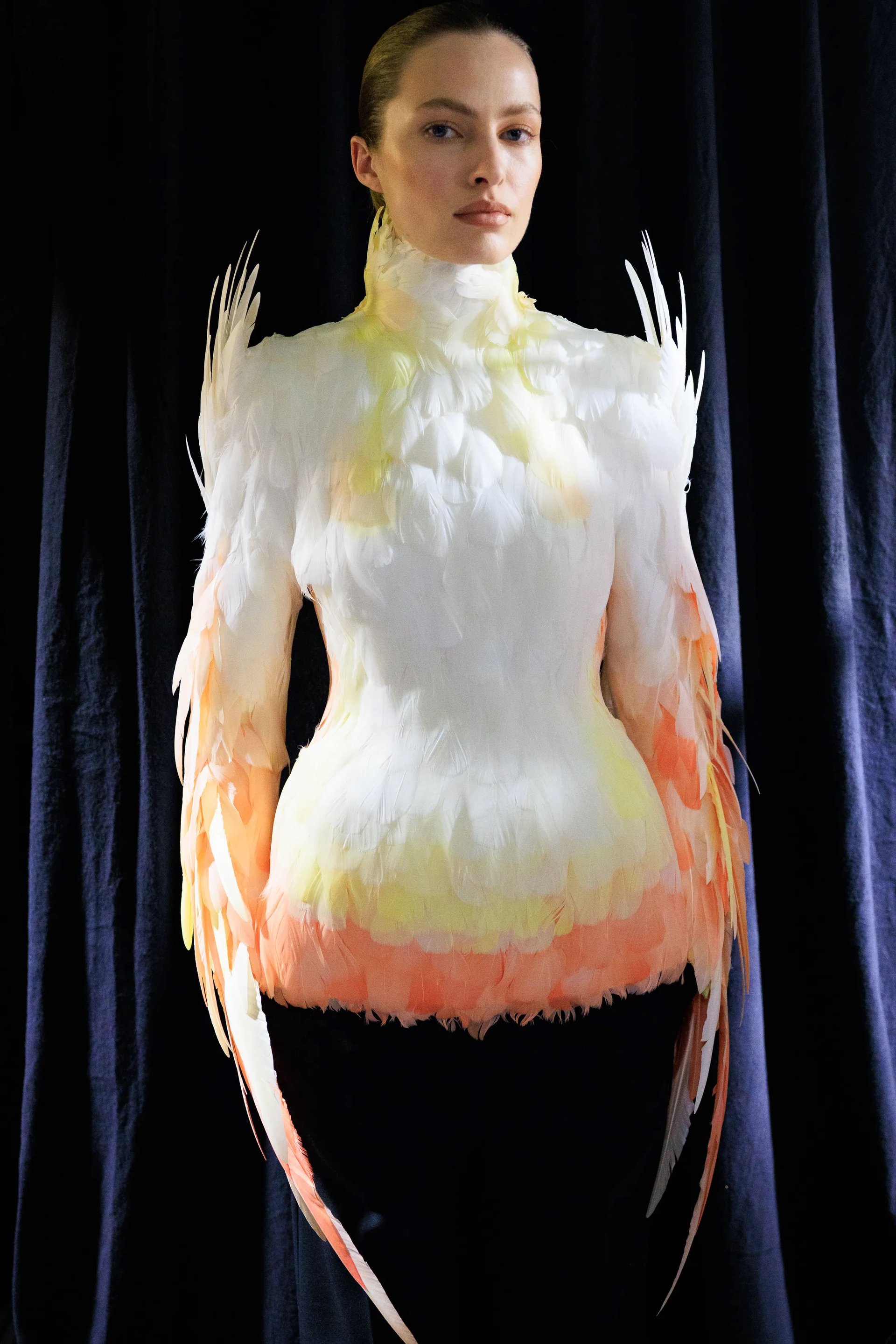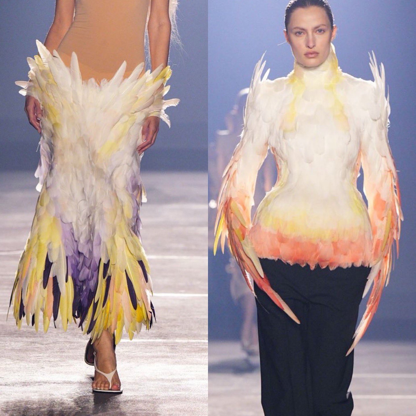 Lông vũ cầu vồng, tua rua, sequin và kim loại xuất hiện như những điểm nhấn nhảy múa trong ánh sáng. Chắc hẳn ai ai cũng nhớ về “La Chimère” của di sản thu đông năm 97-98, nhưng đã rủ bỏ bớt tính trình diễn để phù hợp hơn với thị trường đòi hỏi tính nghệ thuật trong thương mại. Kim loại và khoá cài tiếp tục làm trọn vẹn motif retro-futuristic, thế giới nơi cơ thể gần như cơ học, cyborg, nhưng vẫn sống động và nữ tính.