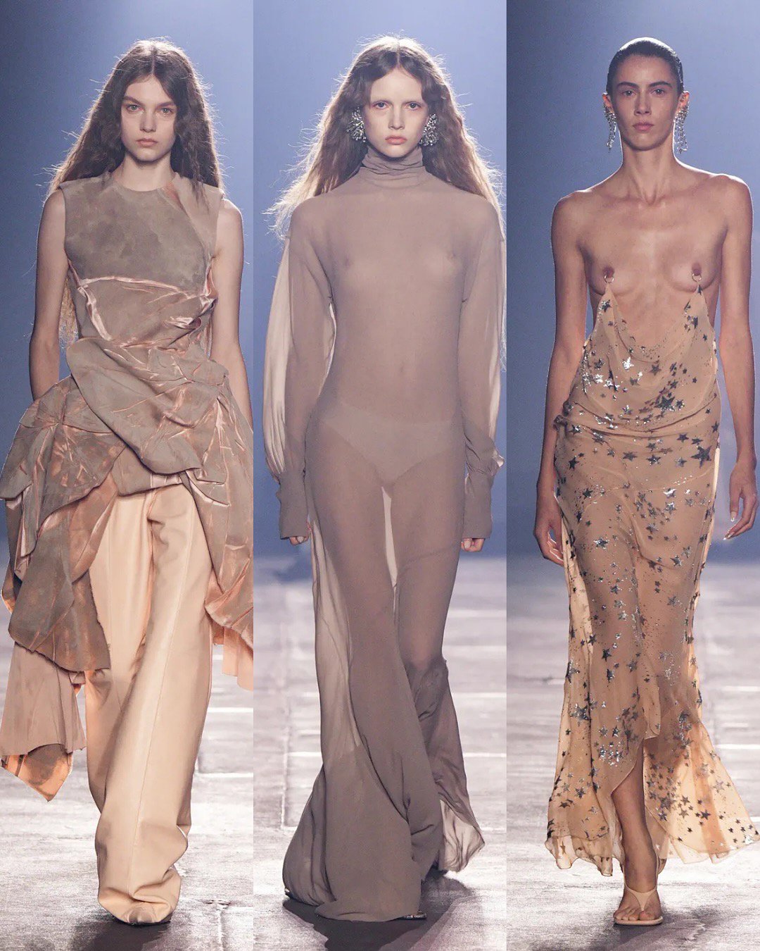 Đối lập với những bề mặt cứng ấy, lụa mềm và voile trong suốt tạo ra lớp không gian khác, nơi cơ thể vừa được che đậy vừa được gợi ý. Chúng lướt trên da như ánh sáng tinh tế trong cảnh quay chậm, làm dịu đi sự sắc lạnh của PVC và latex, đồng thời mang đến nhịp điệu mềm mại cho sàn diễn vốn tràn ngập sức mạnh kiến trúc của silhouette đồng hồ cát. Từng bước chân của người mẫu khiến voan và lụa chuyển động, tạo ra những lớp “không gian thở” giữa những hình khối cứng nhắc.