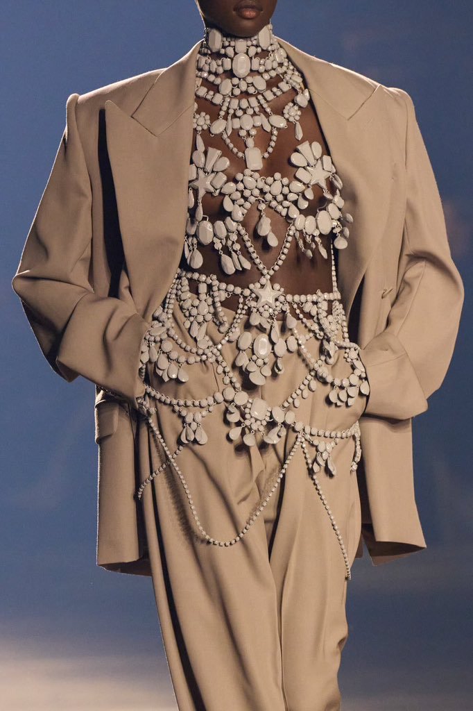 Cách sử dụng màu sắc của Freitas kể câu chuyện về Mugler đang hồi sinh. Một Mugler đang cho phép cuộc sống dễ tiếp cận hơn, vẫn kiêu kỳ trên đường runway và hô vang di sản theatrical (kịch nghệ) của nhà mốt. Vừa kiểm soát nhịp điệu di sản, nhưng cũng giải phóng khỏi uy danh cứng nhắc, Freitas phần nào đó nhắc nhở chúng ta về niềm vui của những thứ lấp lánh trong một Mugler quyền lực nhưng đã gần gũi hơn với thực tại cuộc sống.