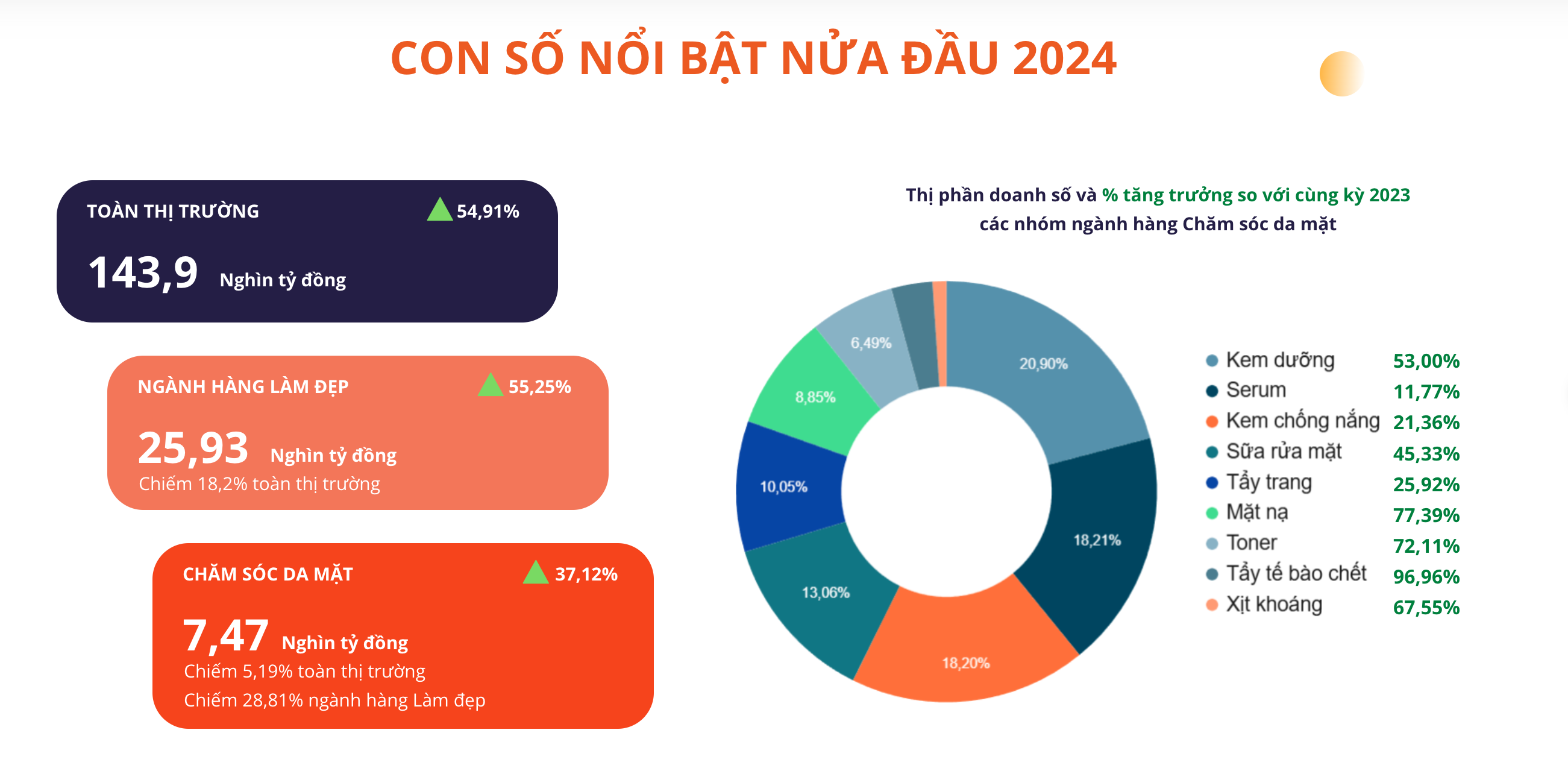 Bất chấp suy thoái đang diễn ra trên phạm vi toàn cầu, trong 6 tháng đầu năm 2024, doanh số trong nửa đầu năm 2024 trên 5 sàn thương mại điện tử Shopee, Lazada, Sendo, Tiki và Tiktok Shop của ngành hàng làm đẹp đã đạt 26 nghìn tỉ đồng, tăng hơn một nửa so với cùng kì năm ngoái.