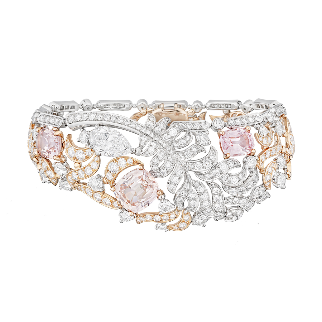 Từ sắc trắng thuần khiết đến những gam hồng đầy biến hóa, bảng màu đá quý mang đến vẻ đẹp nữ tính và dịu dàng cho “PLUME DE CHANEL”. Mỗi viên đá được tuyển chọn để điểm tô cho từng chiếc lông vũ, tạo nên vẻ thanh thoát và nhẹ nhàng khó cưỡng. Kim cương để tăng độ lấp lánh, trong khi sắc hồng mềm mại của sapphire và tourmaline làm tăng chiều sâu và sự quyến rũ. Các sắc thái hồng, từ tinh tế nhẹ nhàng đến rực rỡ đậm nét, không chỉ làm nổi bật sự mềm mại mà còn tôn lên chuyển động uyển chuyển của lông vũ.