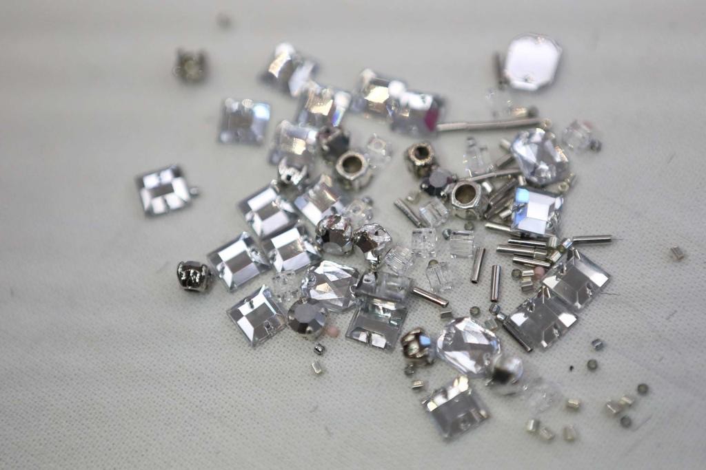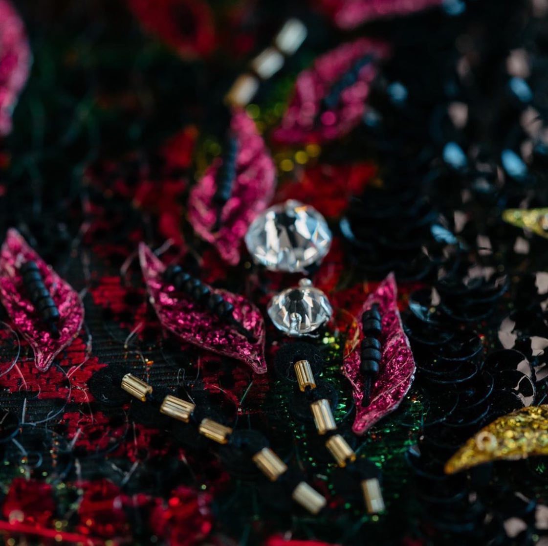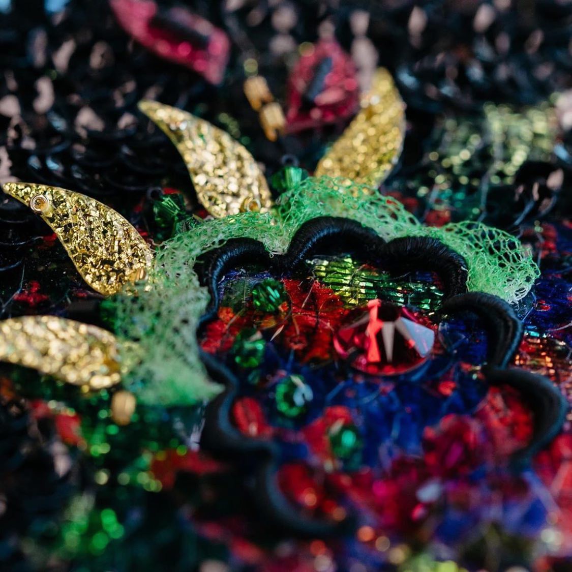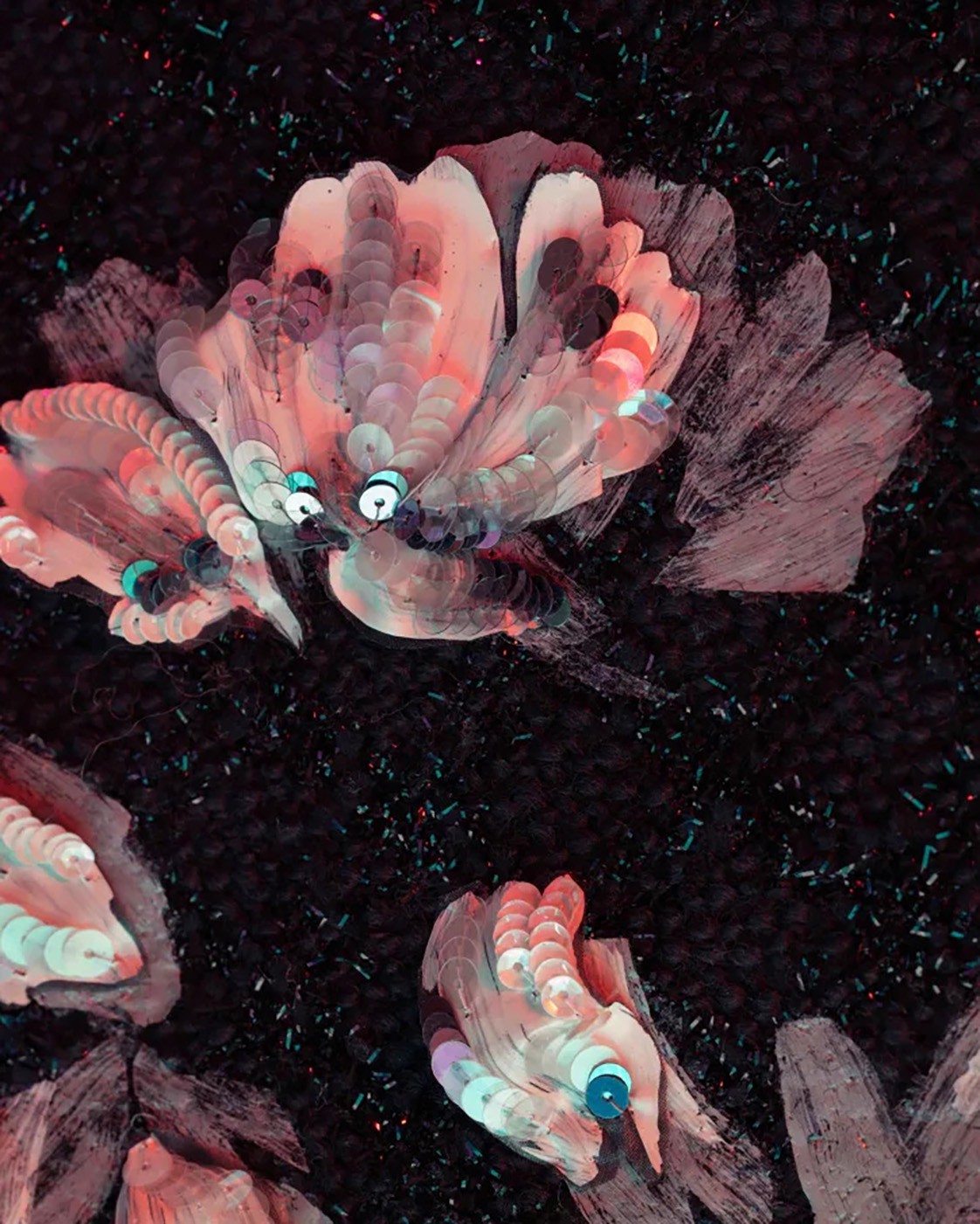 Xen vào đó là sự liều lĩnh đậm ngôn ngữ đương đại: sequin hình học, mảnh kim loại nhỏ, sợi công nghiệp trong suốt – tất cả được phối hợp để tạo thành những bề mặt thêu có cấu trúc, gồ ghề, phản xạ ánh sáng theo cách liên tục thay đổi khi người mẫu bước đi.