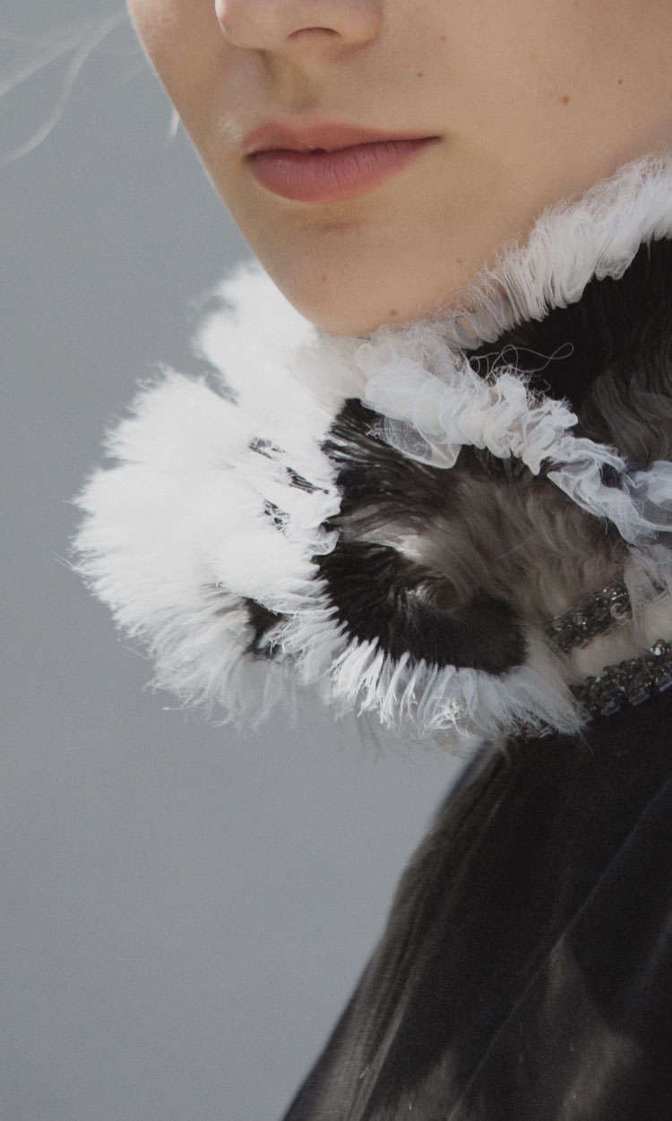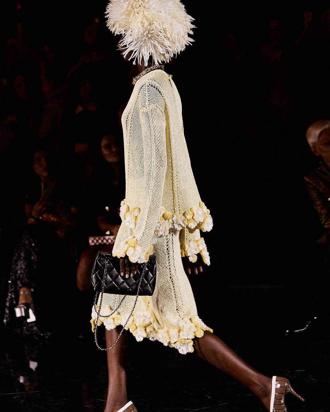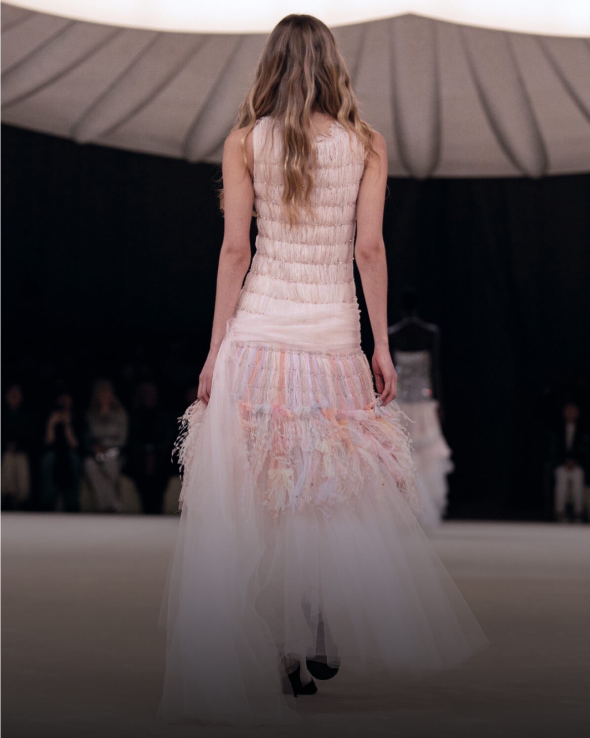 Show diễn lần này đồng thời mang dấu ấn của Le 19M – mái nhà chung của các Maison thủ công: từ những đường thêu tinh vi của Lesage và Montex, những cánh hoa vải của Lemarié, đến nghệ thuật làm mũ, làm giày, chế tác kim loại và chất liệu.