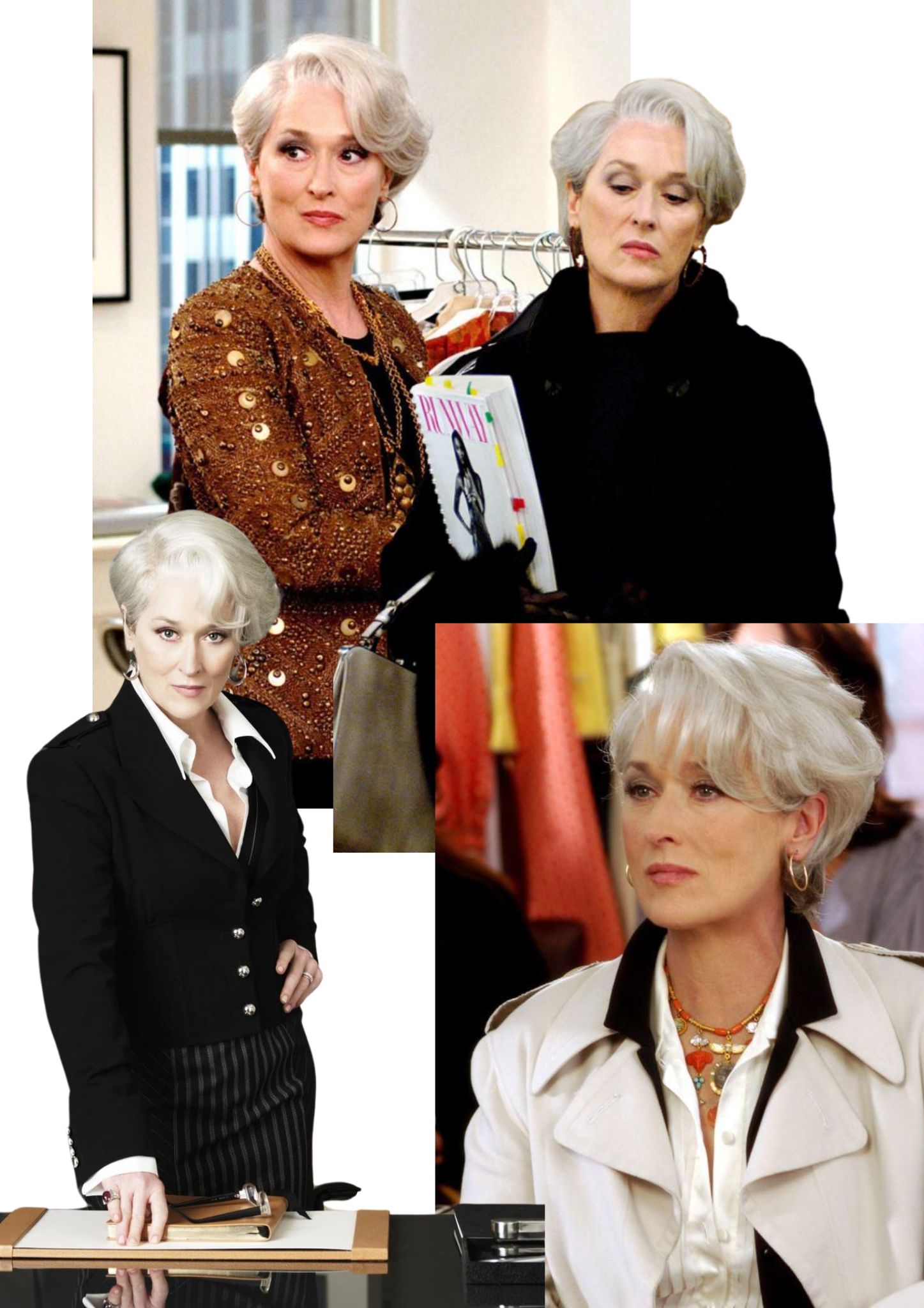 Diện mạo của Miranda Priestly là minh chứng hoàn hảo cho quyền lực tuyệt đối. Qua từng bộ váy thanh lịch Chanel, những chiếc áo khoác lông xa hoa, hay đôi giày cao gót đanh thép, là lựa chọn được tính toán kỹ lưỡng. Một trong những khoảnh khắc đắt giá nhất là khi bà bước vào văn phòng, tháo chiếc áo khoác lông trắng và thản nhiên ném nó lên bàn, hành động nhỏ nhưng toát lên quyền lực tuyệt đối.