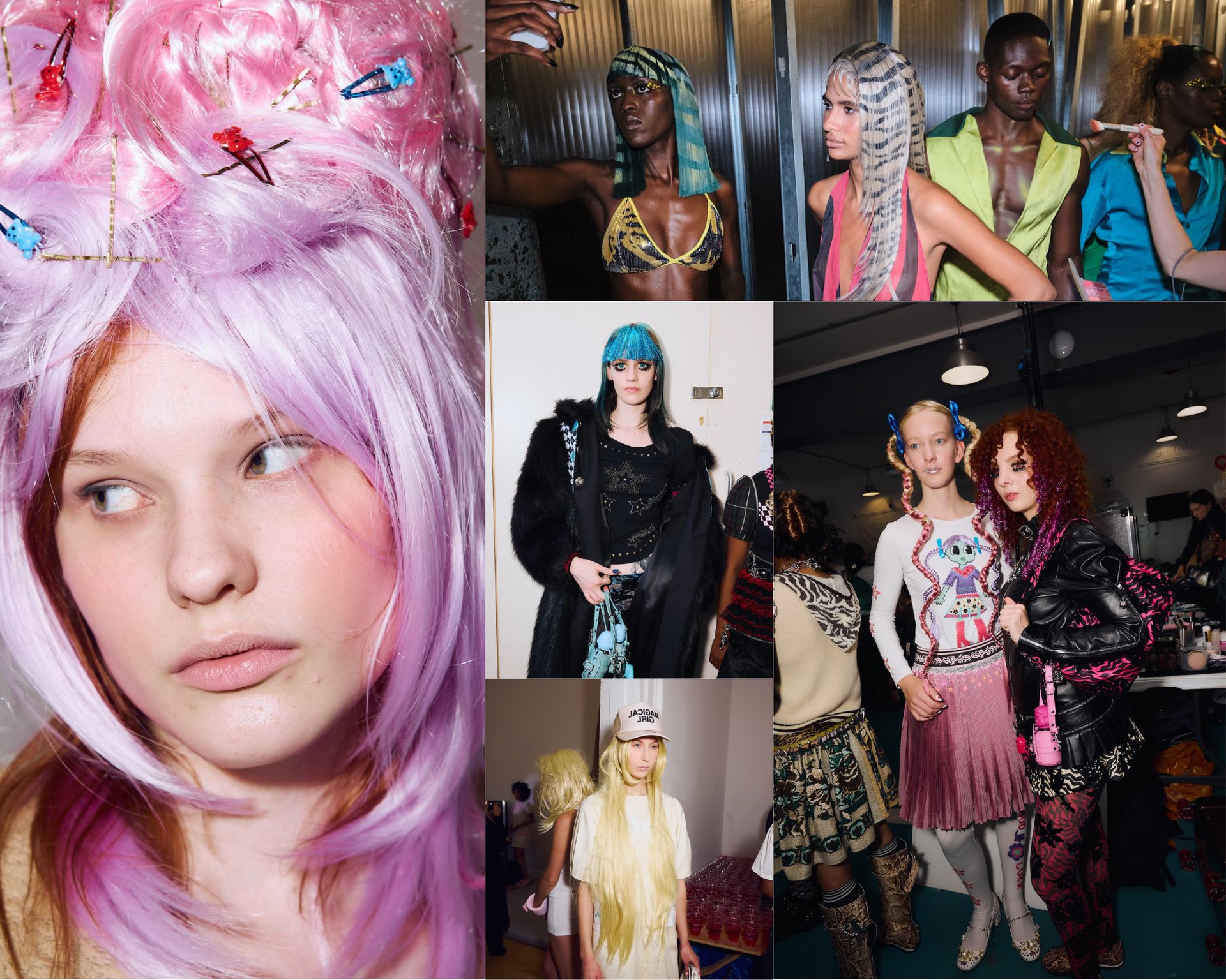Tương tự như hàng mi, mái tóc cũng trở thành chất liệu sáng tạo đầy màu sắc tại các sàn diễn Xuân Hè 2026. Theophilio mang đến những bộ tóc giả mơ màng với họa tiết vẽ tay tinh xảo, trong khi Chopova Lowena và Ashley Williams lại khuấy động runway bằng tóc nối kim tuyến và các mảng màu neon nổi bật. Dù bản thân các bộ sưu tập đã ngập tràn sắc màu thì những kiểu tóc phá cách này càng khiến diện mạo tổng thể thêm phần ấn tượng, thể hiện tinh thần vui tươi và táo bạo đặc trưng của mùa thời trang năm nay.