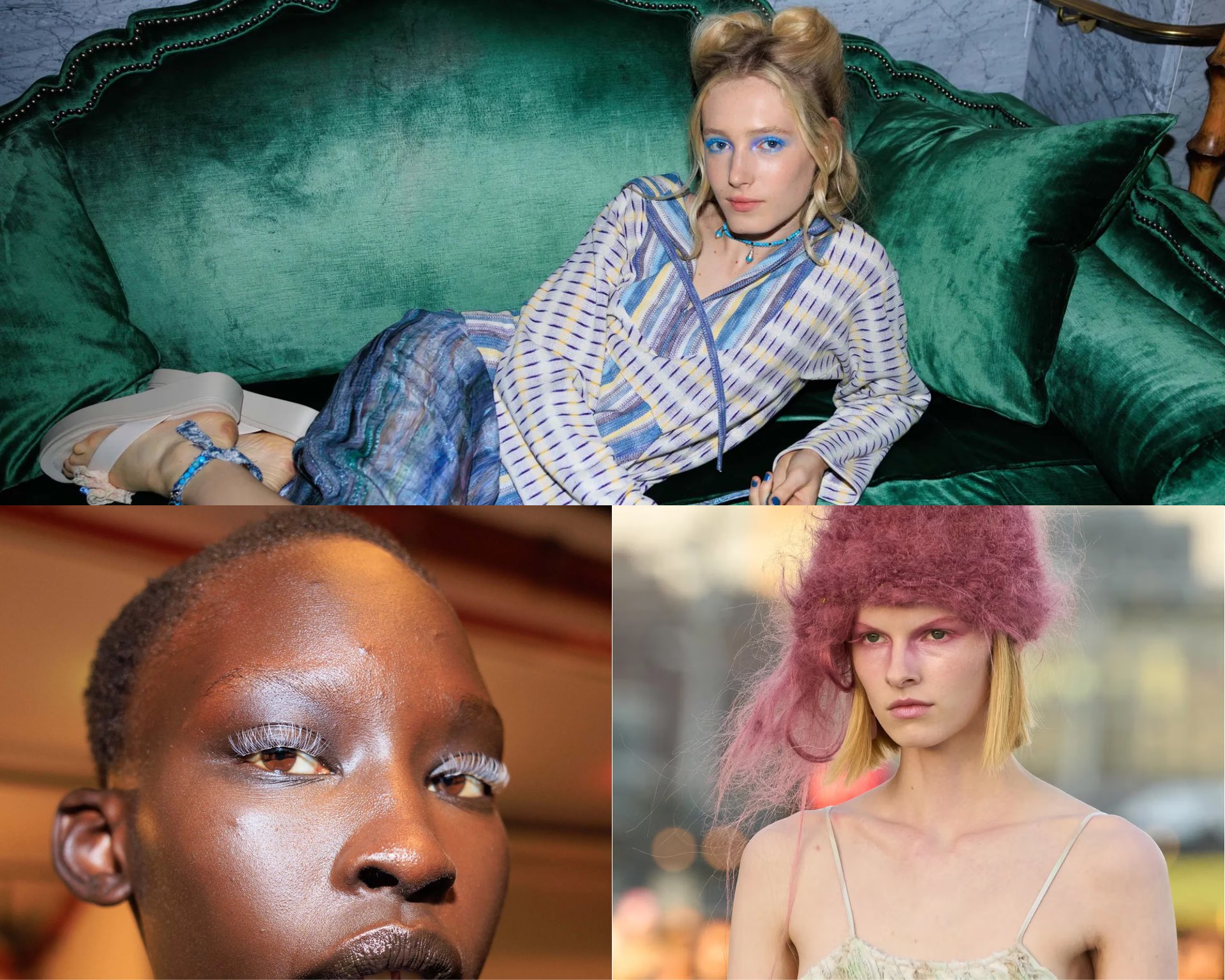 Tại Anna Sui, Eckhaus Latta và Collina Strada, hầu như “không có chỗ” cho lông mi màu tự nhiên. Tận dụng cả mi nối Lashify (được thiết kế riêng bởi Isamaya Ffrench) và mascara màu, các thương hiệu đã sử dụng lông mi để biến đôi mắt thành bảng màu nghệ thuật. Trong khi Anna Sui và Collina Strada thiên về tông màu sáng, nổi bật thì Eckhaus Latta tạo sự đối lập tinh tế khi sử dụng lông mi trắng để tôn lên vẻ ngoài dịu dàng, tươi tắn.