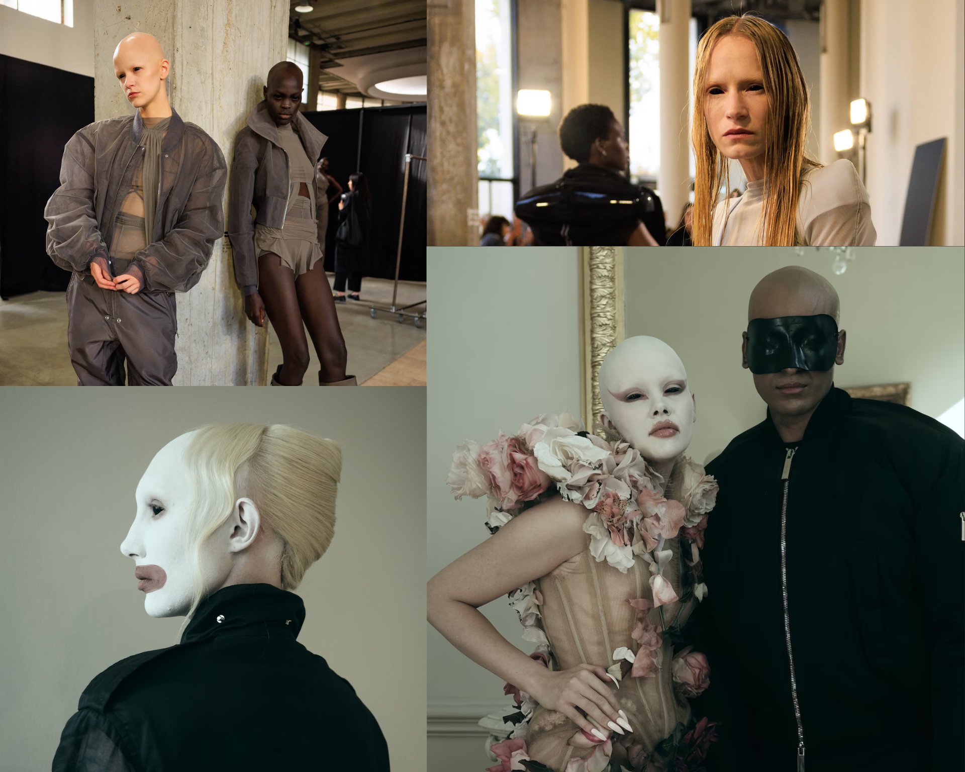 Cả Rick Owens và Matières Fécales đều sử dụng kính áp tròng đen tuyền trong bộ sưu tập Xuân Hè 2026 để tạo hiệu ứng ánh nhìn siêu thực. Trong khi người mẫu của Matières Fécales sải bước với lớp sơn trắng đặc trưng trên khuôn mặt cùng phấn mắt vẽ hình cánh, Rick Owens lại chọn phong cách lông mày tẩy trắng kết hợp với kiểu trang điểm mắt khói đầy bí ẩn.
