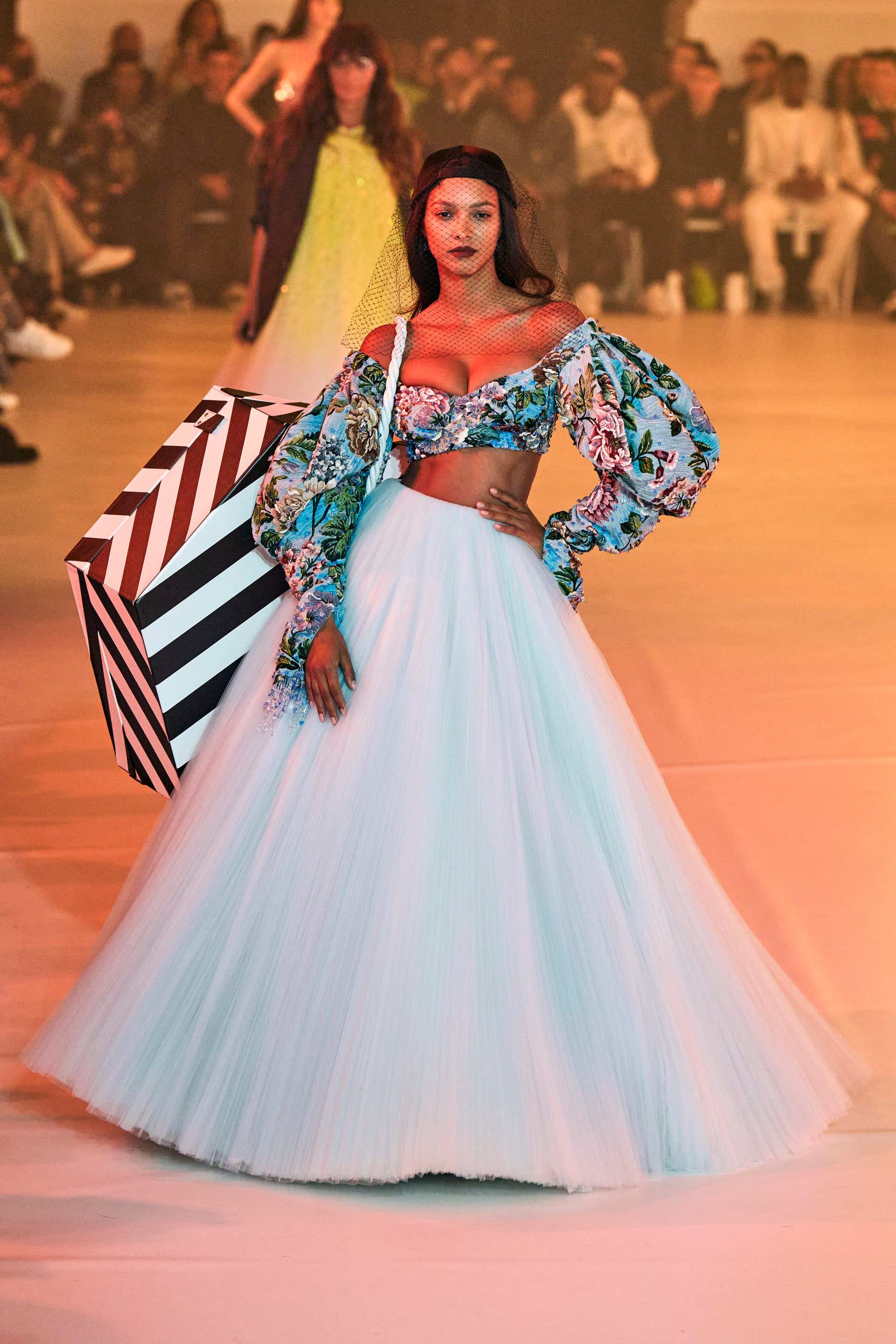 Bộ sưu tập 84 look bao gồm nhiều mặt hàng chủ lực của Off-White, được nâng tầm lên một đẳng cấp mới, đồ sộ và sáng tạo hơn. Tỏa sáng với ánh đèn sang trọng của chùm đèn to khổng lồ đặt giữa sàn diễn, giới mộ điệu vừa trầm trồ vừa thể hiện thái độ tôn trọng với những thiết kế được phóng đại tỷ lệ làm chủ đạo, những bộ suits được “nhuộm” trên người nhiều bản in độc đáo, đa dạng phong các từ cổ điển đến hiện đại. Bên cạnh đó, những câu nói nổi tiếng của Virgil còn được “đính” lên hàng loạt thiết kế, rải rác khắp sàn diễn. Chẳng hạn, “Little Black Dress” chạy dọc bên hông hay chiếc cờ trắng được in dòng “Question Everything” bên trên.