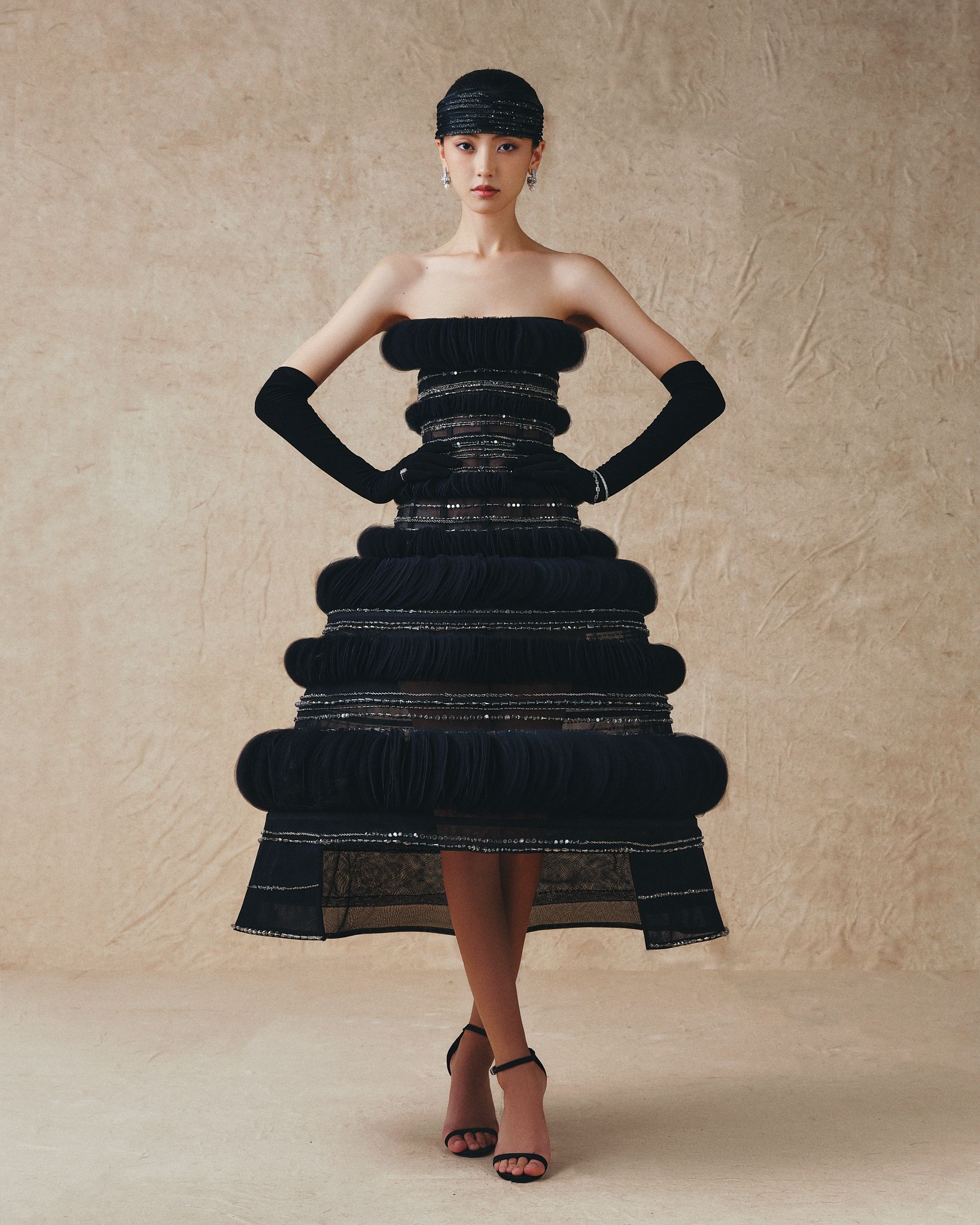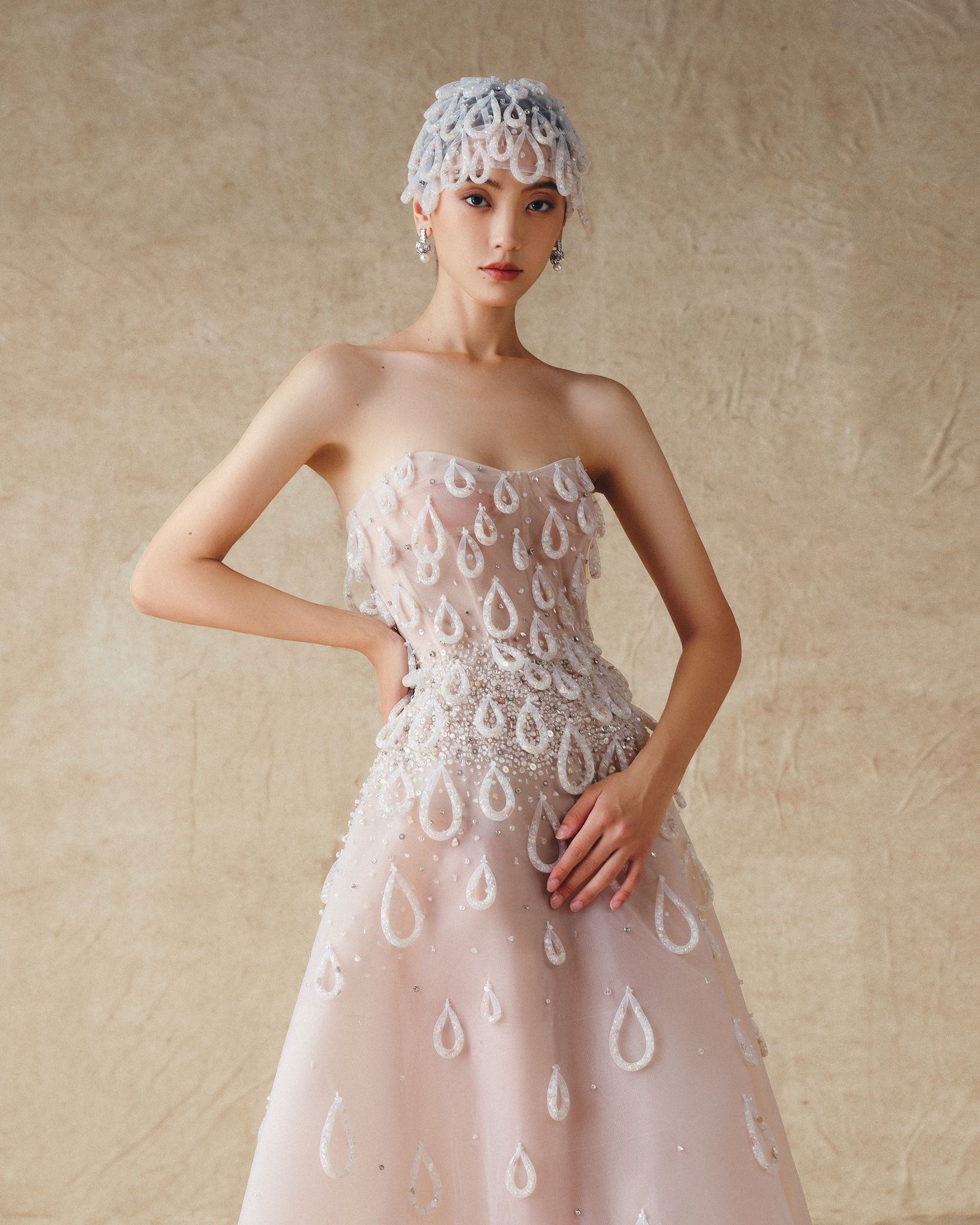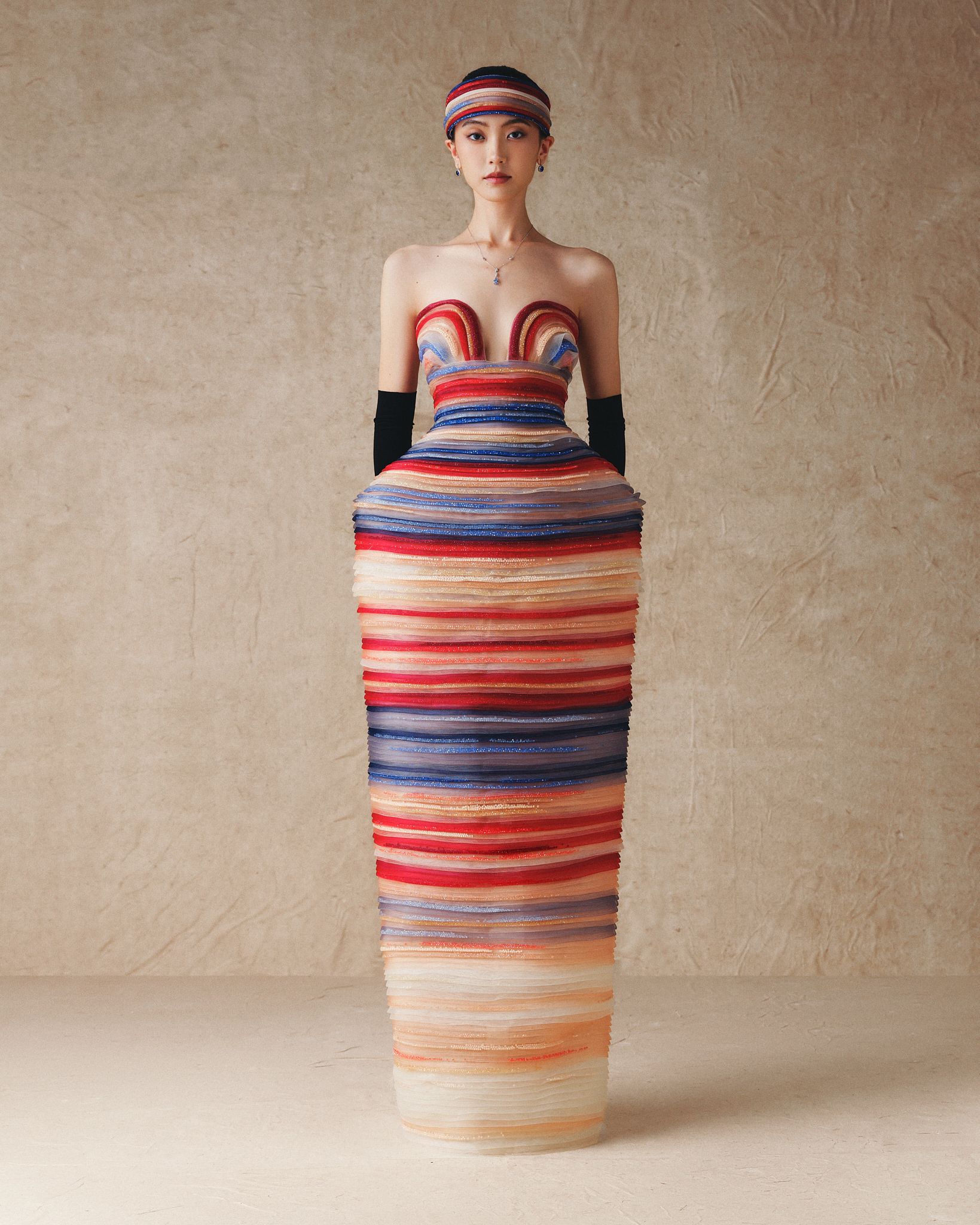 Khắc hoạ vẻ đẹp thơ mộng và ý niệm đó, tôi muốn vẽ nên bức tranh cánh đồng vừa gần gũi bình yên, vừa vị lai như đến từ một hành tinh khác. Sử dụng các chất liệu mesh đàn hồi đặc trưng của thương hiệu, sáng tạo bằng cách chạy hiệu ứng 3D lượn sóng xếp lớp, hoà sắc những gam màu pastel đan xen. Các bông hoa li ti được nhuộm, cắt, uốn, đính thủ công tinh xảo trên các sợi cước mỏng cùng các hạt pha lê lấp lánh như những giọt sương. Tất cả tạo nên những cánh đồng vị lai thơ mộng và yên ả.
