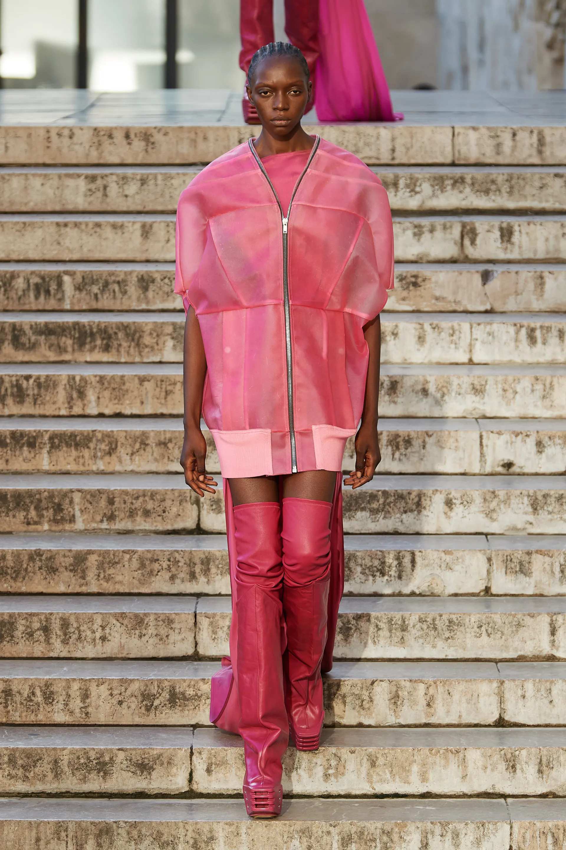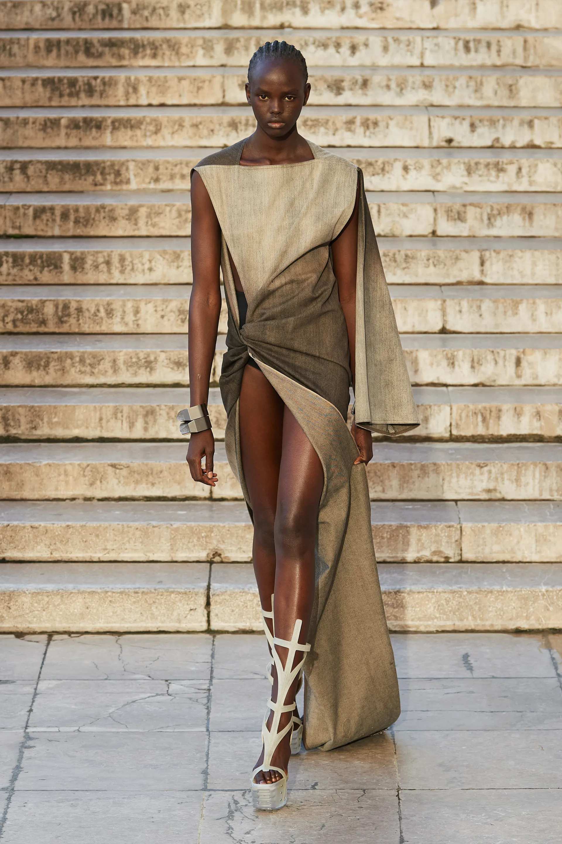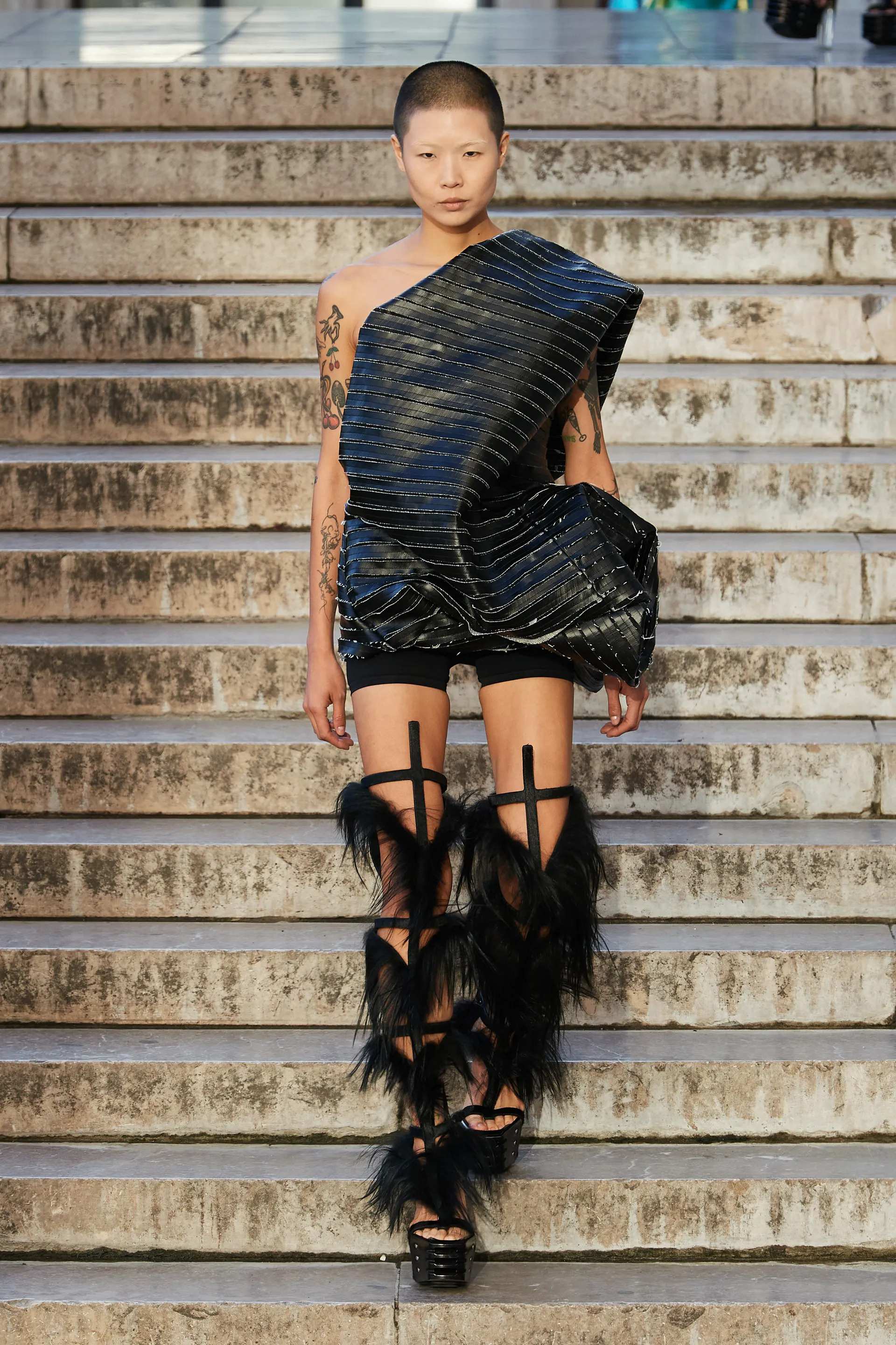 Nếu như những chiếc áo khoác vai rộng, áo choàng có mũ trùm đầu, những đôi bốt Frankenstein đồ sộ và quả cầu lửa ở Rick Owens Menswear Spring 2023 khiến chúng ta lo lắng và sợ hãi về ngày tận thế cận kề của hành tinh thì ở Rick Owens Womenswear mùa giải này sẽ đã dập tắt nỗi lo đó với một đài phun nước phun trào cùng làn sương khói “độc quyền”, mù mịt vô cùng huyền bí. Vào một buổi chiều đầy nắng tại chốn cũ - Palais de Tokyo, Rick Owens thả từng người mẫu, lần lượt một xuống chiếc cầu thang bằng đá cẩm thạch, trong đôi ủng dài “đặc sản” nặng nề của nhà thiết kế. Chiếc áo khoác bán thân với cầu vai rộng, sắc bén với phần nhô nhọn hoắt mở đầu show diễn chính là đoạn tóm tắt tất cả những tình tiết trong chương truyện thời trang mới lần này của Rick Owens.