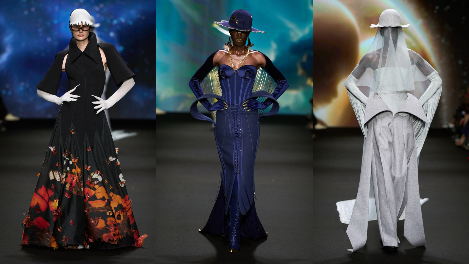 Trong bộ sưu tập Haute Couture Thu/Đông 2024, Robert Wun tiếp tục mối tình của mình với những chiếc mũ rộng vành, áo cúp ngực và đuôi váy nàng tiên cá. Mặc dù những hình dáng này đã trở thành dấu ấn thiết kế cốt lõi của thương hiệu, Robert Wun vẫn cố gắng khiến khán giả ngạc nhiên bằng những điểm xuyết biến tấu mới mẻ, từ kỹ thuật chế tác đẳng cấp cho đến một bảng màu sắc nổi bật. Nối tiếp những bộ trang phục bị xé nát không thương tiếc là những “khóm hoa” nở rộ trên chóp chiếc ô, xòe ra ở cổ, hoặc “chạy” xuống ngực.