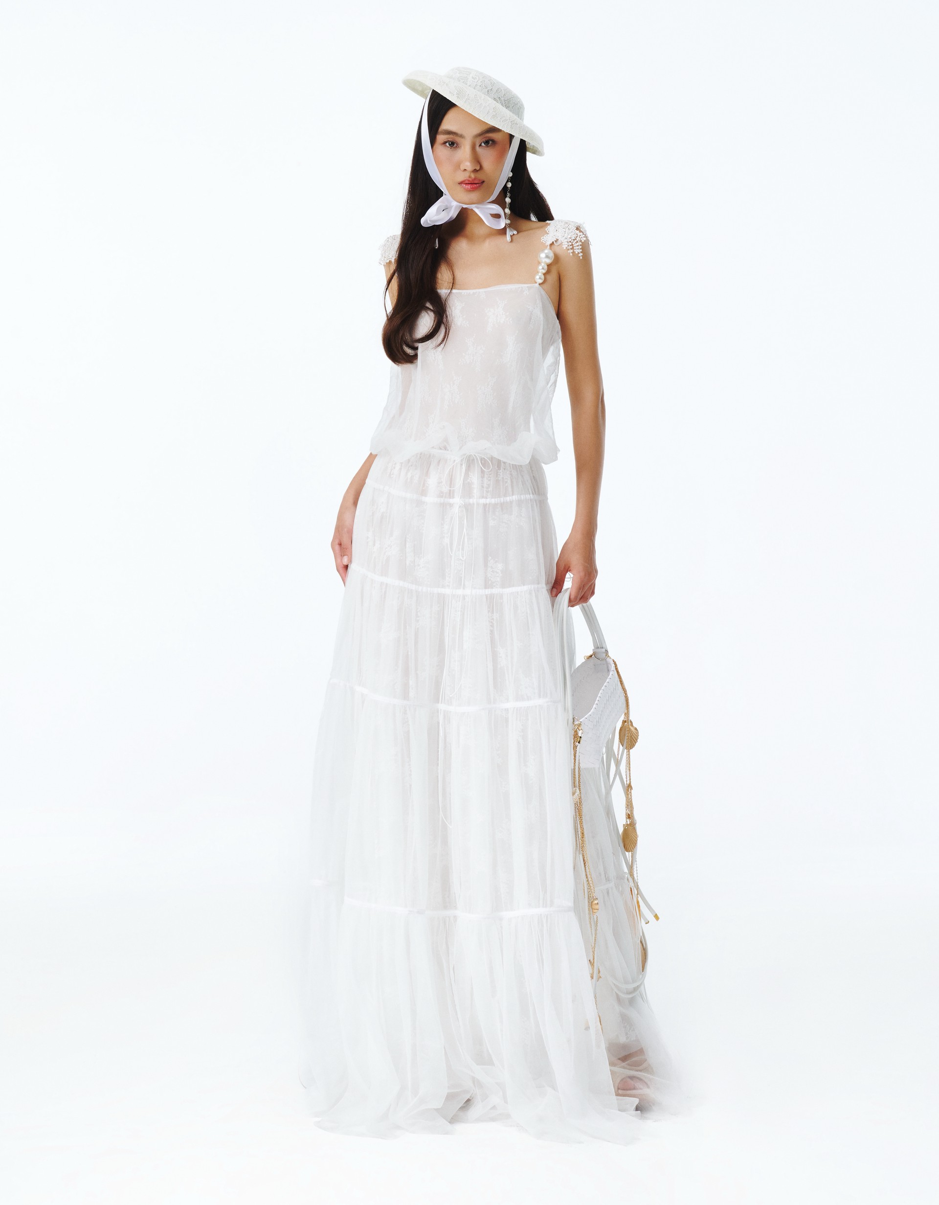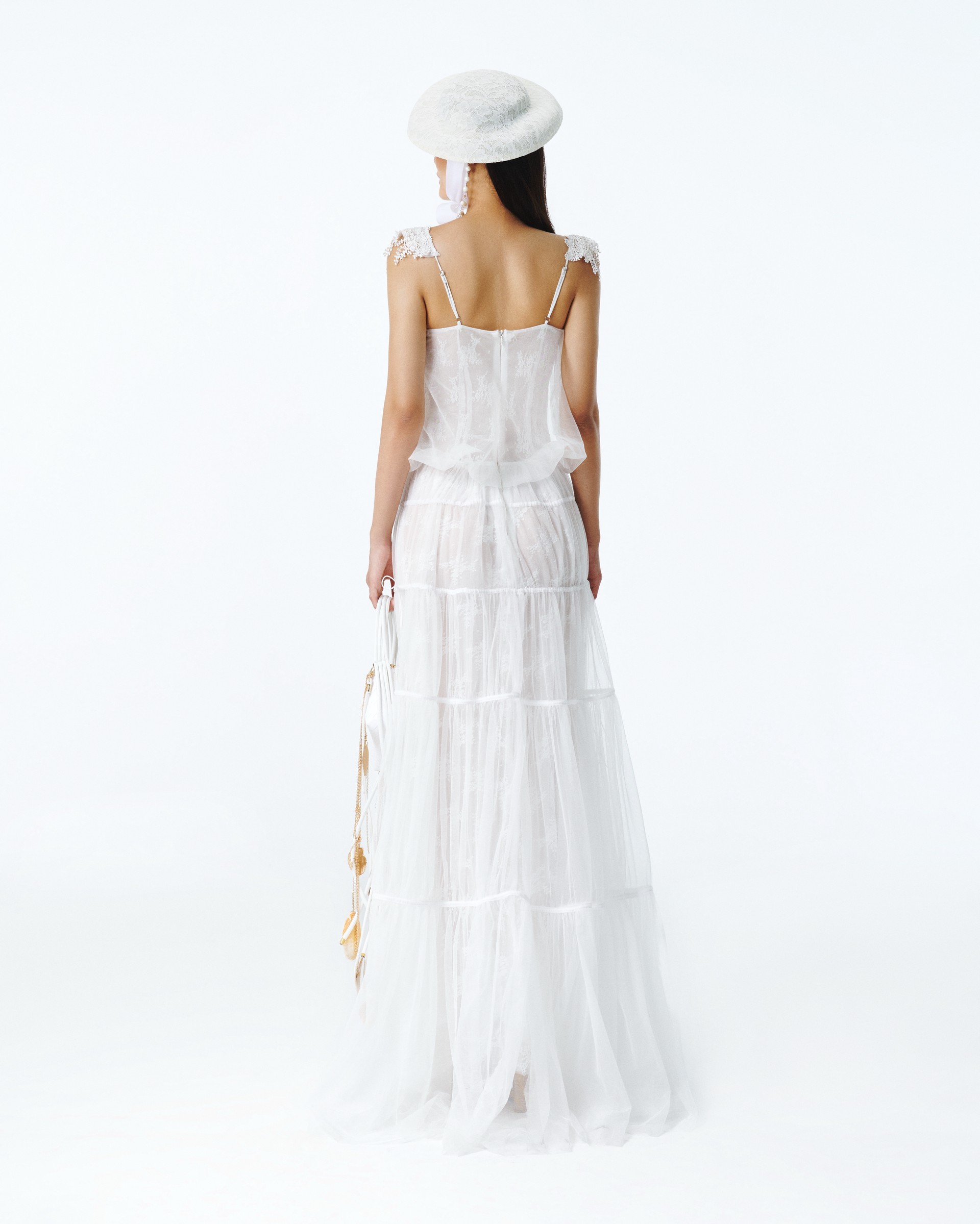Dưới bàn tay chế tác của ONONMM, Céna Dress được kiến tạo từ lớp voan trong nhẹ, mềm mại như làn sương, phủ lên nền ren thêu mảnh với độ tinh xảo cao. Điểm nhấn nằm ở chi tiết ngọc trai và hoa nổi điêu khắc trên phần vai, mang lại chiều sâu thị giác và tôn vinh vẻ nữ tính trong từng chuyển động. Sự hòa quyện giữa chất liệu mong manh và kỹ thuật thủ công tỉ mẩn biến Céna Dress thành một tuyên ngôn thẩm mỹ nhẹ nhàng nhưng giàu cảm xúc, phản ánh trọn vẹn tinh thần lãng mạn hiện đại của bộ sưu tập Mon Amour Xuân Hè 2025.