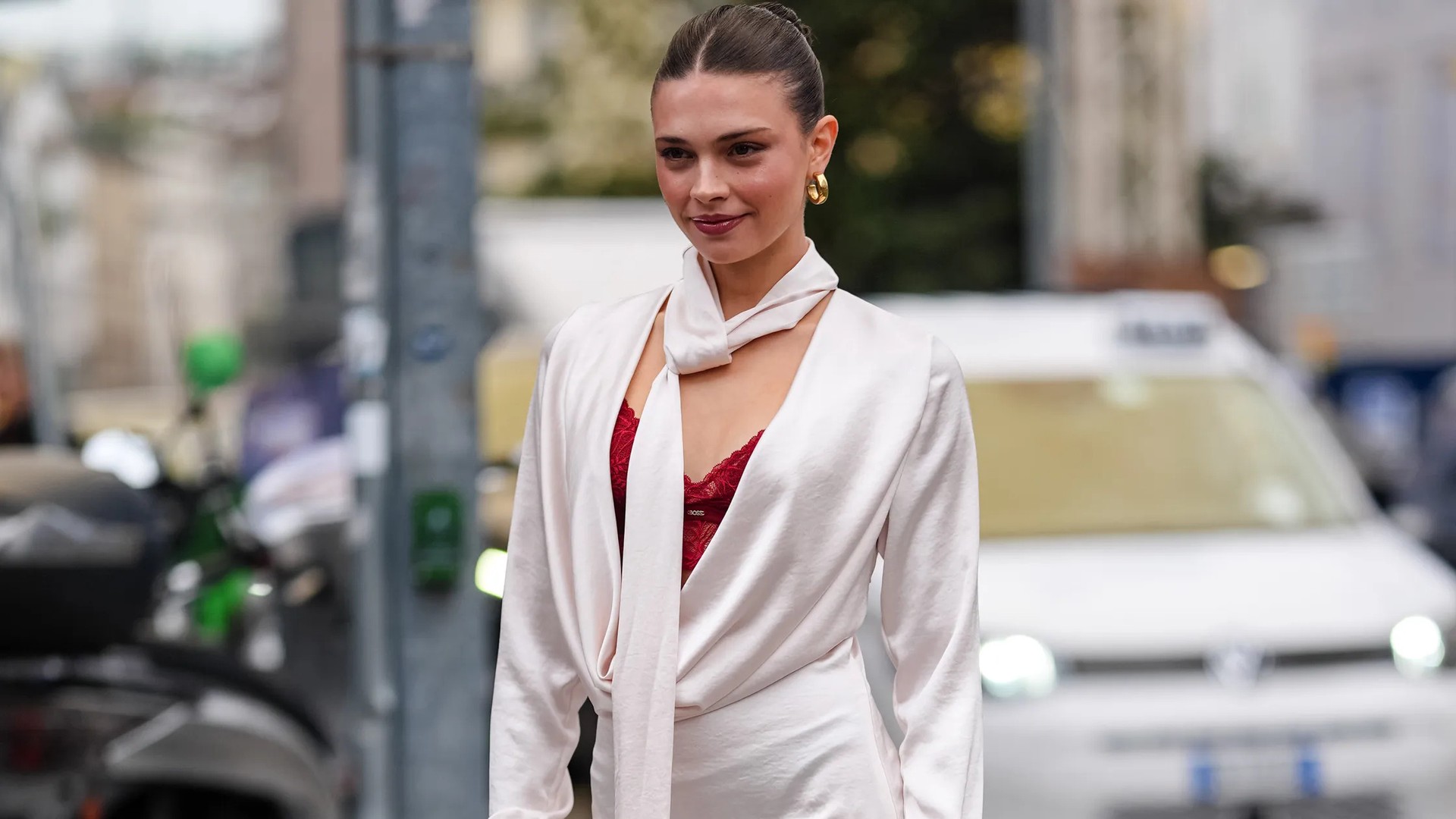 Về mặt thị giác, nó kéo dài cơ thể, tạo đường dẫn từ cổ xuống thân trên, khiến silhouette nhẹ hơn, bay hơn và mang lại cảm giác “less but more” đúng nghĩa.