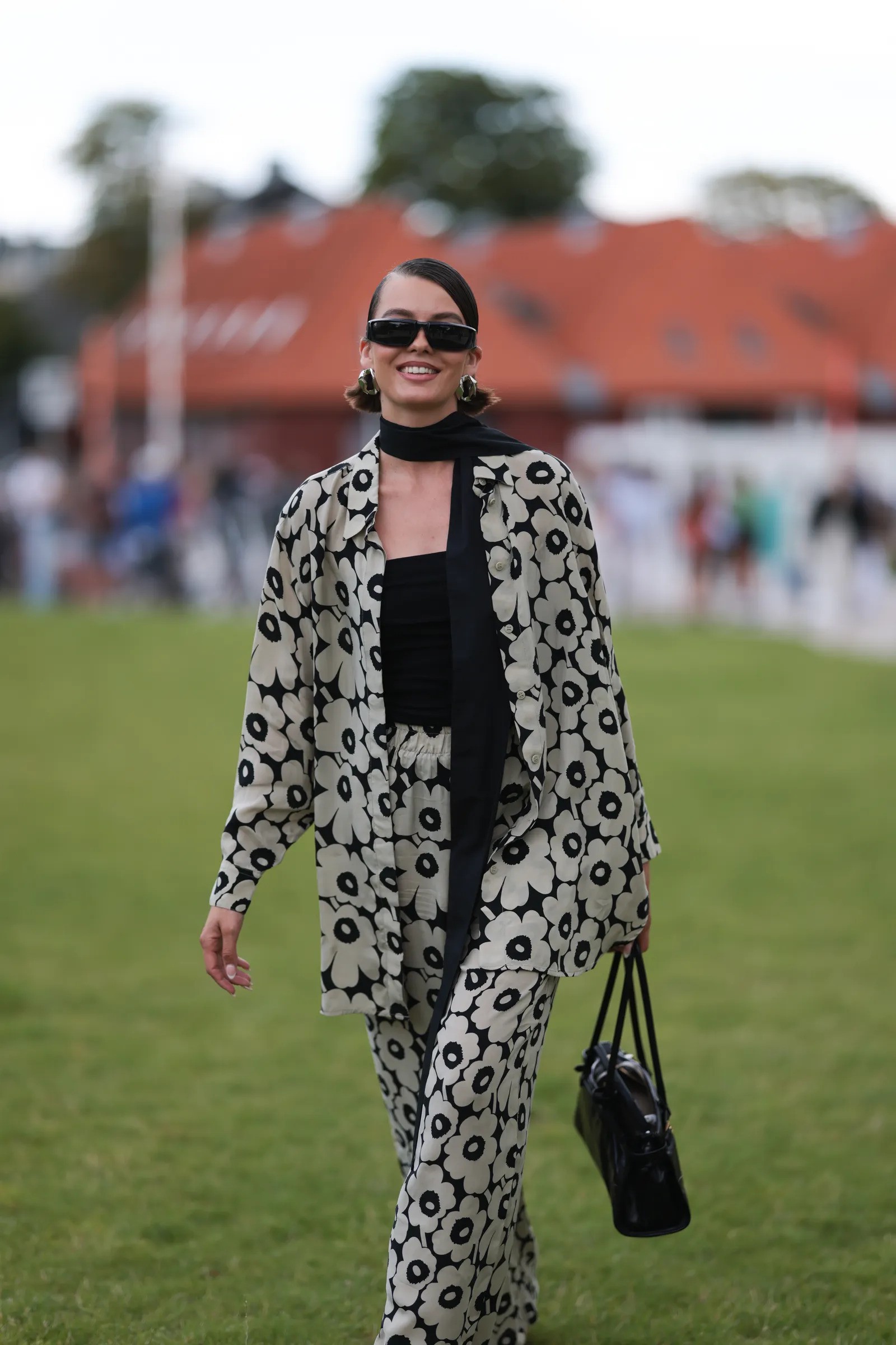 Độ dài lý tưởng là vừa đủ để hai đầu khăn buông nhẹ ở phần eo hoặc ngang hông. Chiếc khăn càng mảnh thì càng tạo hiệu ứng “đường thẳng mềm”, nên chọn khăn quá rộng sẽ phá dáng đặc trưng. Độ rũ tự nhiên là yếu tố quan trọng: khăn không được quá cứng, cũng không nên quá ngắn.