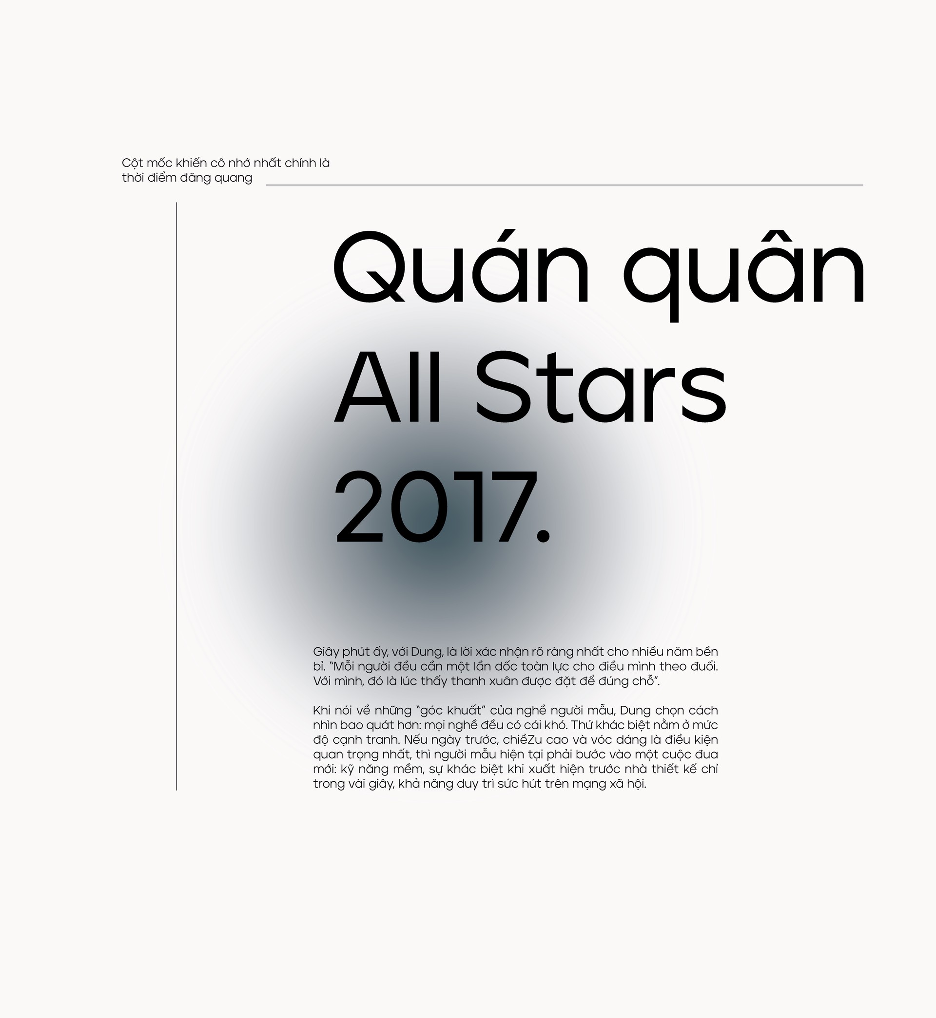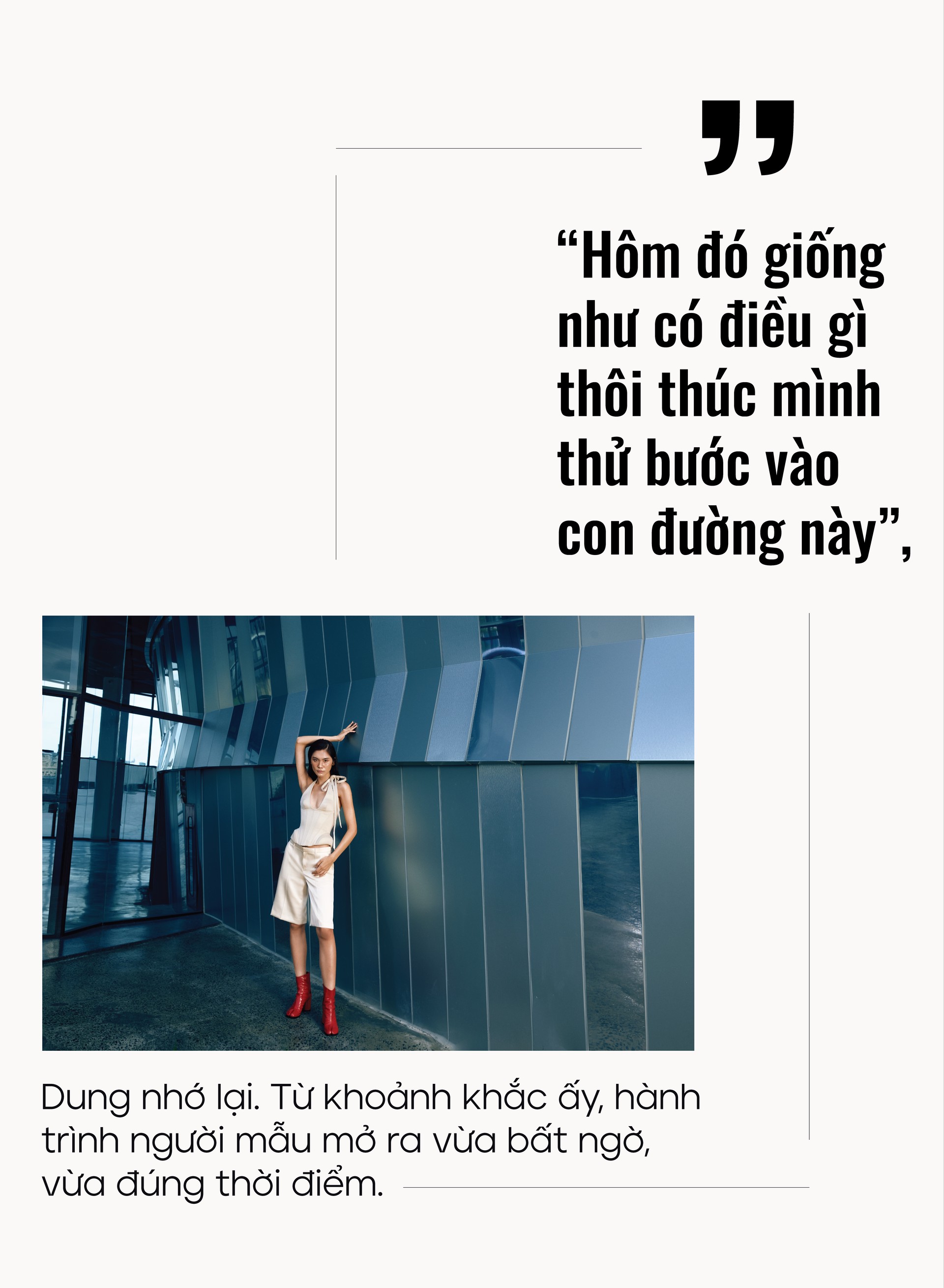 Hơn một thập kỷ làm nghề, Dung nhìn lại chặng đường đã qua bằng ba từ: hào nhoáng, khó khăn và nỗ lực. Trên sân khấu là ánh đèn, lớp trang điểm lộng lẫy, những bộ trang phục khiến người xem say mê. Nhưng phía sau, là hàng trăm giờ tập đi trên giày cao gót, rèn giũa thần thái, tập dáng; là những buổi chụp ngoài trời giữa thời tiết khắc nghiệt; là áp lực phải tỏa sáng chỉ trong vài giây ngắn ngủi trên runway.