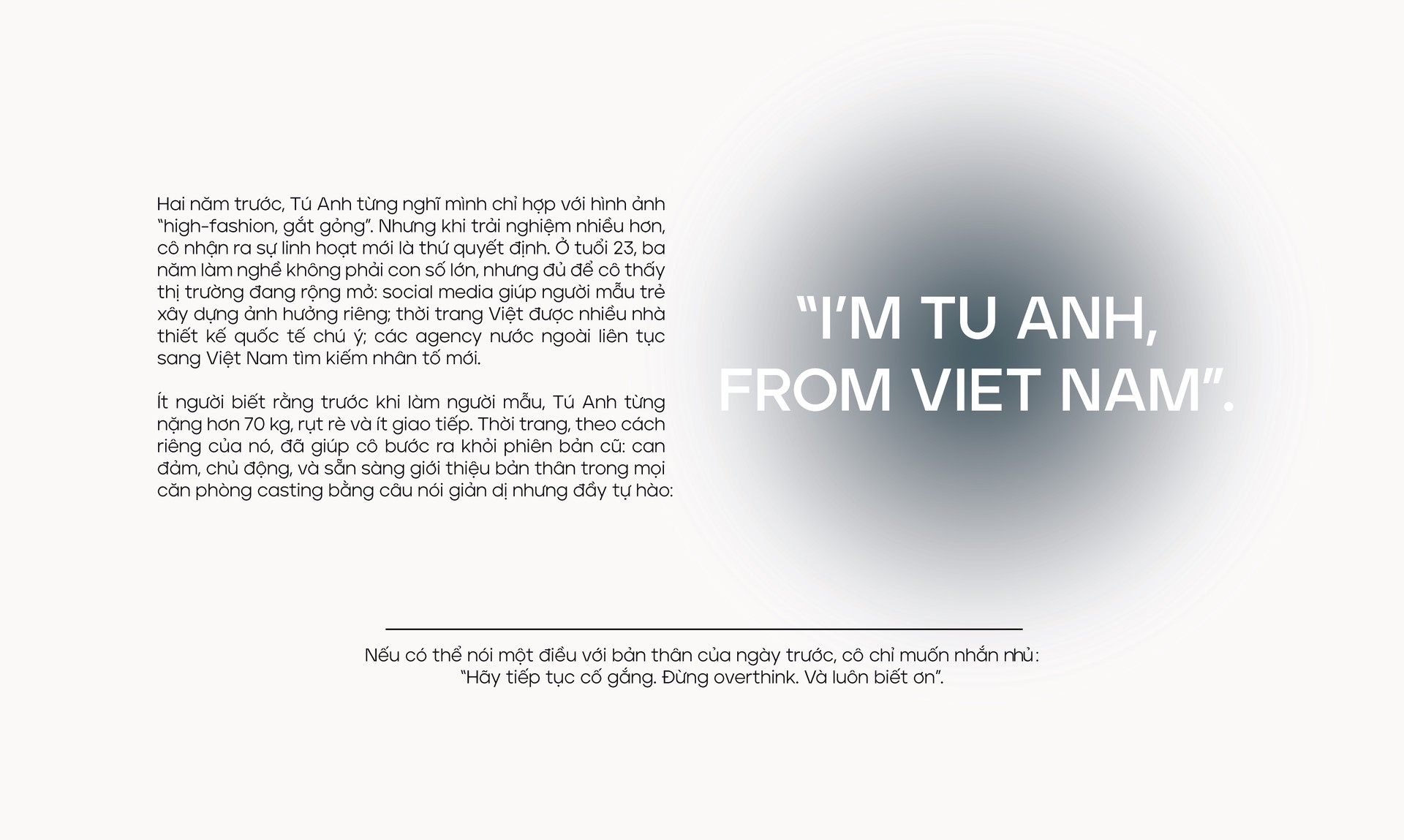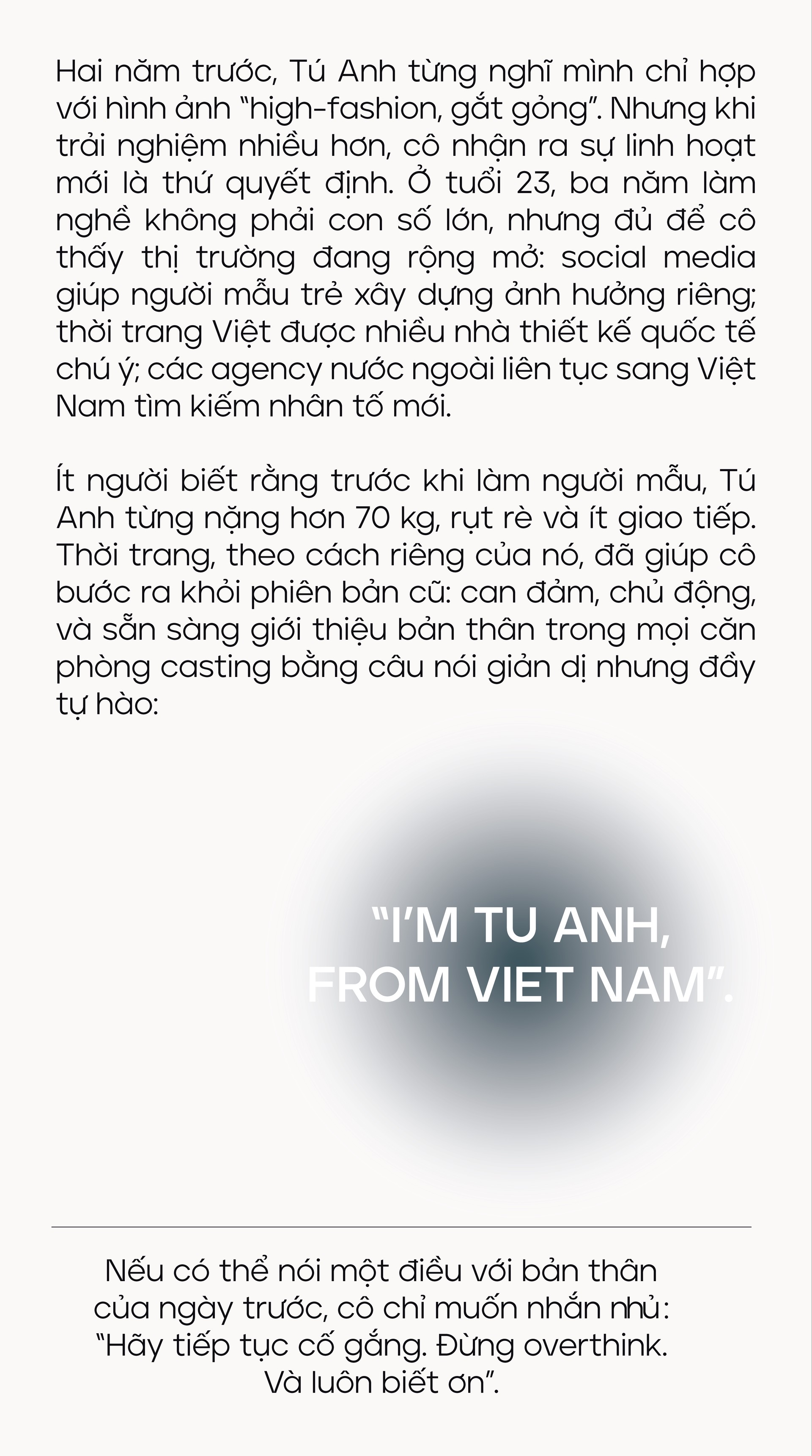 Sự cần cù và nét cá tính mang dấu ấn Việt Nam theo cô chính là điều giúp mình được chú ý ở những thị trường lớn. Tại Paris và Milan, Tú Anh ký với các agency quốc tế và bước vào nhịp casting dày đặc. Câu hỏi đầu tiên ở mỗi buổi luôn là: “Bạn từ đâu đến?” Khi cô trả lời “Vietnam”, không ít người trầm trồ: “Lucky you, you’re the only girl from Vietnam here”. Đó là lời khen, nhưng cũng là cảm giác cô đơn của một người đi một mình. “Nhìn các bạn mẫu cùng quốc tịch trò chuyện vui vẻ, đôi khi mình thấy tủi thân. Nhưng chính điều đó giúp mình mạnh mẽ hơn, để cho họ thấy người mẫu Việt có thể hòa nhập và làm tốt”.