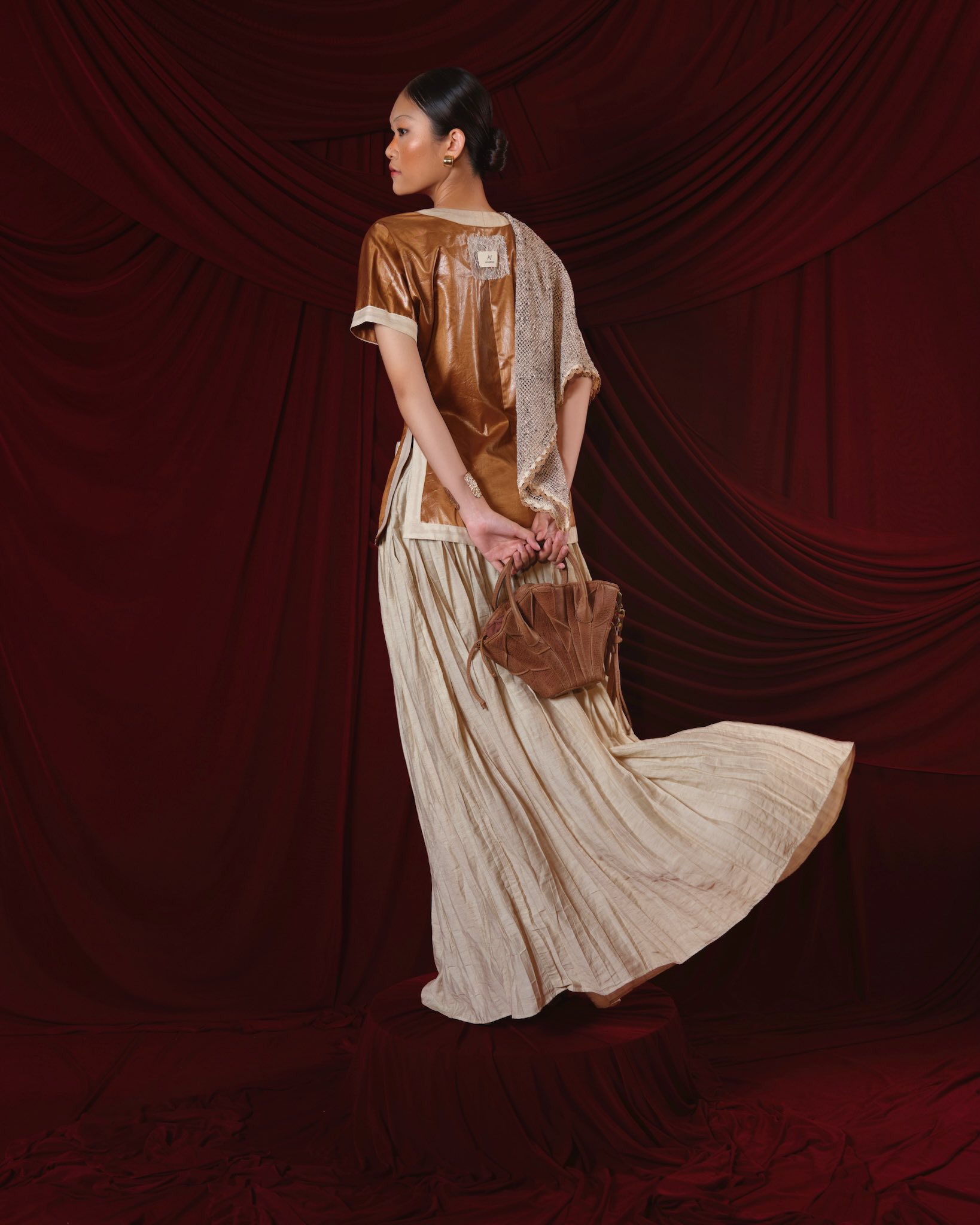 Những phom dáng mang âm hưởng kiến trúc lò gạch – cầu vai vuông, chiết eo cổ chai, nếp uốn bất đối xứng hoà cùng chất liệu đa dạng như linen, ren, lụa, denim… gợi hình dung về dòng chảy mềm mại của sông nước và những mái vòm nhuộm màu phù sa.