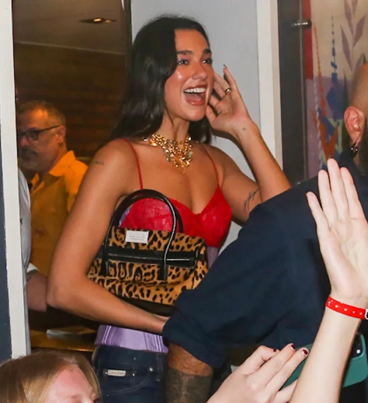 Tại Rio de Janeiro, Dua Lipa chọn corset FANCì CLUB tông tử đinh hương, điểm xuyết ren đỏ, phối với quần jeans ống đứng xanh chàm, giày Jimmy Choo và túi Maison Margiela da báo. Chiếc áo gợi nhớ phong cách club đầu những năm 2000 nhưng được làm mới với tinh thần Y2K hiện đại. Các phụ kiện như dây chuyền vàng layer của Martha Calvo và giày tông tím nhạt hoàn thiện vẻ ngoài vừa gợi cảm, vừa duyên dáng, hòa nhịp cùng không khí Latinh phóng khoáng.