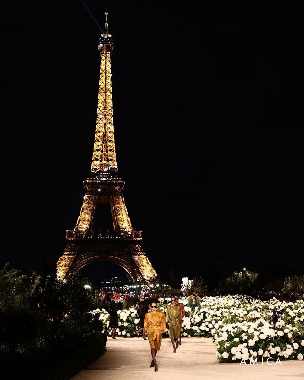 Paris về đêm luôn đồng nghĩa với Yves Saint Laurent. Và tại Trocadéro – quảng trường rộng lớn nhìn thẳng ra tháp Eiffel, nơi từ lâu đã gắn liền với những khoảnh khắc lịch sử của nước Pháp – Anthony Vaccarello đã dựng nên một sân khấu mộng mị nhưng cũng đầy nguy hiểm. Tháp Eiffel lấp lánh trong đêm, ánh sáng phản chiếu xuống mặt đá xám của quảng trường, trong khi cả khu vườn được phủ kín bởi hàng ngàn bông cẩm tú cầu trắng, xếp thành chữ YSL khổng lồ như một lời tuyên ngôn khắc lên nền trời Paris. Từ drone trên cao, khung cảnh hiện ra như một thước phim điện ảnh, gợi lại huyền thoại Saint Laurent những năm 1970–80 khi Paris by night đồng nghĩa với sự phóng túng, gợi tình và xa hoa.