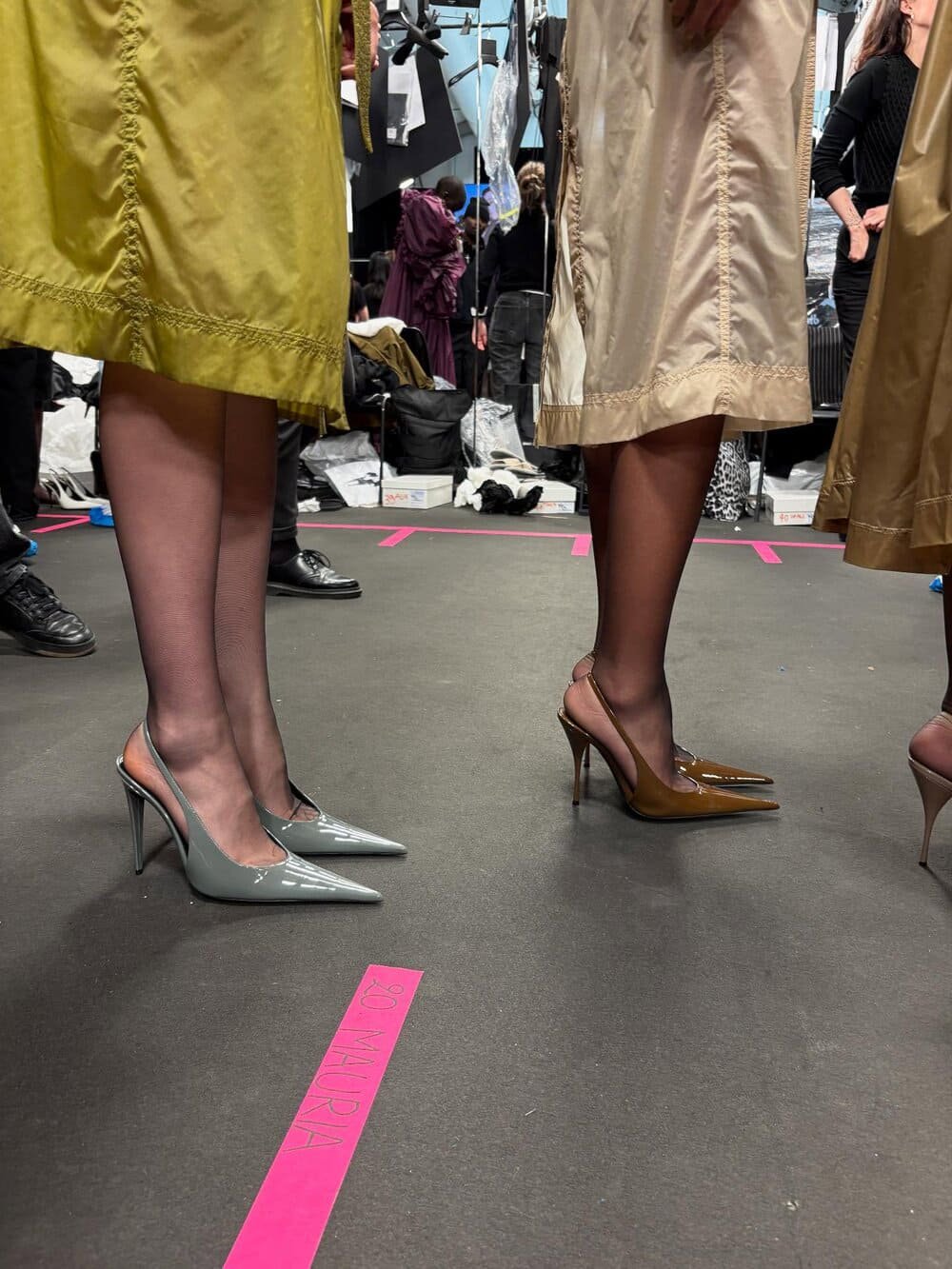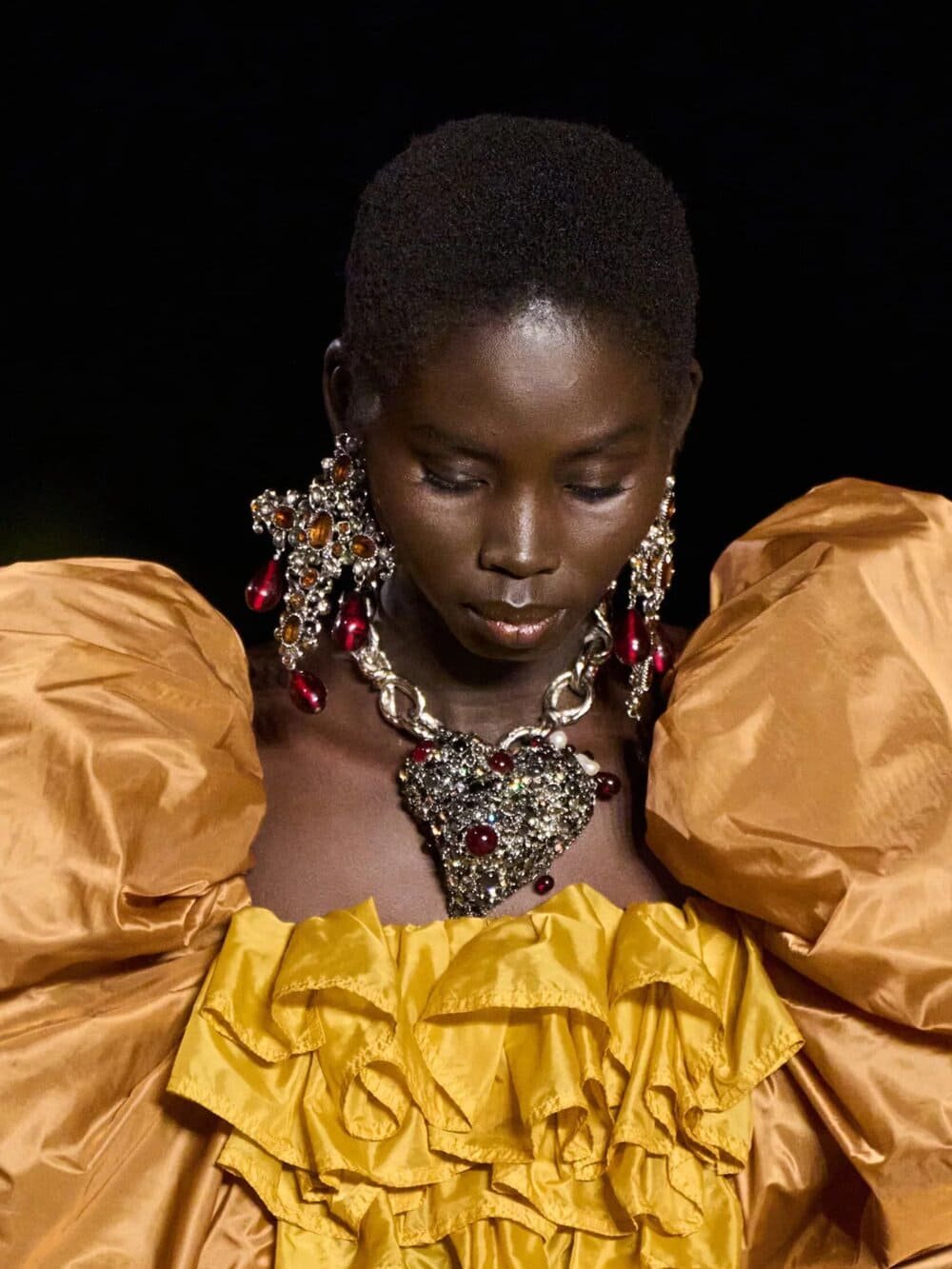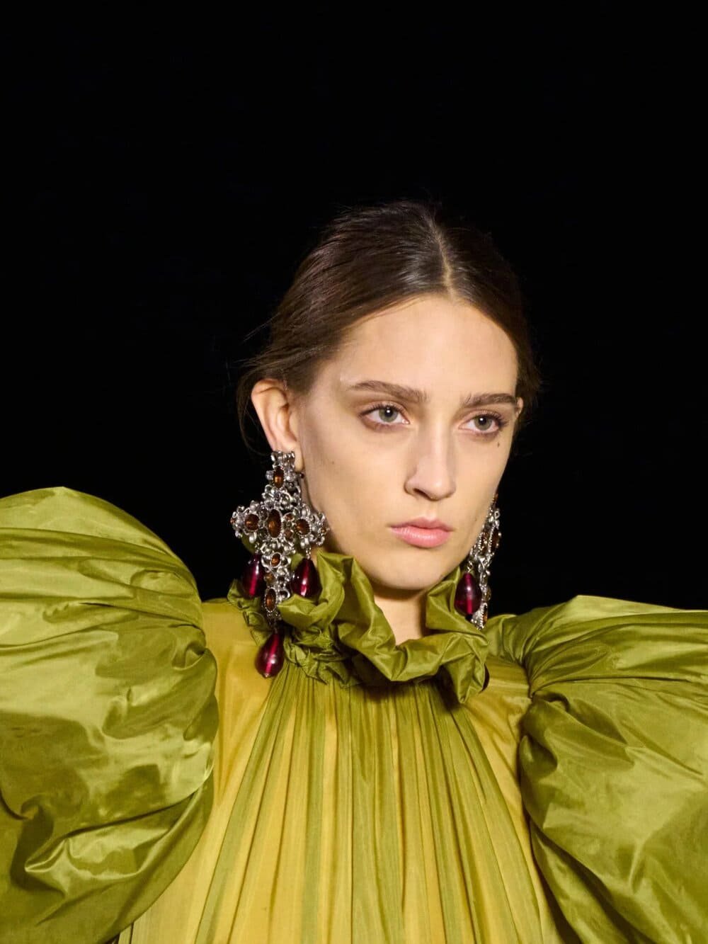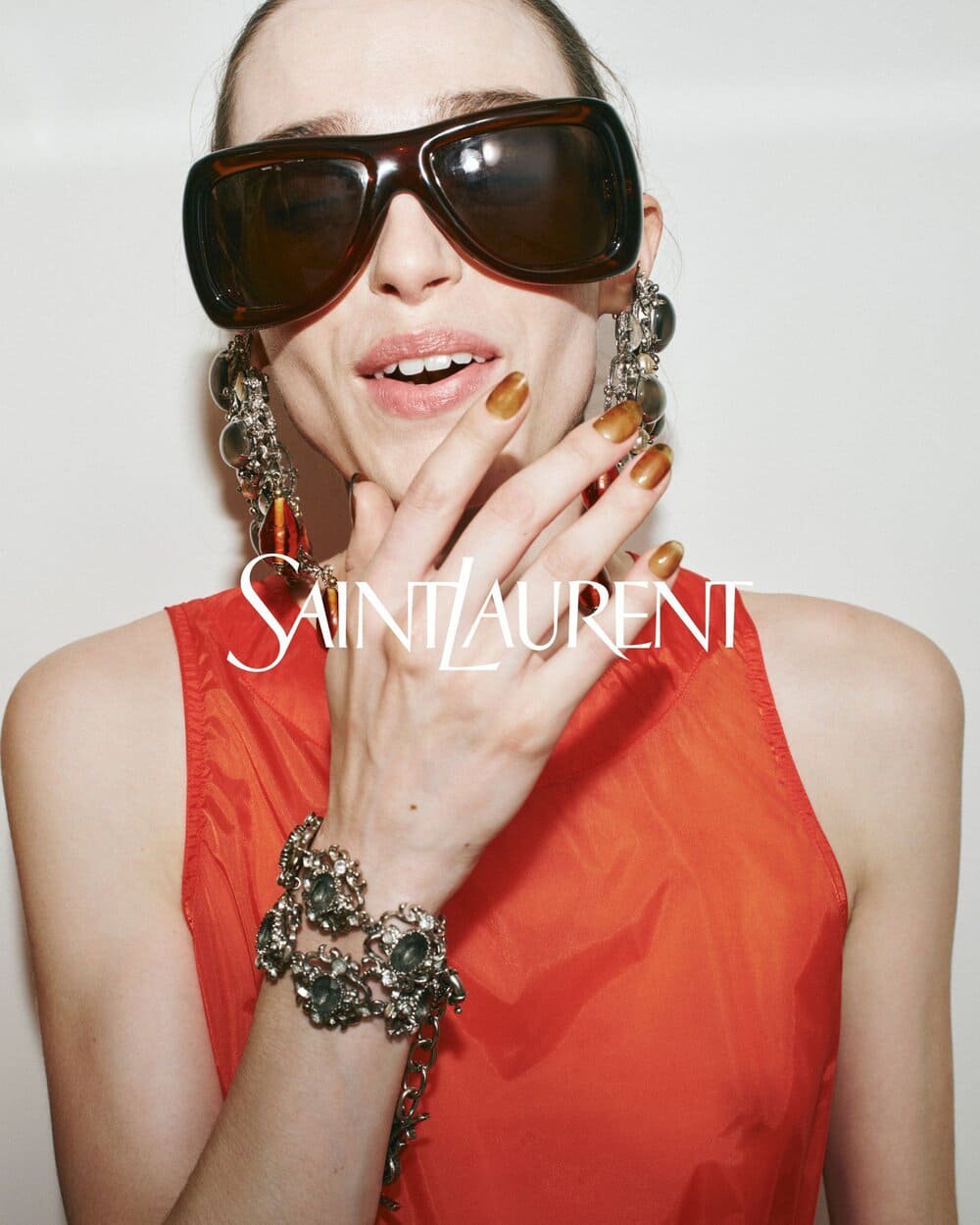 Vaccarello từng khai thác chi tiết này trong bộ sưu tập menswear Thu 2023 – một show gây chấn động khi ông hoán đổi các mã giới tính để tạo nên sự lưỡng tính quyền lực. Giờ đây, tinh thần ấy trở lại, nhưng trên cơ thể phụ nữ: mạnh mẽ, bóng bẩy và thách thức trong Saint Laurent SS26.