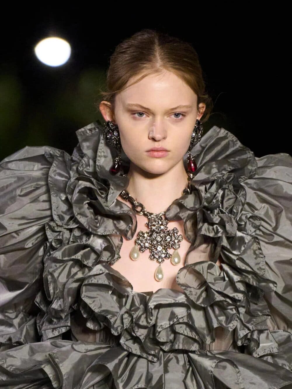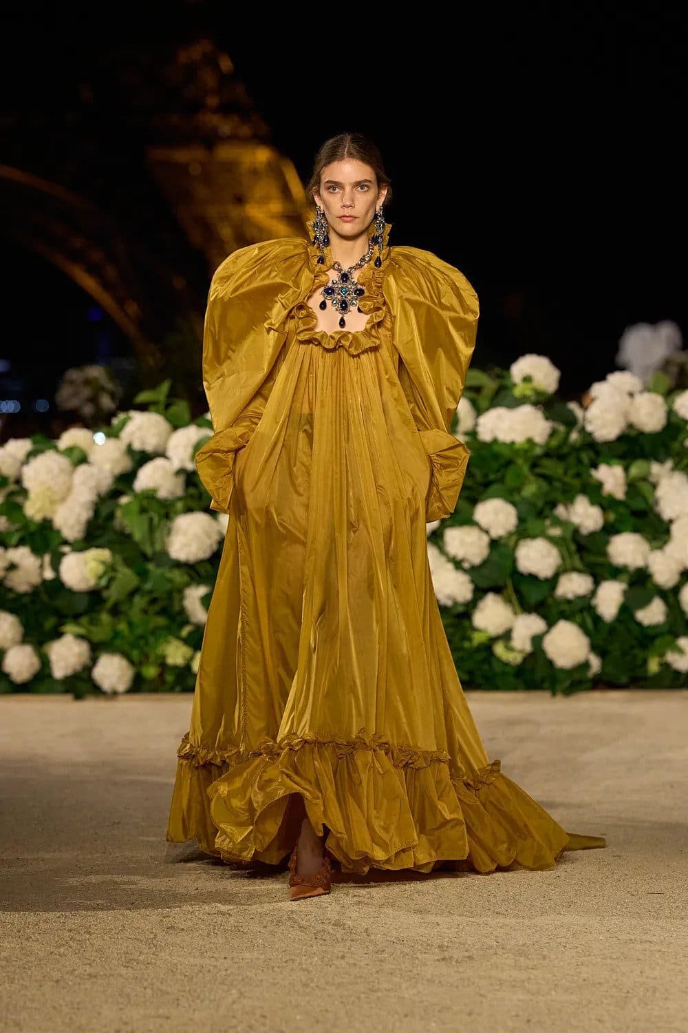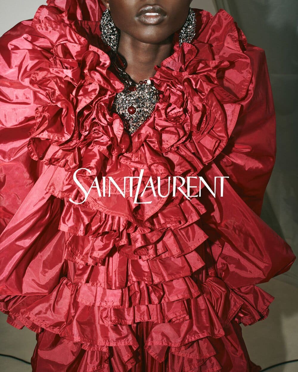 Sau những màn “người đàn bà thép” trong leather, Vaccarello lại đổi tông một lần nữa, đưa khán giả vào một cơn lốc nylon lãng mạn. Váy phồng, tay áo phồng, bèo nhún dữ dội phía trước – tất cả như vang vọng từ haute couture thời hoàng kim của Yves Saint Laurent, những show diễn từng biến Paris thành trung tâm ảo mộng. Nhưng lần này, chất liệu lại là nylon – một thứ vải vốn được gắn liền với tính tiện dụng, thậm chí “rẻ tiền” trong mắt haute couture truyền thống. Chính sự nghịch lý này tạo thành điểm nhấn: evening gown lộng lẫy giờ đây có thể được vo tròn trong tay, mang đi như một món đồ casual, xóa nhòa ranh giới giữa couture và everyday life.