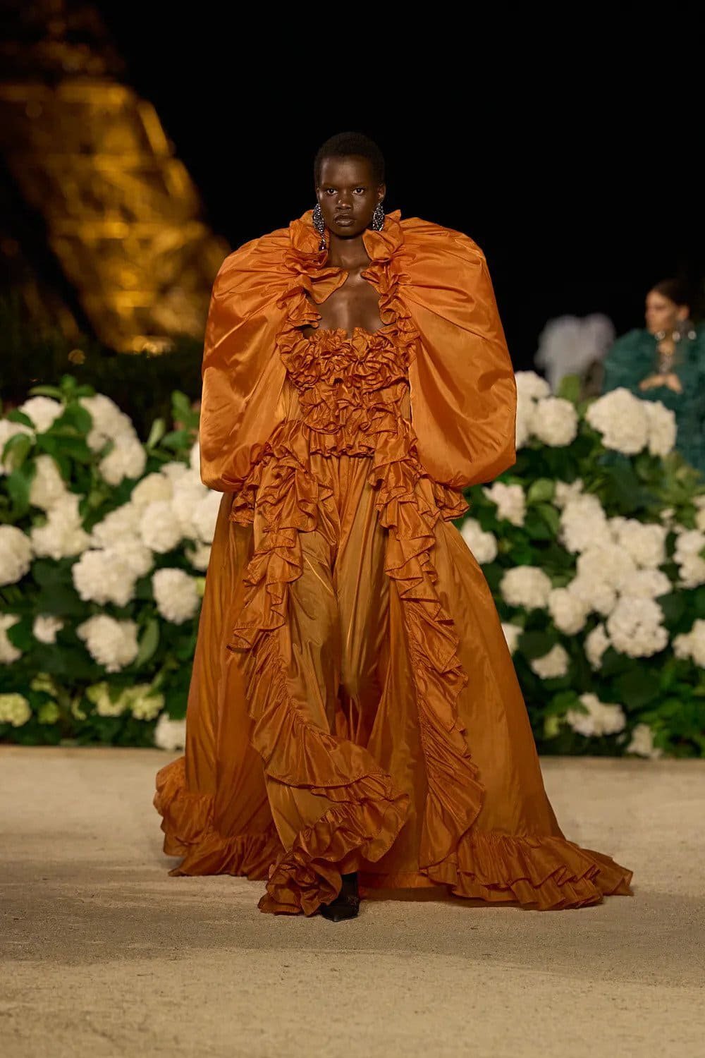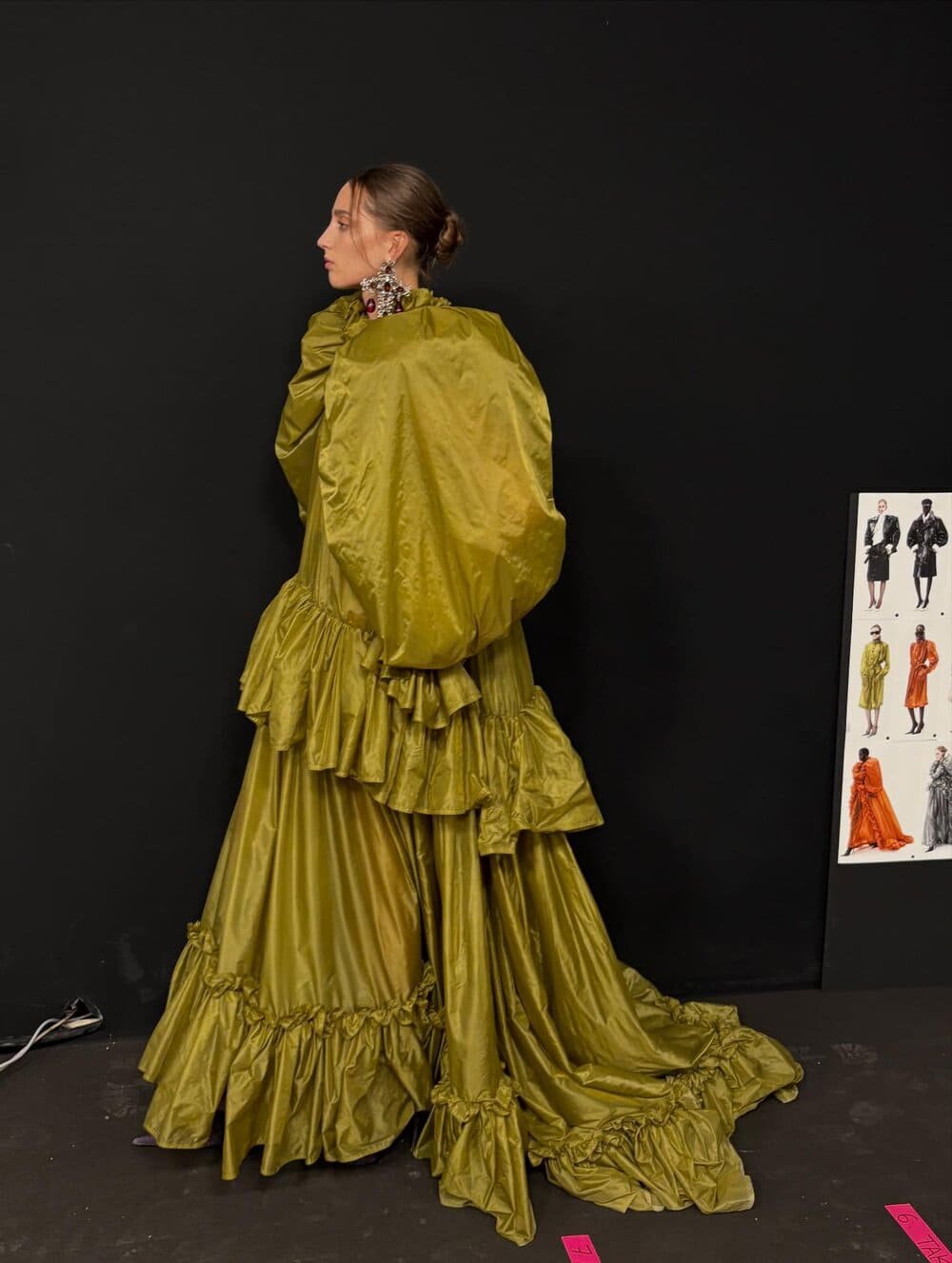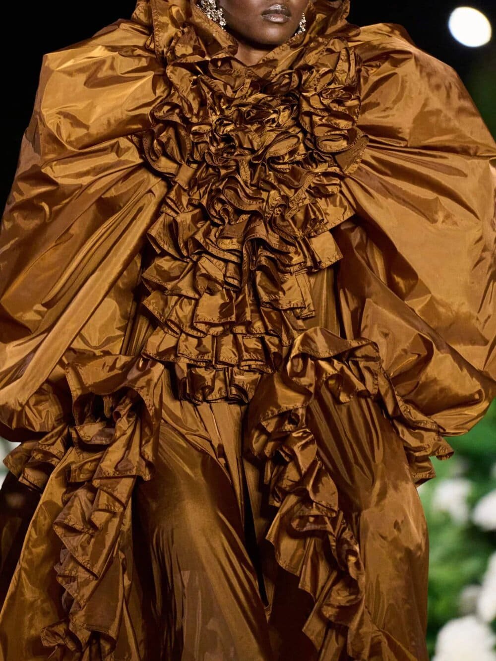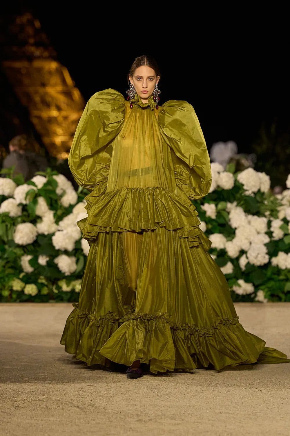 Sau những màn “người đàn bà thép” trong leather, Vaccarello lại đổi tông một lần nữa, đưa khán giả vào một cơn lốc nylon lãng mạn. Váy phồng, tay áo phồng, bèo nhún dữ dội phía trước – tất cả như vang vọng từ haute couture thời hoàng kim của Yves Saint Laurent, những show diễn từng biến Paris thành trung tâm ảo mộng. Nhưng lần này, chất liệu lại là nylon – một thứ vải vốn được gắn liền với tính tiện dụng, thậm chí “rẻ tiền” trong mắt haute couture truyền thống. Chính sự nghịch lý này tạo thành điểm nhấn: evening gown lộng lẫy giờ đây có thể được vo tròn trong tay, mang đi như một món đồ casual, xóa nhòa ranh giới giữa couture và everyday life.