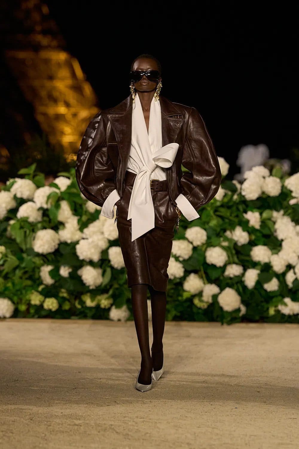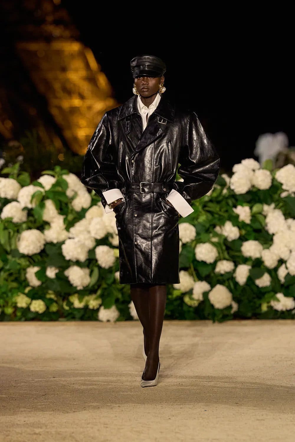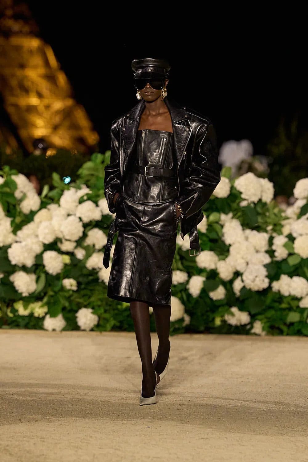 Ở đây, da không chỉ là chất liệu thời trang. Nó là giáp trụ, là dấu hiệu của sự kháng cự, và cũng là công cụ chiếm lĩnh quyền lực. Vaccarello biến từng bộ trang phục thành hành động chính trị: mỗi bước đi trên sỏi đá Trocadéro là một cách định nghĩa lại không gian công cộng. Phụ nữ mặc da không phải để gợi dục, cũng không phải để làm hài lòng ánh nhìn nam giới; họ mặc để tuyên bố mình là chủ thể.