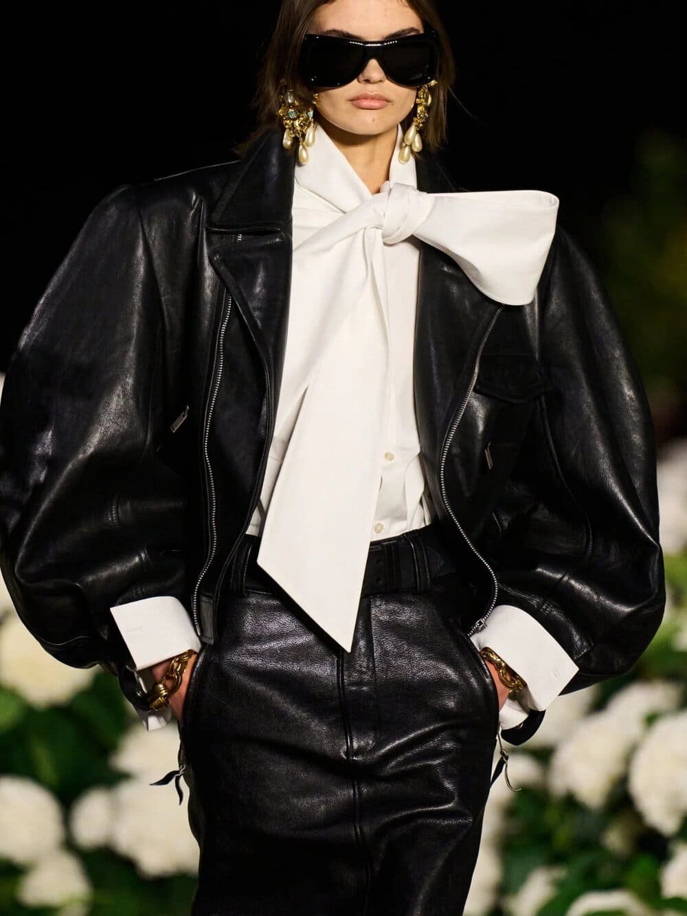 “Louche aristocrat” – Vaccarello dùng cụm từ này để mô tả hình ảnh người phụ nữ bước ra từ Saint Laurent SS26. Đó không phải hình tượng hiền dịu, mà là quý tộc phóng túng, kiêu kỳ, bóng tối lấp lánh trên từng bước đi. Họ diện suit váy bút chì phối áo khoác biker da đen vai vuông, blouse trắng thắt nơ bản lớn đến mức gần như phản kháng. Một kiểu nữ quyền đầy mỉa mai, nơi sự điệu đà của chiếc nơ không còn thuộc về “domesticated little pussy” mà biến thành dấu chấm than nổi loạn.
