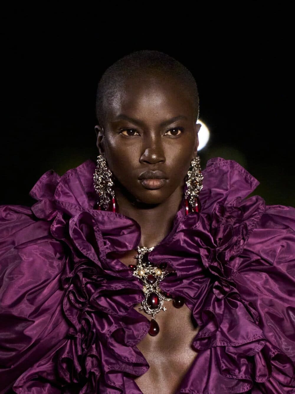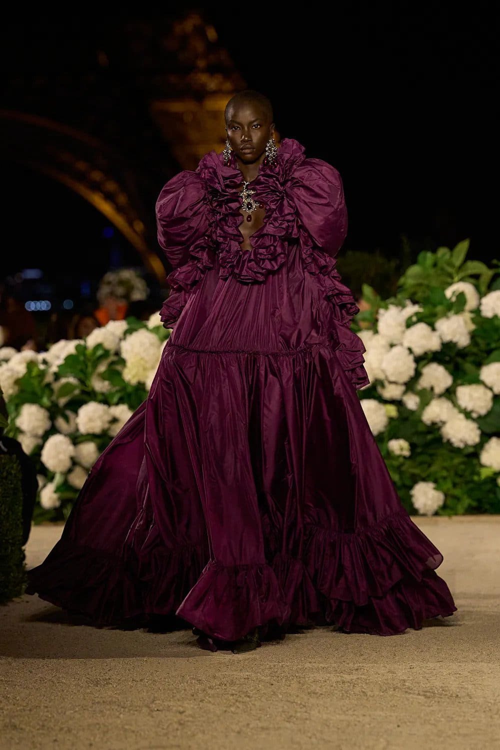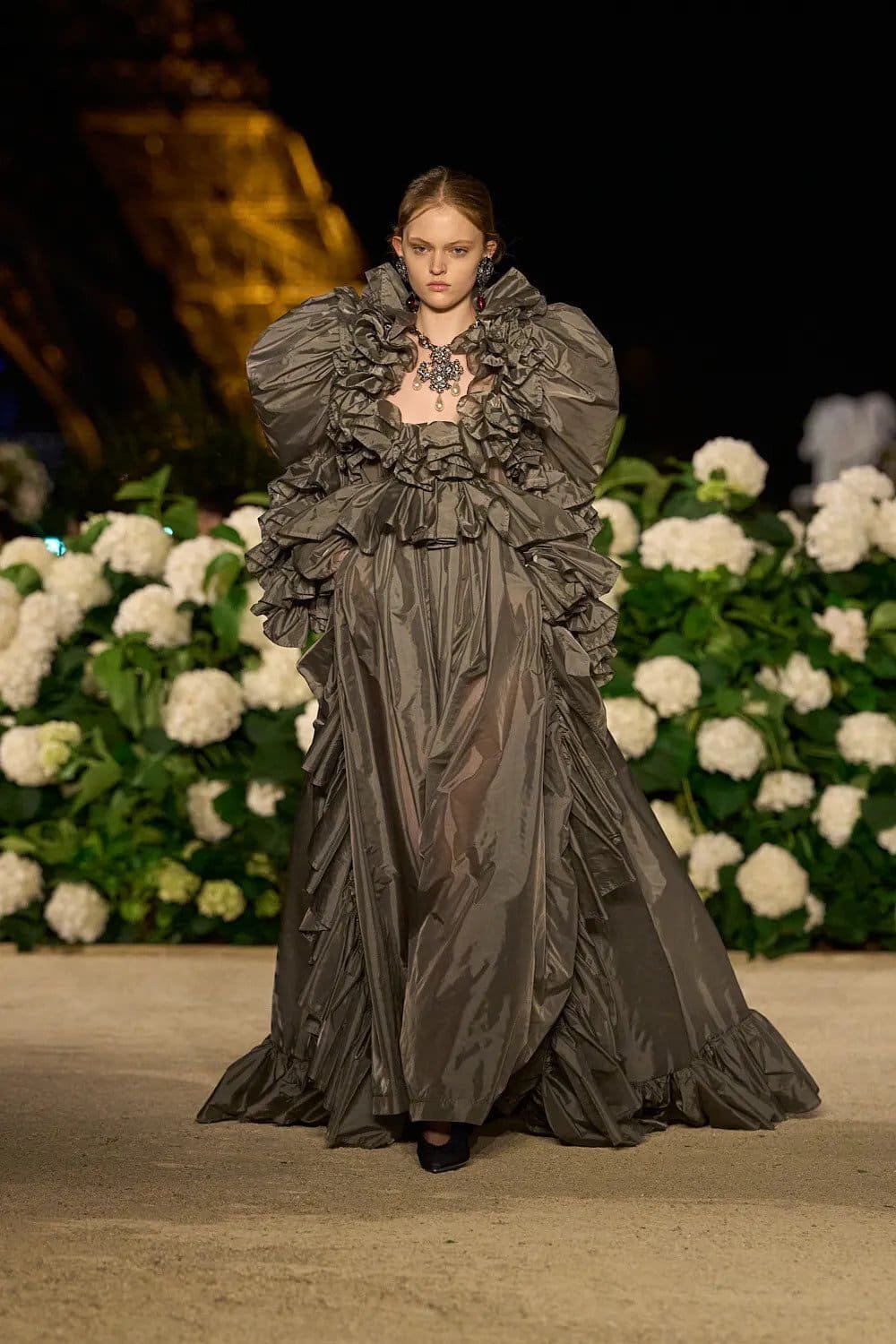 Khi một quý bà xuất hiện trong nguyên cây da – từ corset bó sát, váy bút chì, jacket cứng cáp cho đến chiếc mũ quân đội đen bóng – cả Trocadéro như chìm trong một lớp ánh sáng tối sẫm, gợi nhớ đến những bức ảnh của Robert Mapplethorpe. Vaccarello trực tiếp nhắc đến nhiếp ảnh gia Mỹ trong show notes, và thẳng thắn thừa nhận rằng ông lấy cảm hứng từ cruising culture tại vườn Tuileries – một biểu tượng của tự do ngầm trong cộng đồng gay Paris. Khi mang nó đến Trocadéro, ông đã dịch chuyển từ “bóng tối bên lề” thành màn diễn công khai, đặt trên cơ thể phụ nữ, ngay trước tháp Eiffel – trái tim biểu tượng của nước Pháp.