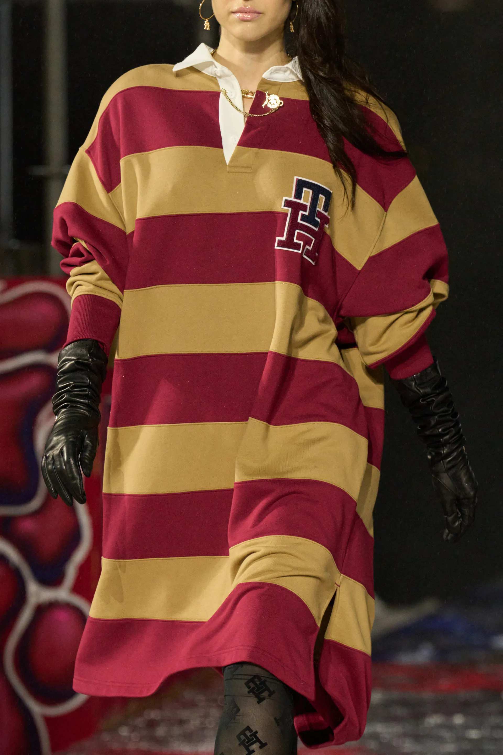Âm nhạc vang lên, ánh đèn sân khấu đổ sáng trên sàn diễn, băng giữa hàng ghế khách mời đang cầm ô che mưa, buổi biểu diễn bắt đầu và kết thúc với hàng loạt thiết kế được phóng đại kích thước một cách đồ sộ. Tommy Hilfiger lần này thuyết phục người xem với những bộ phối preppy học đường cùng chất grunge và punk bụi bặm của Richard Quinn, có một chiếc áo thun polo kẻ sọc dài đến tận dưới đầu gối, những chiếc quần chinos rộng thùng thình đủ chỗ cho cả hai người, sự xuất hiện xuyên suốt của những chiếc khăn quàng cổ, những đôi tất bó sát logomania. Ngoài bảng màu ba sắc xanh dương - đỏ - trắng rất Tommy Hilfiger, đậm chất Hoa Kỳ, nhà mốt còn thử nghiệm với những sắc màu rực rỡ khác như xanh lá, cam,... Những gam màu signature của thương hiệu cũng được đa dạng hóa bằng sự uyển chuyển qua nhiều sắc thái. TommyNow Fall 2022 như mô phỏng một thời khắc chuyển giao từ ngày Hè chói chang đến ngày Thu mát mẻ, thông qua sự đổi màu hài hòa từ sắc đỏ, xanh dương, vàng chói mắt đến gam beige trung tính, dịu mắt.