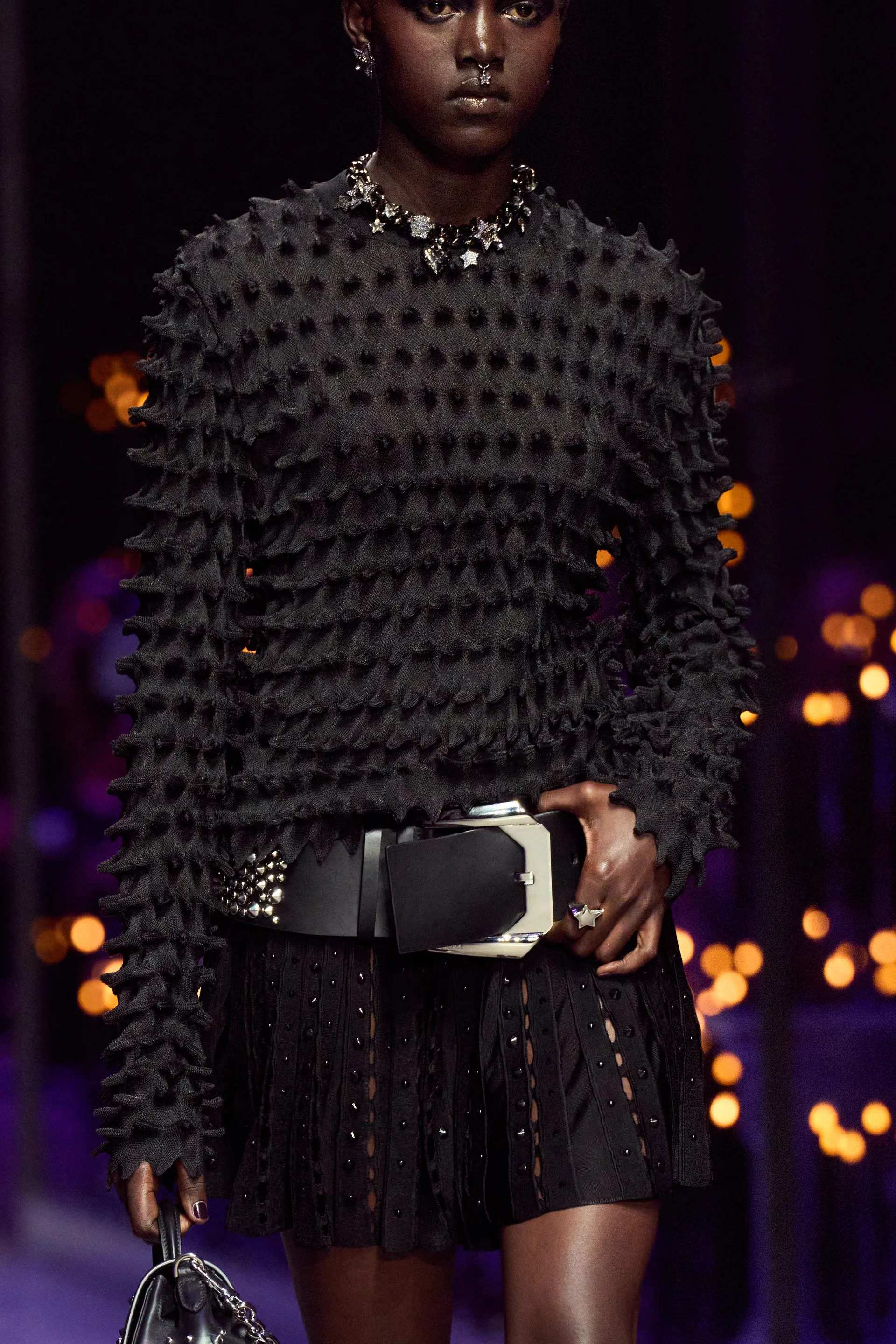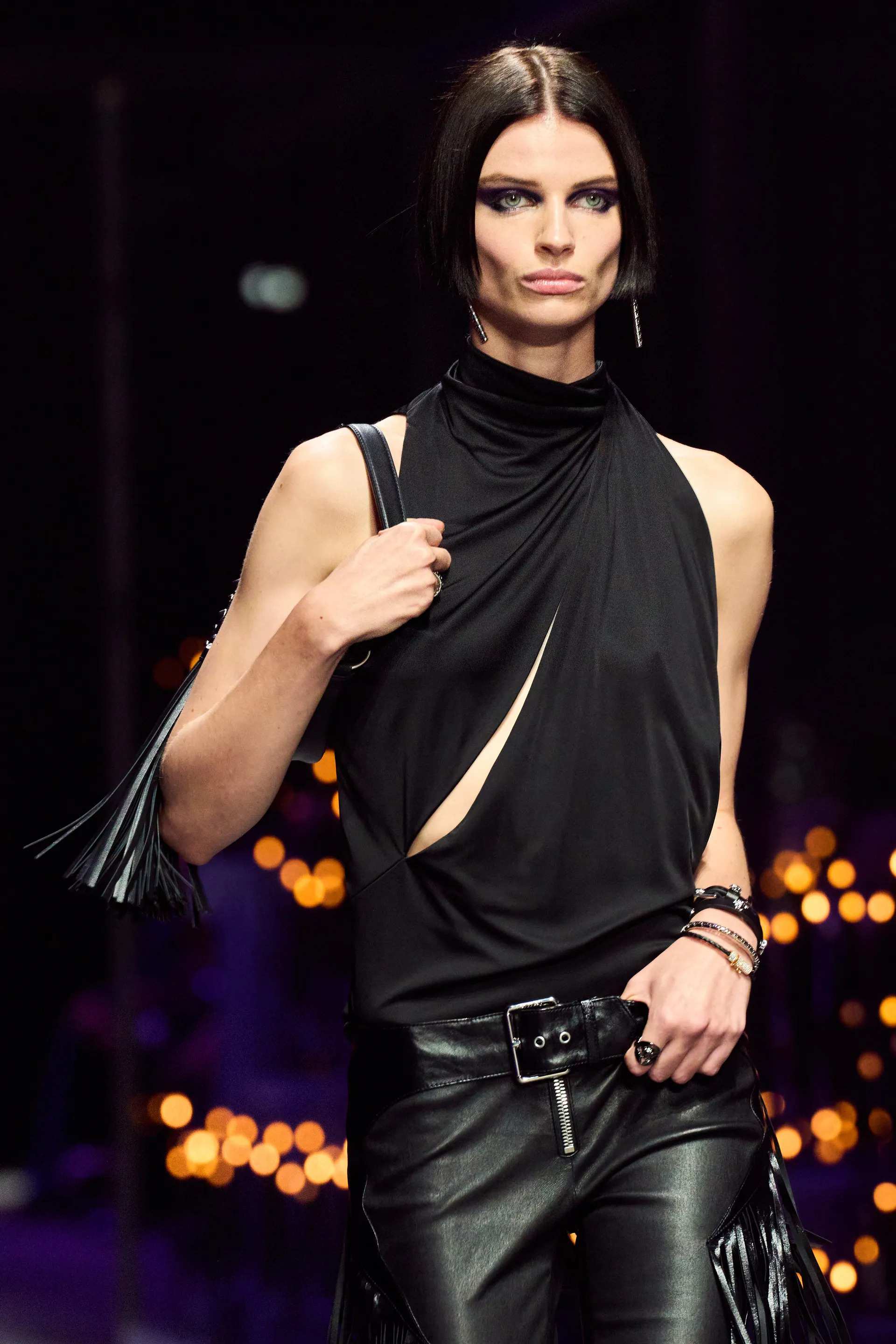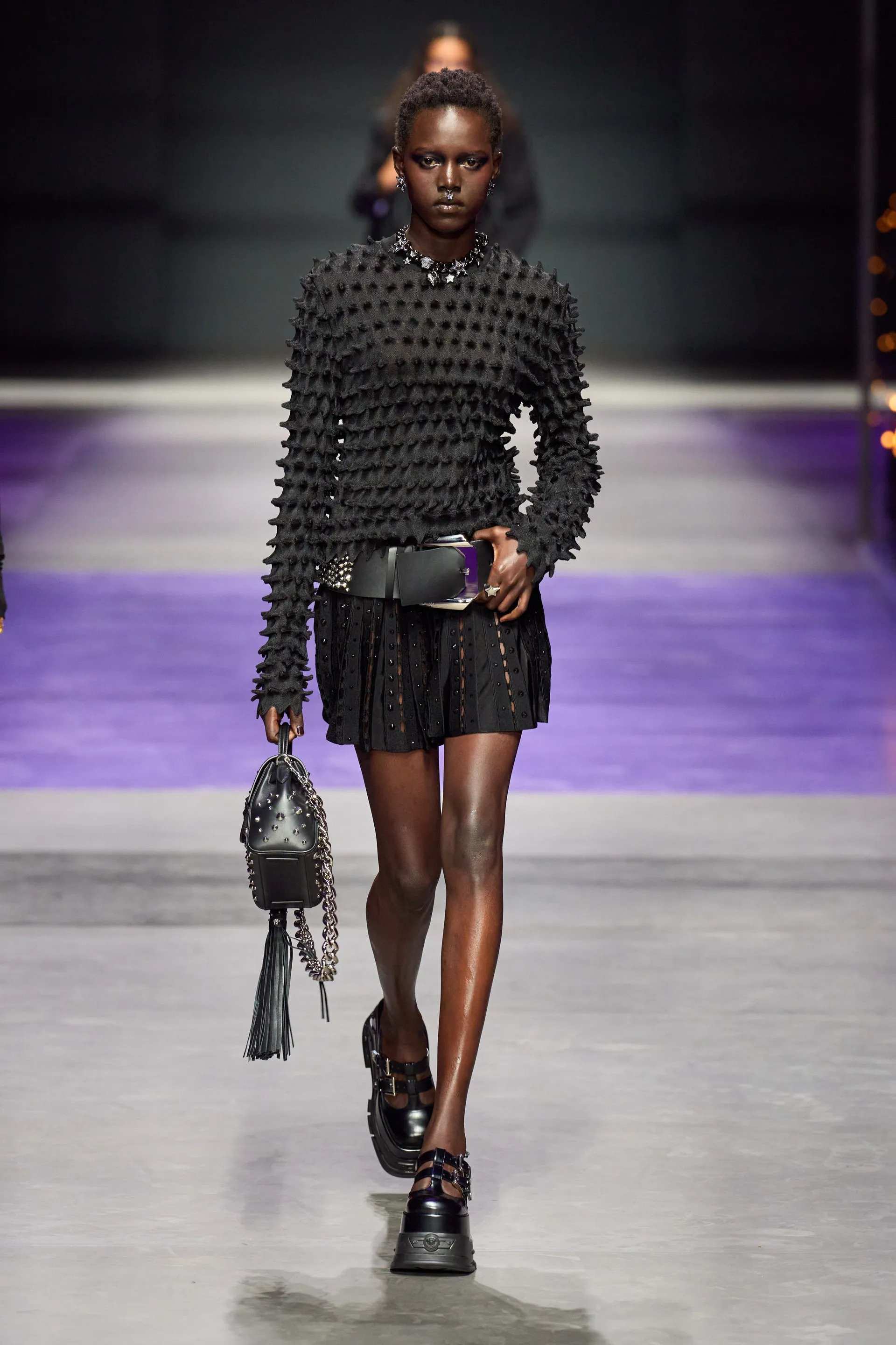 “Tôi luôn yêu thích một người phụ nữ nổi loạn, tự tin, thông minh và một chút gì đó của một diva thực thụ” Donatella chia sẻ, và bộ sưu tập Xuân Hè 2023 lần này của nhà mốt đã thể hiện chính xác tinh thần mà câu nói của bà nhưng với một dạng thức khác. Bốn nàng mẫu cùng chiếc váy đen bó sát cơ thể, quyến rũ với chi tiết cutout tinh tế, ma mị pha chút dữ tợn của đôi mắt khói đen ngòm đi cùng những đôi Mary Jane platform diện mạo mới chính là những người phụ nữ mới của Donatella. Sau màn mở màn ấn tượng của nàng mẫu một con - Gigi Hadid, show diễn tiếp tục với 10 looks đen bí ẩn khác từ chiếc motorcycle jacket da cùng cầu vai tua rua phối cùng chiếc váy siêu ngắn của chân dài Adut đến bản phối sành điệu giữ chiếc áo bra cùng chiếc quần cạp siêu trễ của nữ người mẫu Binx.