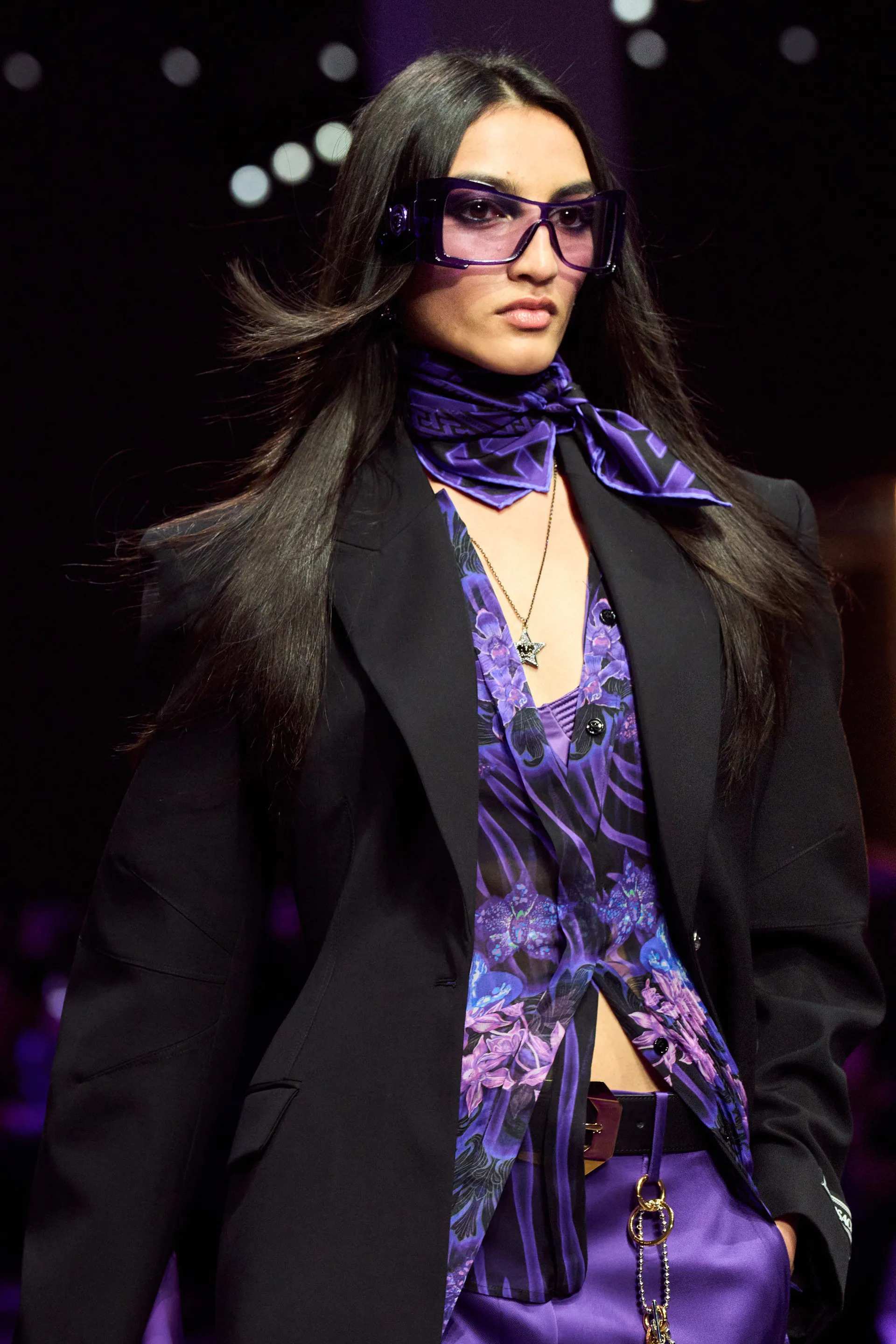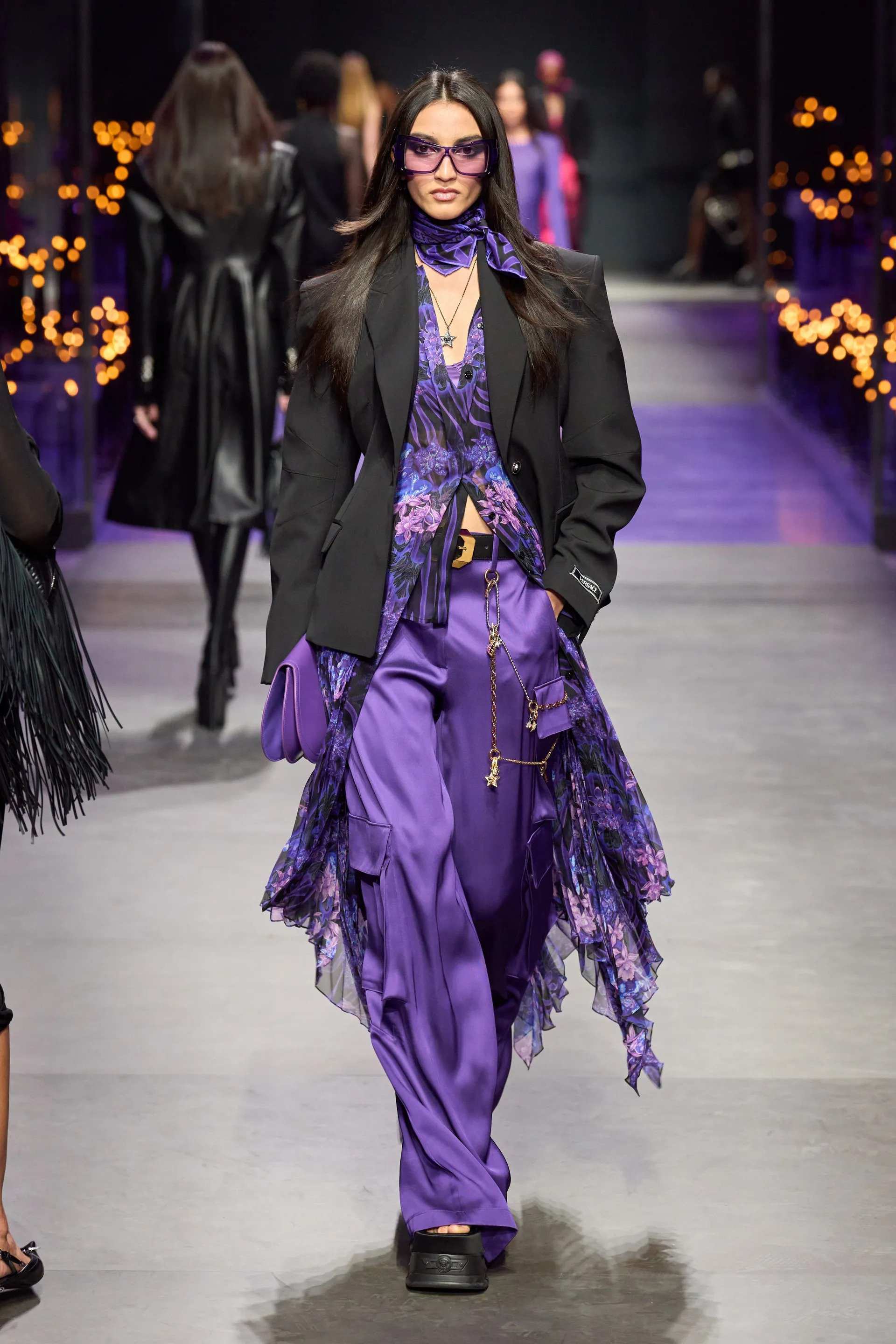 Sau đó chính là lúc sắc đen signature của Gothic nhường sân khấu cho gam sắc đỏ tía và tím Princely chủ đạo. Hai sắc màu này được đưa lên trực tiếp lên những chiếc váy dài, rủ tự nhiên với những thước lụa mềm mại, bồng bềnh với lớp voan mỏng, và cả những chiếc party dress nhỏ nhắn cùng nhiều biến thể từ cúp ngực, chiếc hông với nhiều tua rua những chiếc mũ trùm đầu nổi loạn. Ngoài những chiếc áo khoác da nổi loạn, Gothic dưới ngôn ngữ thời trang của Donatella còn có những chiếc áo lông quá cỡ - một điểm nhấn hoàn hảo cho cả tổng thể. Không còn corset hay những đôi tất chân dài, lần này Donatella tập trung hơn và thể hiện tham vọng của mình vào những chi tiết nhỏ được điêu khắc tỉ mỉ trên vải, từ phối hợp vải ren hài hòa với nền chất liệu khác đến những vết diamond-cut chính xác trên nền vải denim. Người xem còn thấy được dấu ấn của xu hướng thời trang hiện tại với dấu ấn từ texture popcorn thời thượng. Những đường cắt xẻ từ chân đến ngực váy kết hợp cùng những chiếc quần cargo bằng lụa cũng là một trong những dấu ấn mới được Versace lăng xê trong mùa này. Các bản in của mùa này cũng vô cùng đa dạng cùng các bản phối hòa hợp giữa loài hoa nhiệt đới, sọc ngựa vằn và tên viết hoa của thương hiệu.