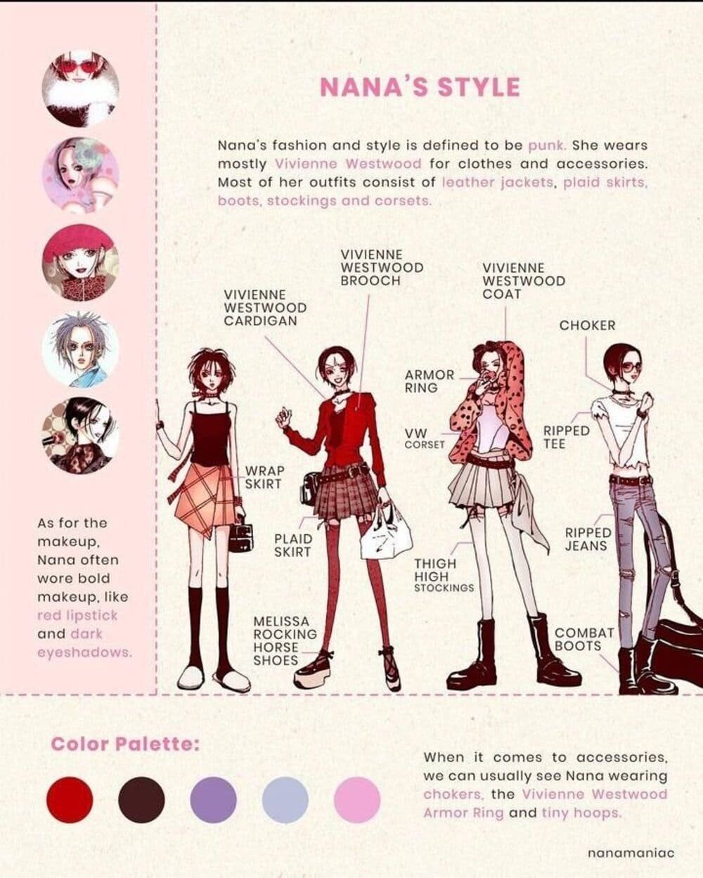 Để hiểu cách Yazawa Ai khắc hoạ nhân vật Nana Osaki qua ngôn ngữ thời trang của Vivienne Westwood, trước hết ta cần xác định cô là ai trong thế giới truyện NANA. Nana Osaki là một cô gái cứng rắn, mạnh mẽ, yêu thích punk rock và đặc biệt hâm mộ ban nhạc Sex Pistols. Cô thường xuất hiện với kiểu tóc ngắn vuốt gọn, làn da trắng bóc, makeup mắt khói và đôi môi đỏ thẫm. Nana trở thành giọng ca chính của nhóm nhạc underground punk-rock Black Stones khi mới 16 tuổi. Sau bốn năm hoạt động, ban nhạc đứng trên bờ vực tan rã khi trưởng nhóm, cũng là bạn trai cô - Ren Honjo được mời lên Tokyo để gia nhập nhóm nhạc nổi tiếng hơn mang tên Trapnest. Từ chối đi cùng bạn trai, Nana chọn ở lại đồng hành cùng ban nhạc cũ. Không lâu sau đó, cô cùng ban nhạc chuyển đến Tokyo để tìm kiếm cơ hội phát triển sự nghiệp. Tuy luôn tỏ ra mạnh mẽ, sự rời đi của Ren khiến Nana một lần nữa đối mặt với nỗi sợ bị bỏ rơi trong quá khứ - khi cô bị chính mẹ ruột ruồng bỏ.