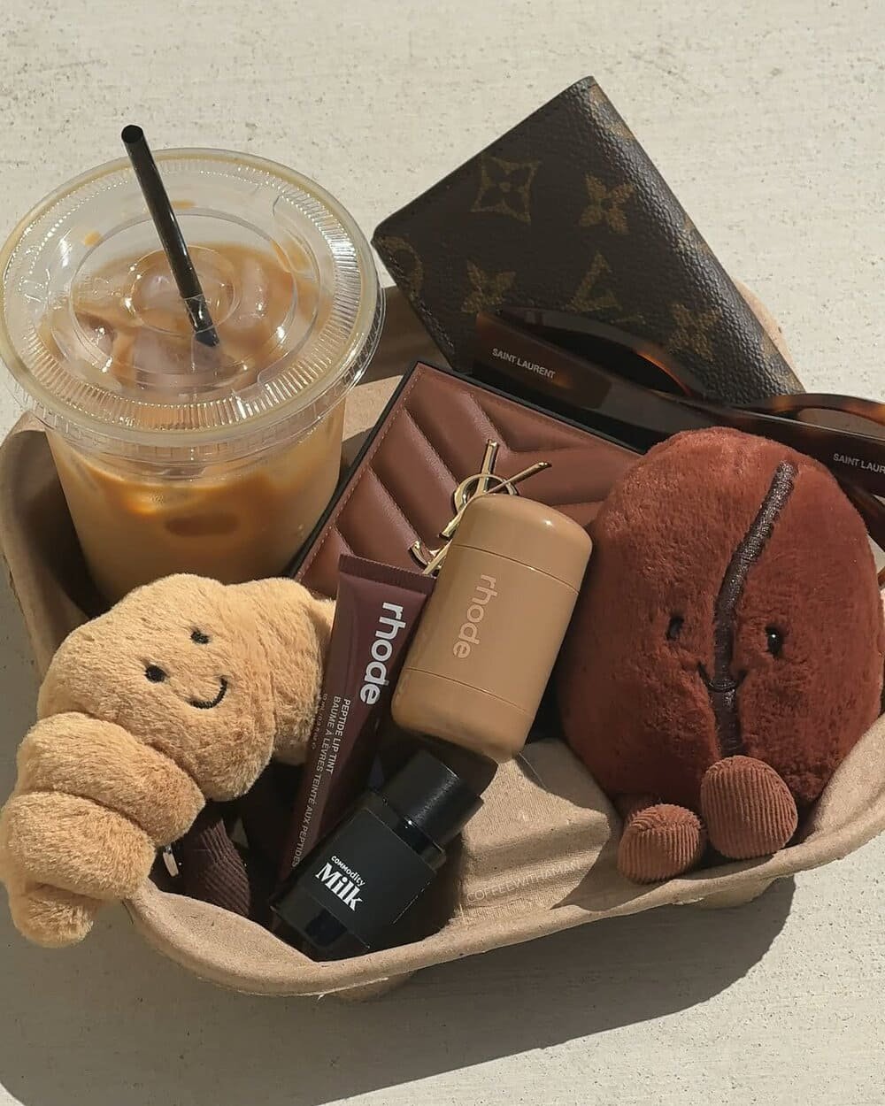 Một trào lưu chụp ảnh khác chính là Coffee tray trend: tận dụng khay giấy thường thấy khi mua cà phê mang đi, đặt lên đó một ly đồ uống rồi xếp thêm đủ loại mỹ phẩm như son môi, thỏi dưỡng ẩm, serum, nước hoa… thậm chí cả những món đồ chơi nhỏ xinh. Nếu cầu kỳ hơn, bạn có thể chọn các món đồ cùng tông màu để khi chụp lên, bức ảnh trông tinh tế và đẹp mắt hơn.