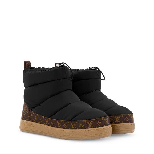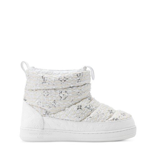 Những thiết kế mang tinh thần năng động như Speedy và High Raise belt bag được thể hiện trong chất liệu nylon mô phỏng denim, vừa phù hợp cho những chuyến đi trượt tuyết, vừa có thể đồng hành trong không gian đô thị. Phụ kiện đi kèm như boot Cortina hay LV Cloud boots tiếp tục duy trì ngôn ngữ thiết kế nhất quán, sử dụng da lộn và shearling cùng họa tiết hoa Monogram trên phần đế, tạo nên vẻ đẹp cân bằng giữa tinh thần thể thao và tính couture hiện đại.