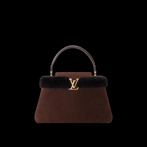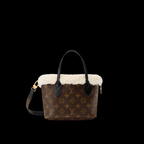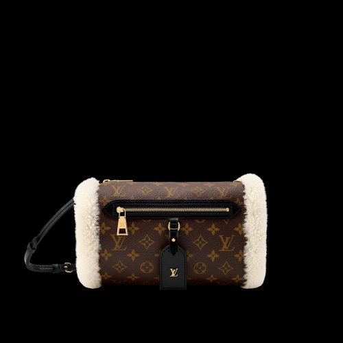 Các thiết kế Capucines và Neverfull Inside Out BB được phủ shearling mềm mịn với tông màu chocolate và beige, mang lại cảm giác gần gũi mà vẫn sang trọng. Bên cạnh đó, mẫu Teddy Muff kết hợp giữa Monogram canvas và lông cừu merino cho thấy cách Louis Vuitton thử nghiệm cấu trúc vật thể trong thời trang.