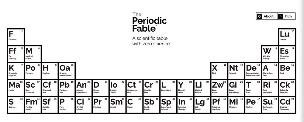 Chiến dịch mới nhất của The Ordinary The Periodic Fable lấy cảm hứng từ bảng tuần hoàn nguyên tố hoá học. Bằng cách chơi chữ từ “table” (bảng) thành “fable” (hoang đường), thương hiệu muốn chỉ ra những thuật ngữ “giả khoa học” thường được các nhãn hàng sử dụng để bán sản phẩm nhưng không thực sự mang lại hiệu quả.