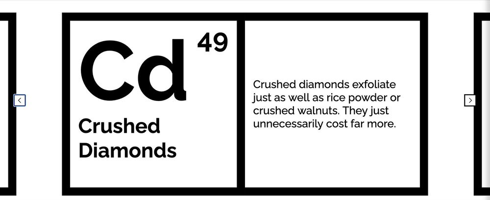 Một trào lưu khác mà The Ordinary thẳng thắn chỉ trích trong chiến dịch The Periodic Fable là việc sử dụng vụn kim cương (crushed diamonds) trong các sản phẩm làm đẹp cao cấp - từ kem dưỡng, serum đến mặt nạ.