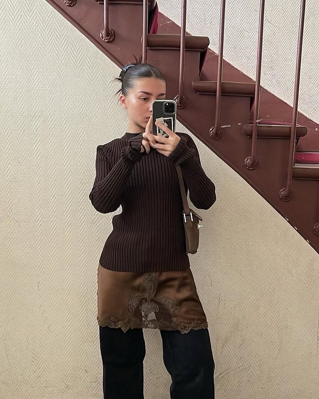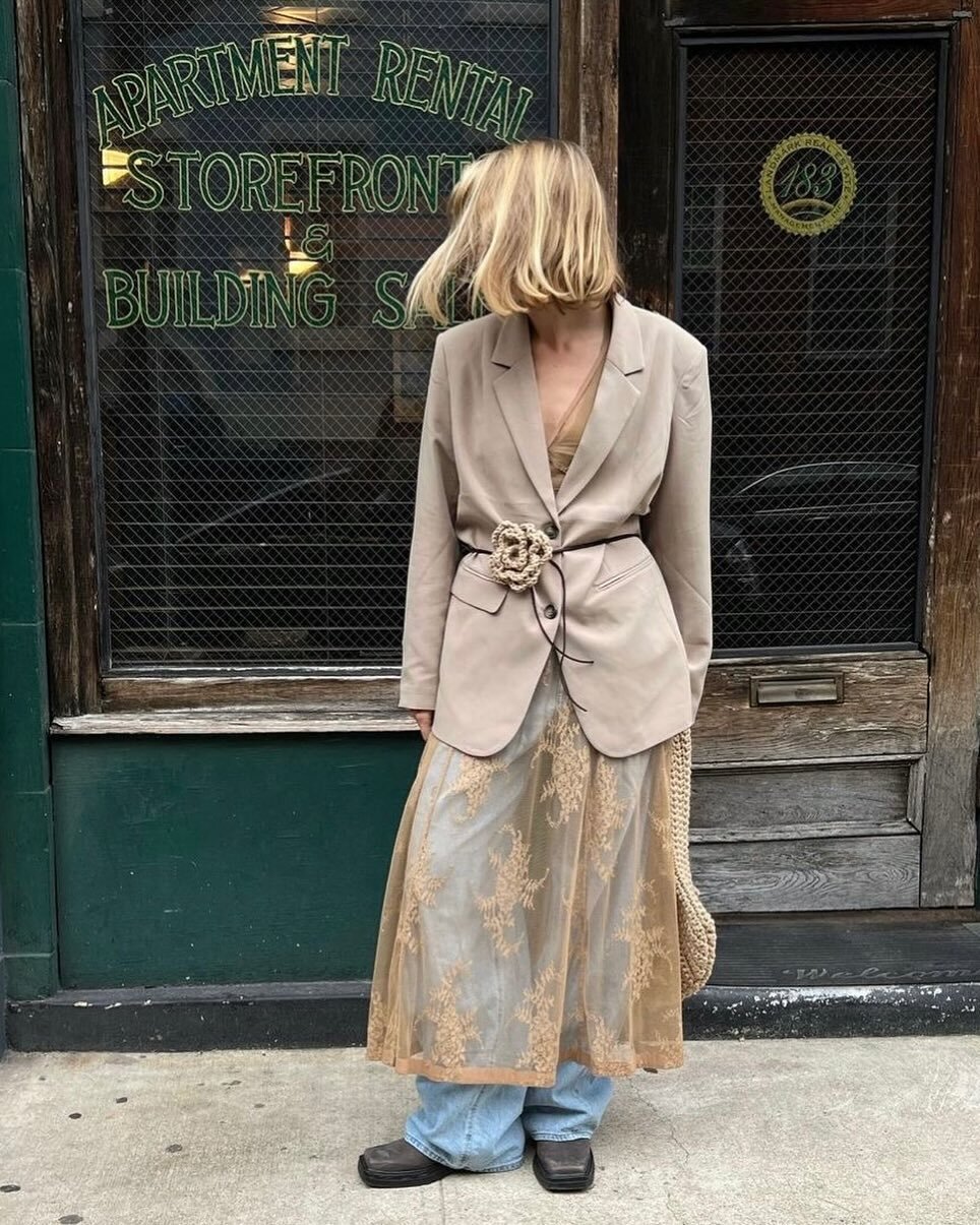 Để skant không bị rối mắt, hãy chọn lớp váy phủ bằng chất liệu mềm rủ như sheer, linen nhẹ hoặc lụa mờ. Độ dài lý tưởng là ngang đùi hoặc gối, đủ để tạo chuyển động nhưng không nuốt dáng. Quần bên trong nên là quần ống thẳng hoặc culottes gọn, tránh phối với dáng baggy. Nếu skant có bất đối xứng, càng tốt – sự lệch pha luôn khiến ánh nhìn ở lại lâu hơn.