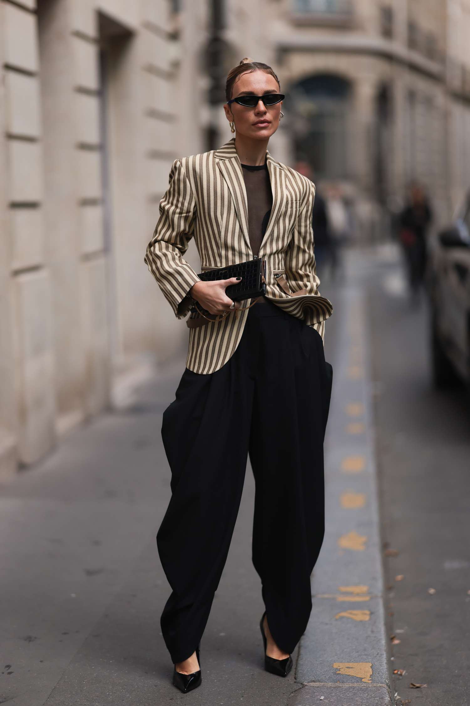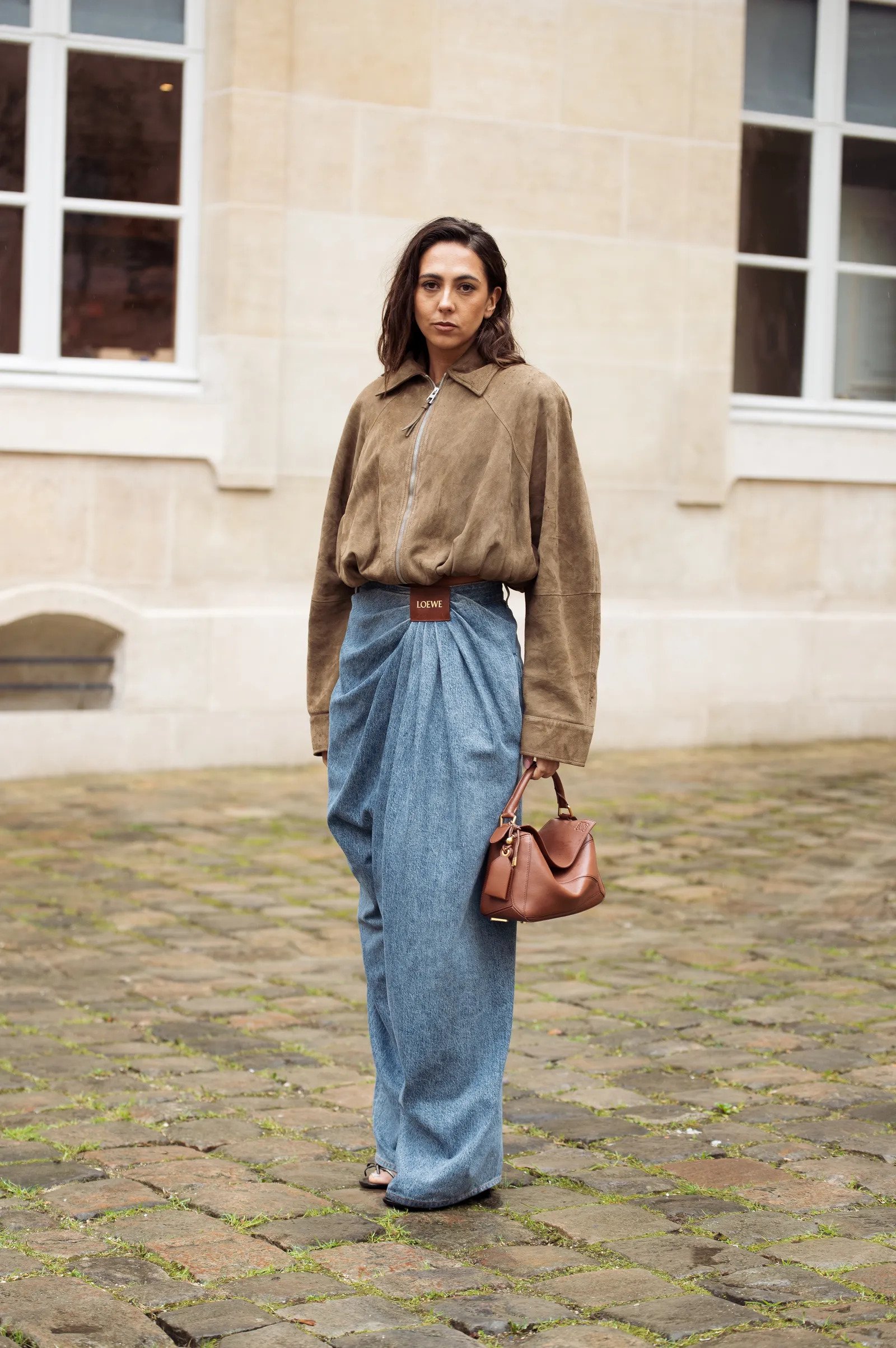 Tỉ lệ rất quan trọng: hãy để phần phồng là điểm nhấn duy nhất. Một chiếc balloon màu kem đi với áo ống đen, hoặc áo thun trắng basic nhét thùng. Nếu muốn tạo sự chuyển mùa cho Thu Đông, hãy thử chất liệu len mỏng hoặc nhung ép, đi cùng áo da lửng ôm dáng. Giày nên là pointed-toe để kéo dài chân, tránh mọi kiểu chunky sneakers dễ khiến phần dưới trở nên nặng nề.