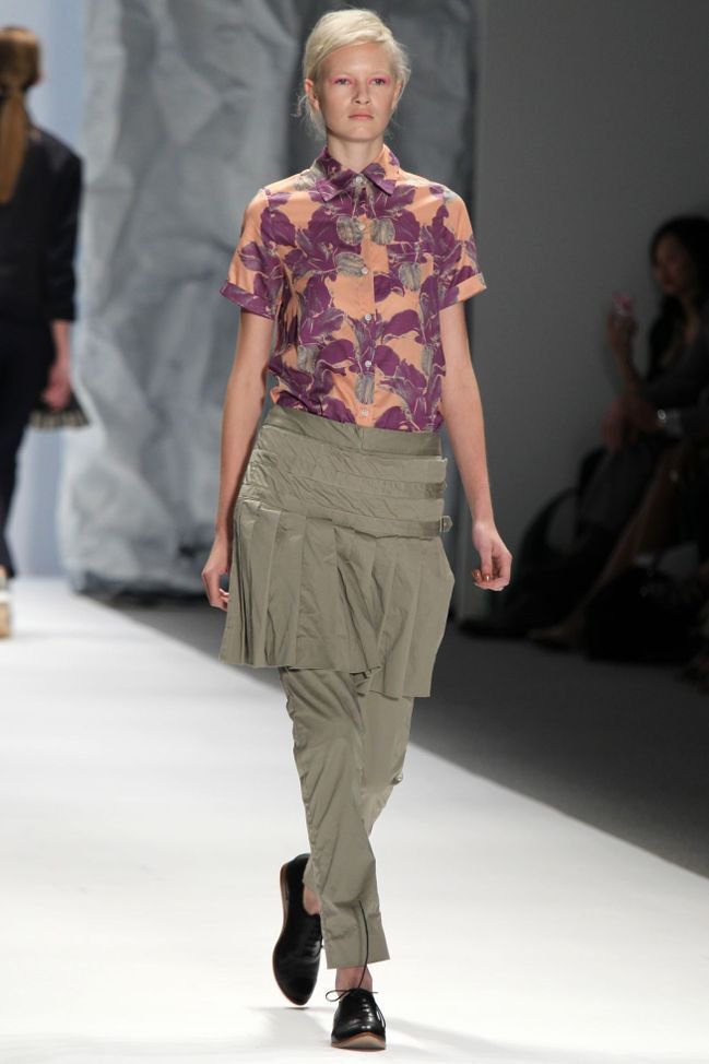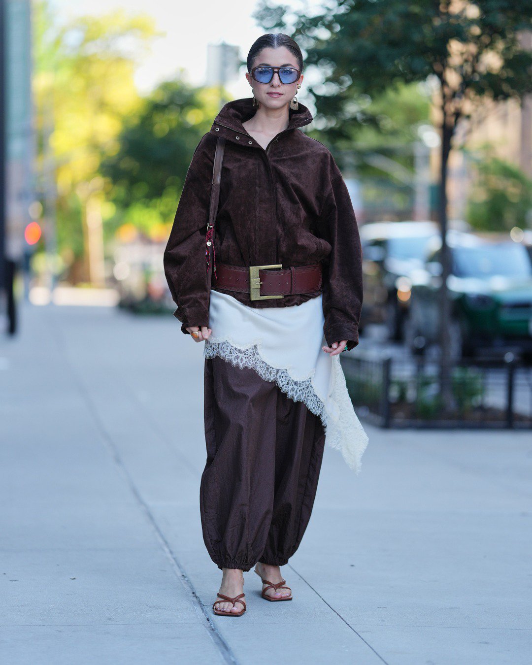 Skant – từ ghép giữa “skirt” và “pant” – là sự lai tạo phá vỡ chuẩn mực giới, nơi cấu trúc quần và váy không còn thuộc về một hệ phân loại. Rick Owens từng gợi mở xu hướng này từ nhiều mùa trước, nhưng đến 2025, skant thực sự bùng nổ. Vogue đã mô tả skant là “transseasonal item (món đồ giao mùa) hoàn hảo” khi nói về bộ cánh Jennifer Lawrence mặc: một chiếc quần suông hải quân được phủ bởi lớp overskirt mỏng như sương. Sự kết hợp giữa phom quần cơ bản và lớp váy phủ ngoài tạo nên một chuyển động chậm, mềm, vừa như che giấu, vừa như mời gọi.