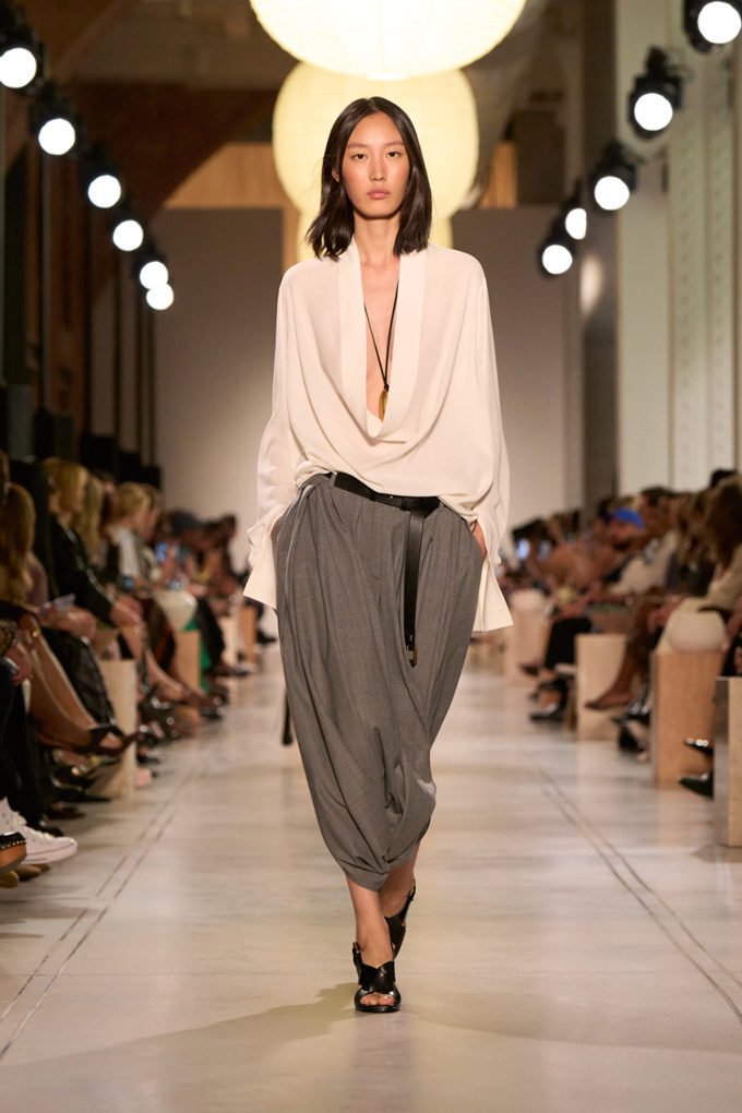 Đến mùa Xuân Hè 2026, xu hướng này không hề có dấu hiệu hạ nhiệt. Michael Kors trình làng những chiếc quần phồng dáng lửng phối cùng áo blouse trắng và thắt lưng bản to – một hình ảnh gợi nhớ tới thời trang thập niên 80 nhưng được tinh chỉnh để trở nên thanh lịch và dễ ứng dụng hơn. Trong khi đó, Altuzarra chọn phiên bản chất liệu linen thô, màu sắc đậm chất địa trung hải và phần gấu quần bó nhẹ, mang cảm giác du mục nhưng đầy tính đô thị. “Tôi thích sự nghịch lý của quần balloon – phom dáng thoải mái nhưng lại rất có chủ đích, như một tuyên bố ngầm về quyền kiểm soát," Joseph Altuzarra chia sẻ sau show diễn.